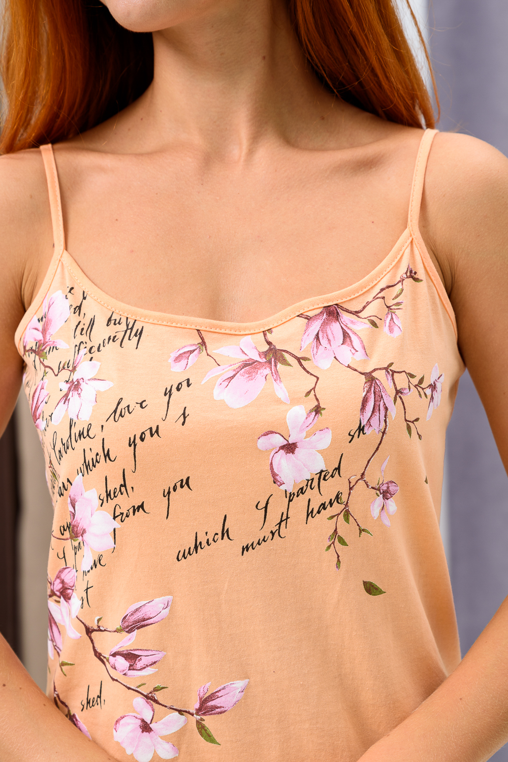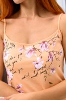Сорочка на бретелях полуприлегающего силуэта, с фигурной линией низа, длиной выше колена. На полочке внизу обработан декоративный разрез. Проймы, бретели и разрез на полочке обработаны бейкой из основного полотна.