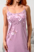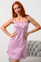 Сорочка на бретелях полуприлегающего силуэта, с фигурной линией низа, длиной выше колена. На полочке внизу обработан декоративный разрез. Проймы, бретели и разрез на полочке обработаны бейкой из основного полотна.