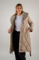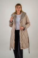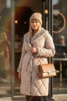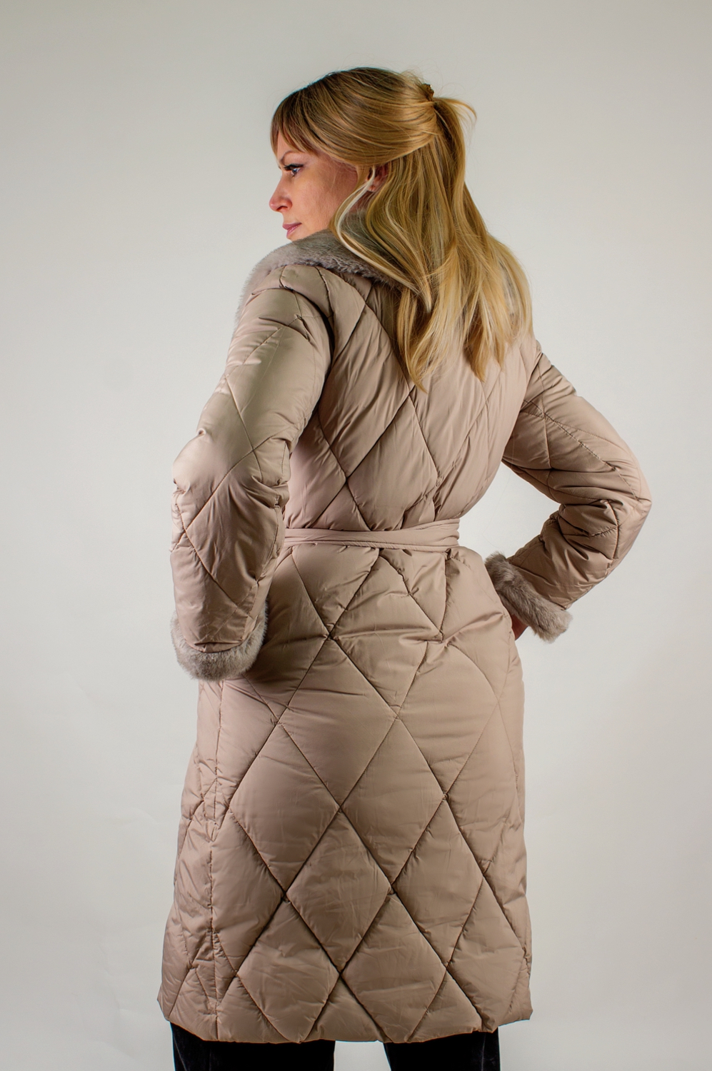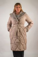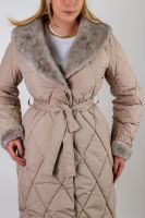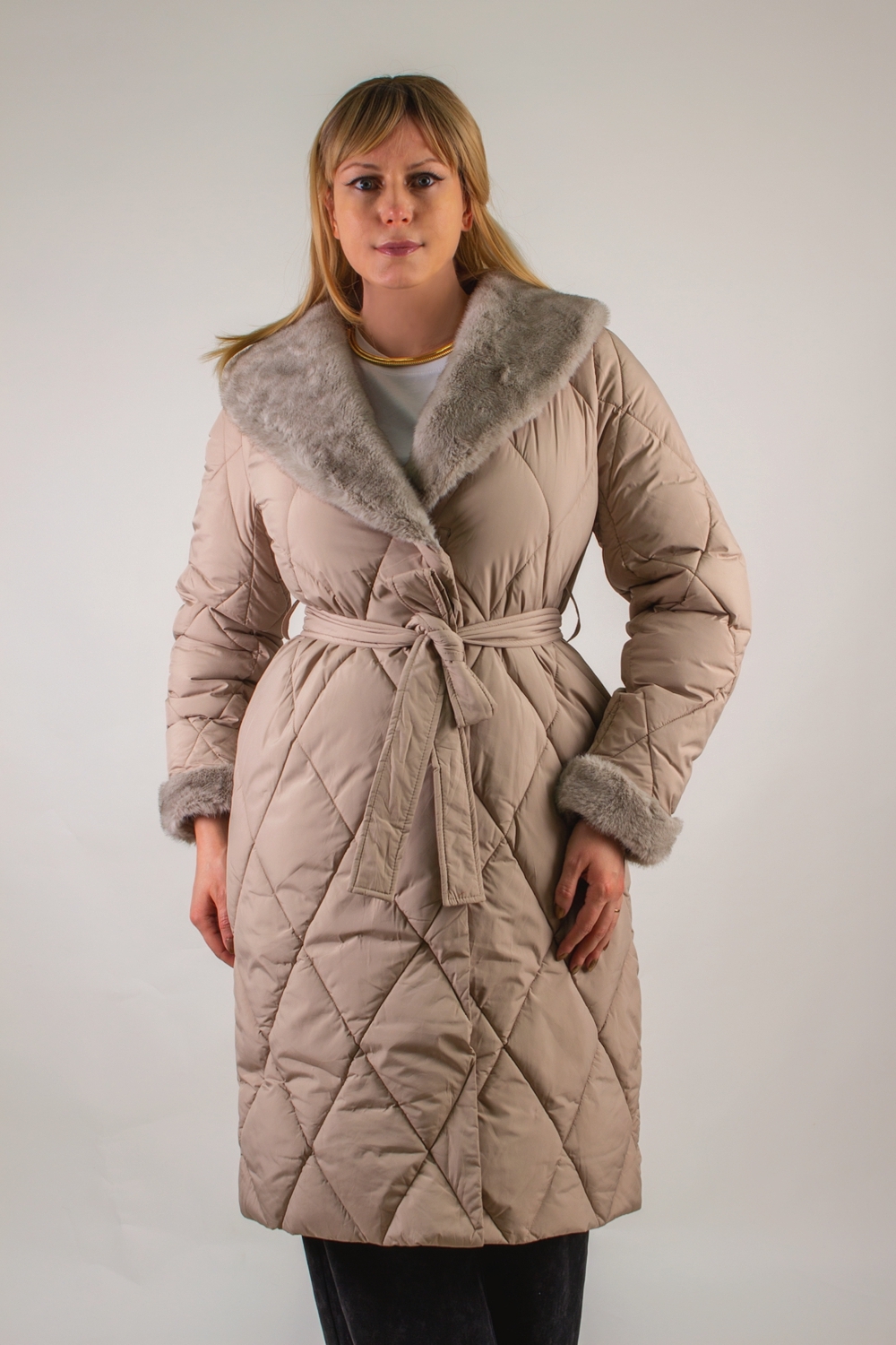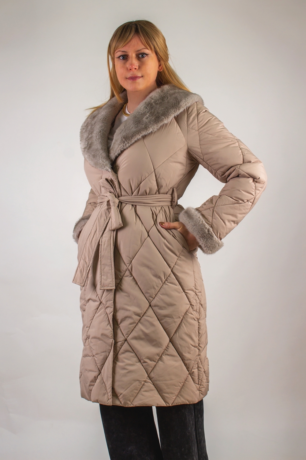 Стеганое пальто с меховой отделкой арт. 23153, евро-зима, демисезон. – это сочетание утончённого городского стиля и продуманной функциональности. Модель с утеплителем оптимальной плотности, что позволяет комфортно чувствовать себя при температурах до –10°С . Демисезонная адаптивность делает пальто универсальным решением для межсезонья, когда погода переменчива. Верх выполнен из износостойкого полиэстера с водоотталкивающей пропиткой, сохраняющей лёгкость и не дающей влаге скапливаться на поверхности. Диагональная стёжка «ромбом» равномерно распределяет наполнитель, предотвращая холодные зоны и деформацию изделия после стирок. Модель легко стирается в деликатном режиме, не теряя формы и цвета. Отложной воротник и отделка манжет декорированы искусственным мехом серого оттенка «под норку», придающим акцент и уютный объём у лица и на рукавах. Такой приём не просто украшает изделие, но и защищает от ветра и холода. Трикотажные рукава на манжетах обеспечивают свободу движений и создают дополнительный тепловой барьер. Пальто застёгивается на двухзамковую молнию с защитной планкой на кнопках – конструкция надёжна, удобна в эксплуатации и защищает от продувания. Акцентным дополнением служит съёмный пояс в тон, подчёркивающий линию талии и создающий изящный силуэт «песочные часы». По бокам расположены два скрытых кармана-листочки с застёжками-кнопками, чтобы ценные мелочи и смартфон всегда были под рукой. Бежевый оттенок фасона универсален: он гармонирует с яркими и нейтральными образами, легко комбинируется с шарфами, шапками и обувью любого стиля. Это пальто станет вашим верным спутником в городе и на загородных прогулках, обеспечивая комфорт и безупречный внешний вид. Арт. 23153 — выбор современных женщин, ценящих качество, тепло и элегантность в каждой детали.