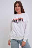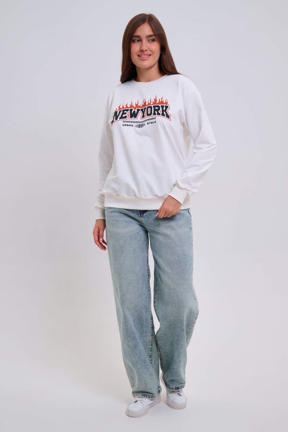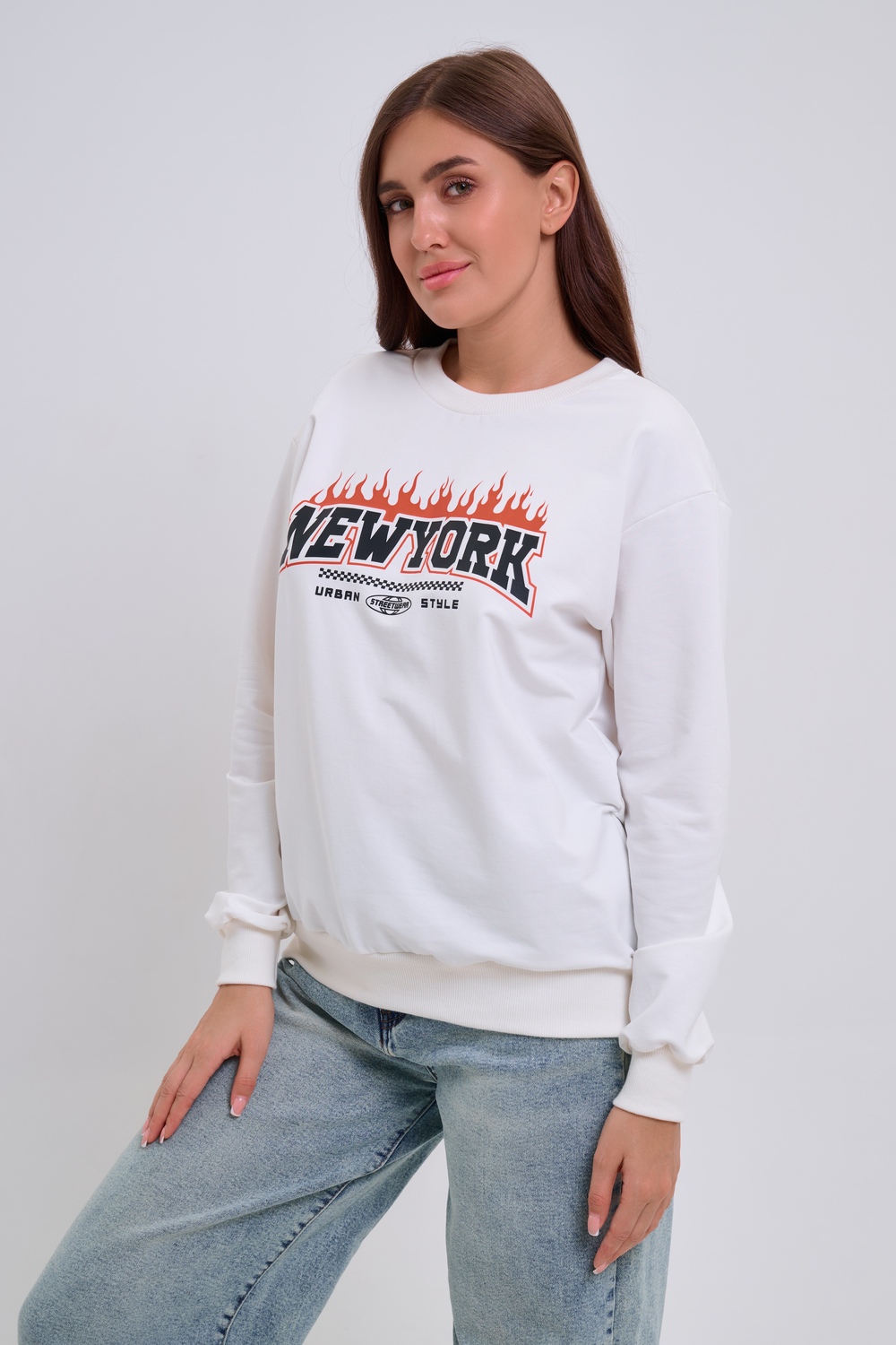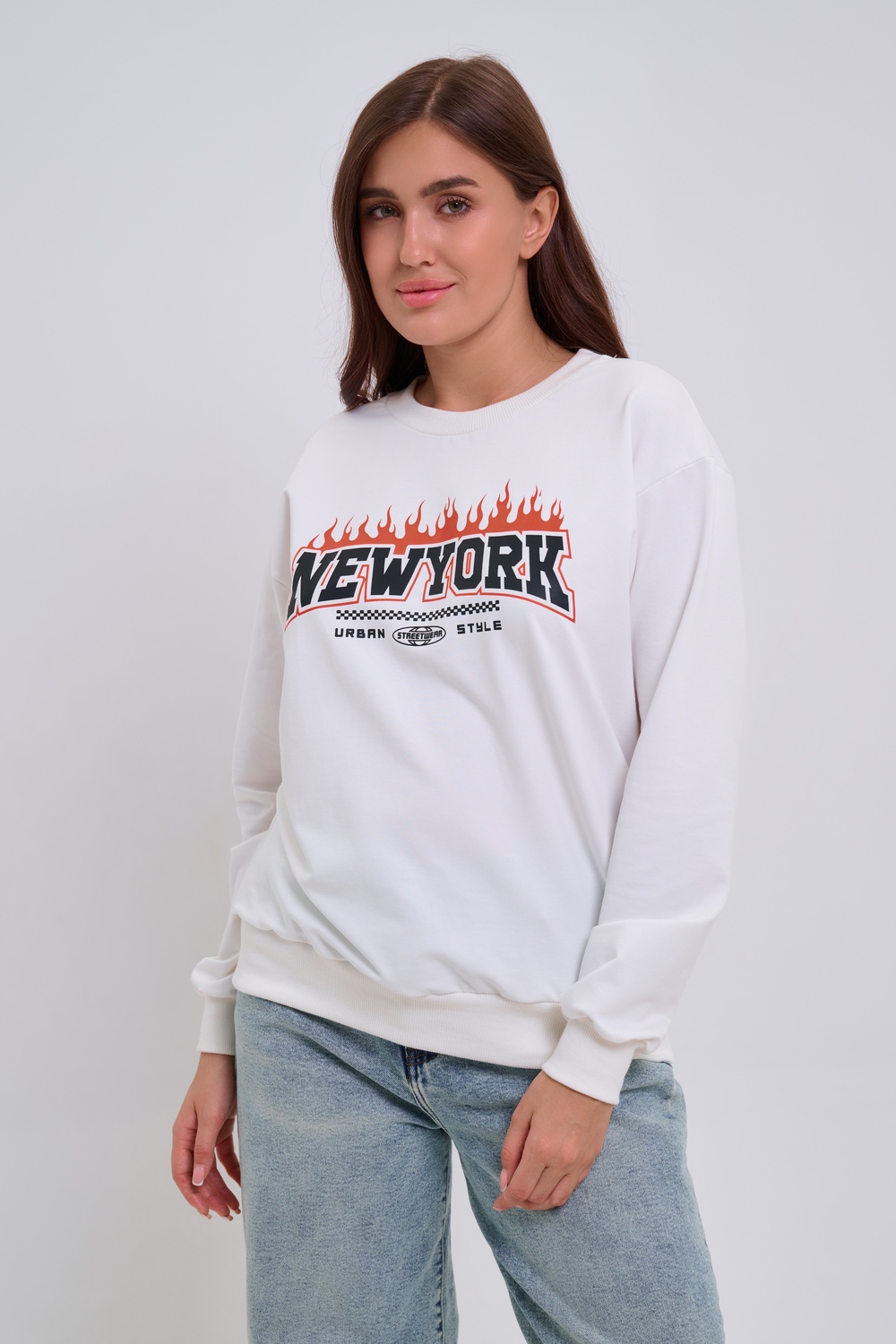 Женский свитшот свободного прямого кроя с круглой горловиной и слегка приспущенными плечами. Спереди нанесён принт в виде надписи "NEW YORK". Выполнен из мягкого и приятного материала — футера 2-х нитки, обеспечивающего дополнительный комфорт и сохранение тепла даже в холодную погоду. Доступен в сдвоенных размерах, что удобно для подбора идеальной посадки. Подходит как для повседневной носки, так и для создания эффектных образов в любом стиле.
