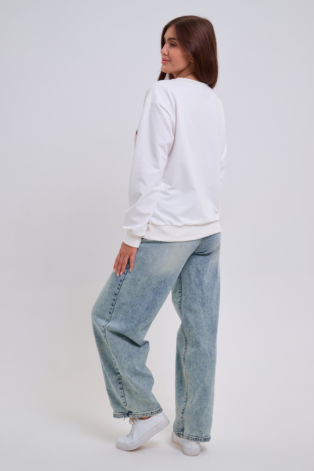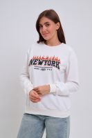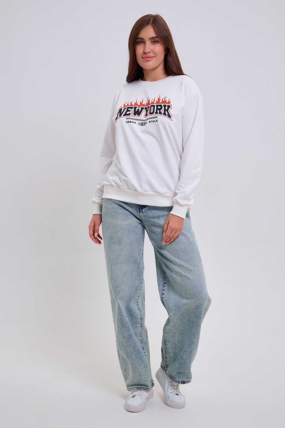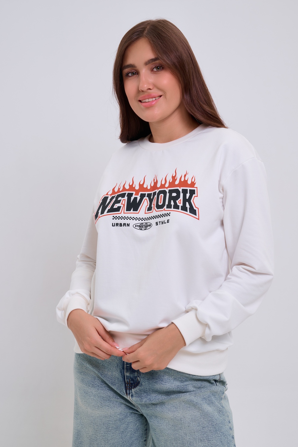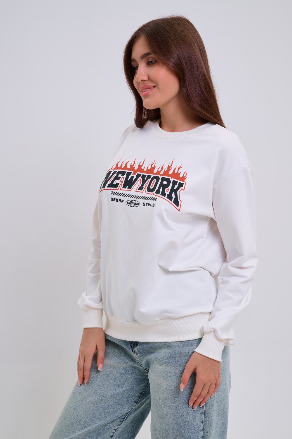Женский свитшот свободного прямого кроя с круглой горловиной и слегка приспущенными плечами. Спереди нанесён принт в виде надписи "NEW YORK". Выполнен из мягкого и приятного материала — футера 2-х нитки, обеспечивающего дополнительный комфорт и сохранение тепла даже в холодную погоду. Доступен в сдвоенных размерах, что удобно для подбора идеальной посадки. Подходит как для повседневной носки, так и для создания эффектных образов в любом стиле.