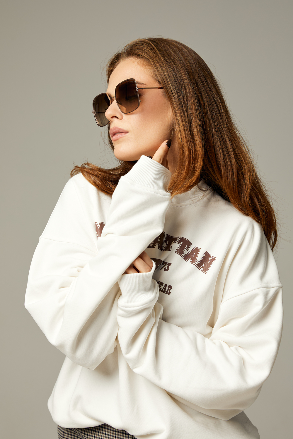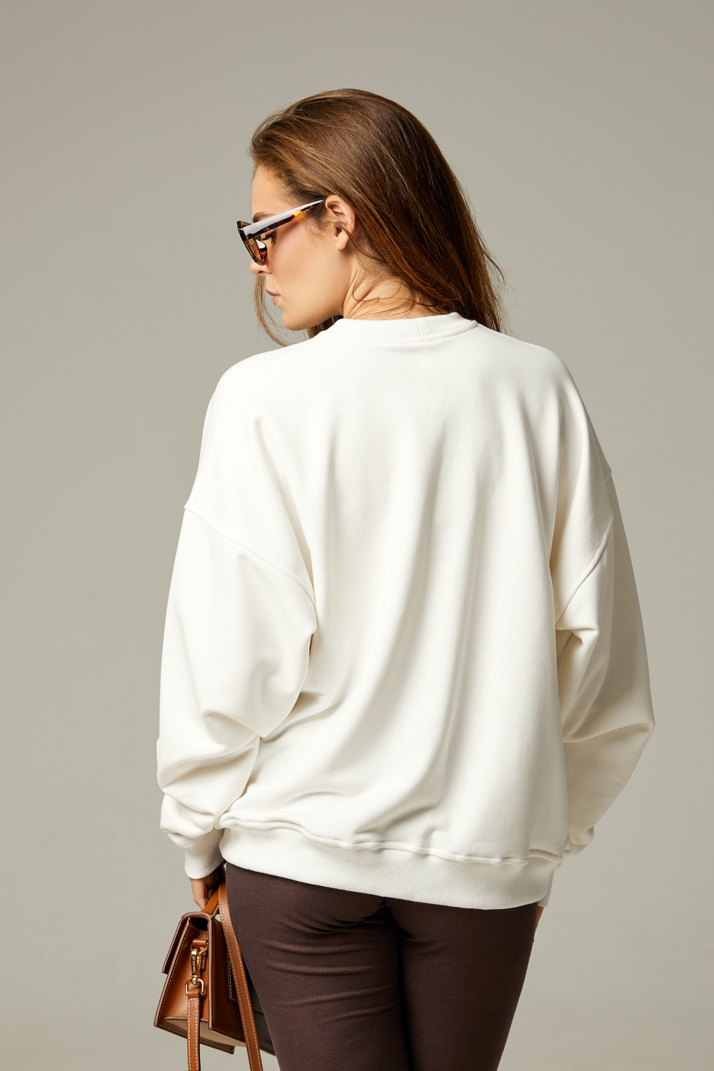 Свитшот с оригинальным принтом, сотканный из ткани премиального качества, словно мягкое объятие, согреет в прохладные дни. Женский свитшот oversize – это чистый холст для вашего воображения, гармонично вписывающийся в любой ансамбль. Дополните его дерзкими аксессуарами: массивными серьгами, экстравагантной сумкой, чтобы раскрыть грани своей индивидуальности и создать образ, уникальный, как отпечаток пальца. Толстовка женская оверсайз – это ваш пропуск в мир непринужденного шика, где уют и стиль переплетаются в едином танце, рождая образ вне времени и трендов.
