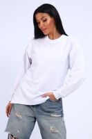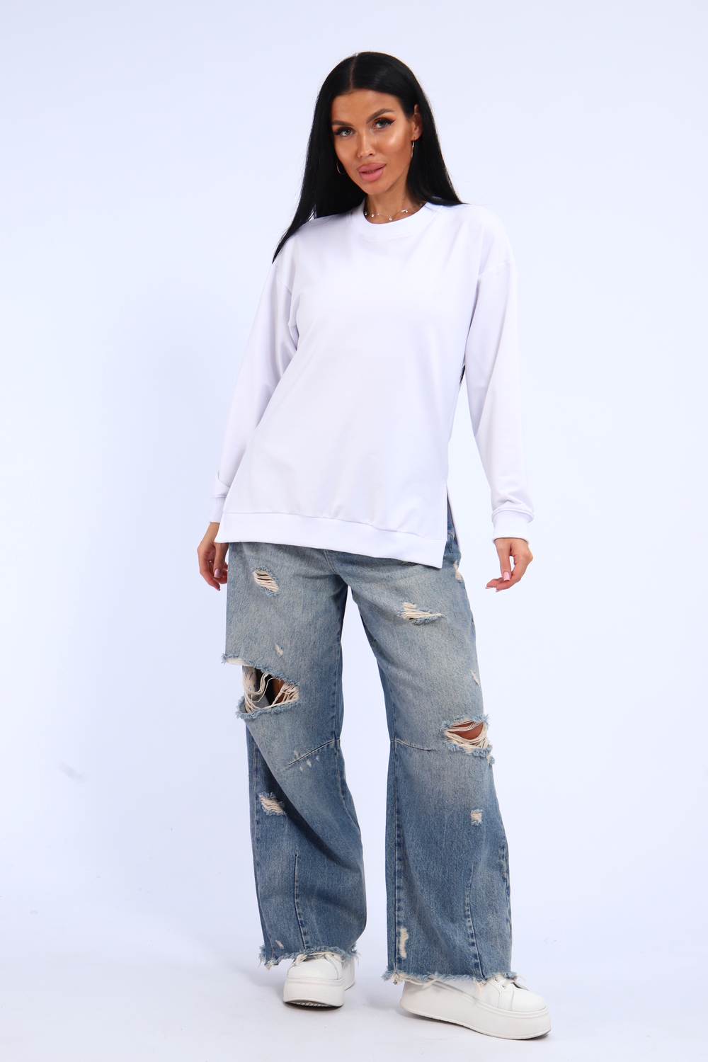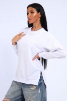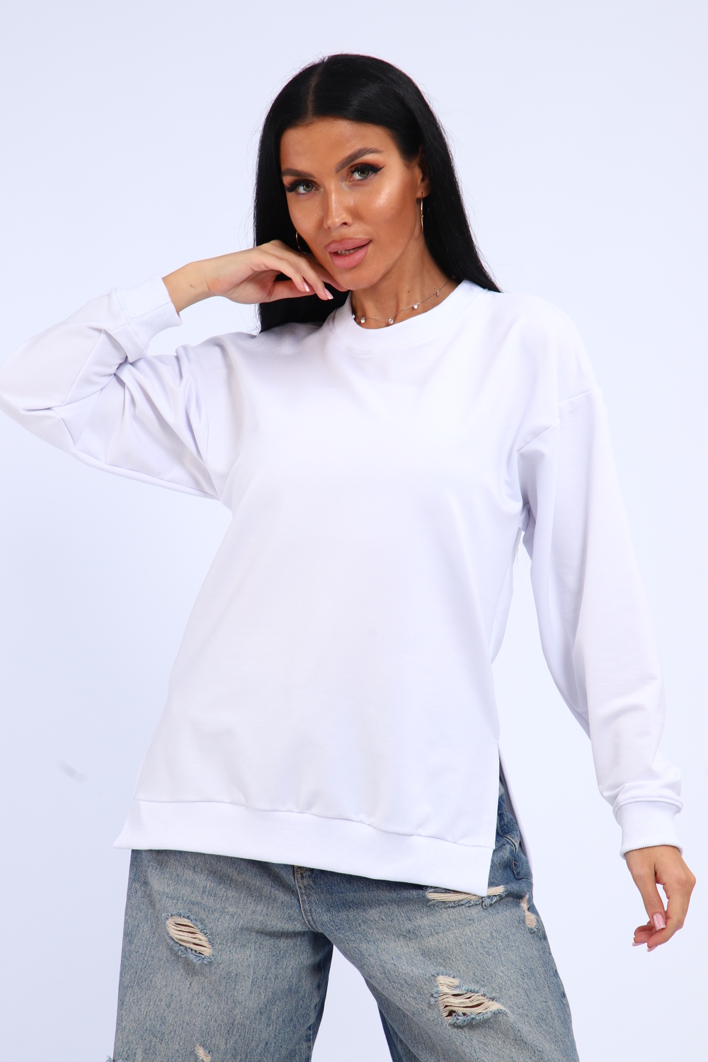 Свитшот женский свободного кроя, в боковых швах разрезы. Спинка удлиненная.