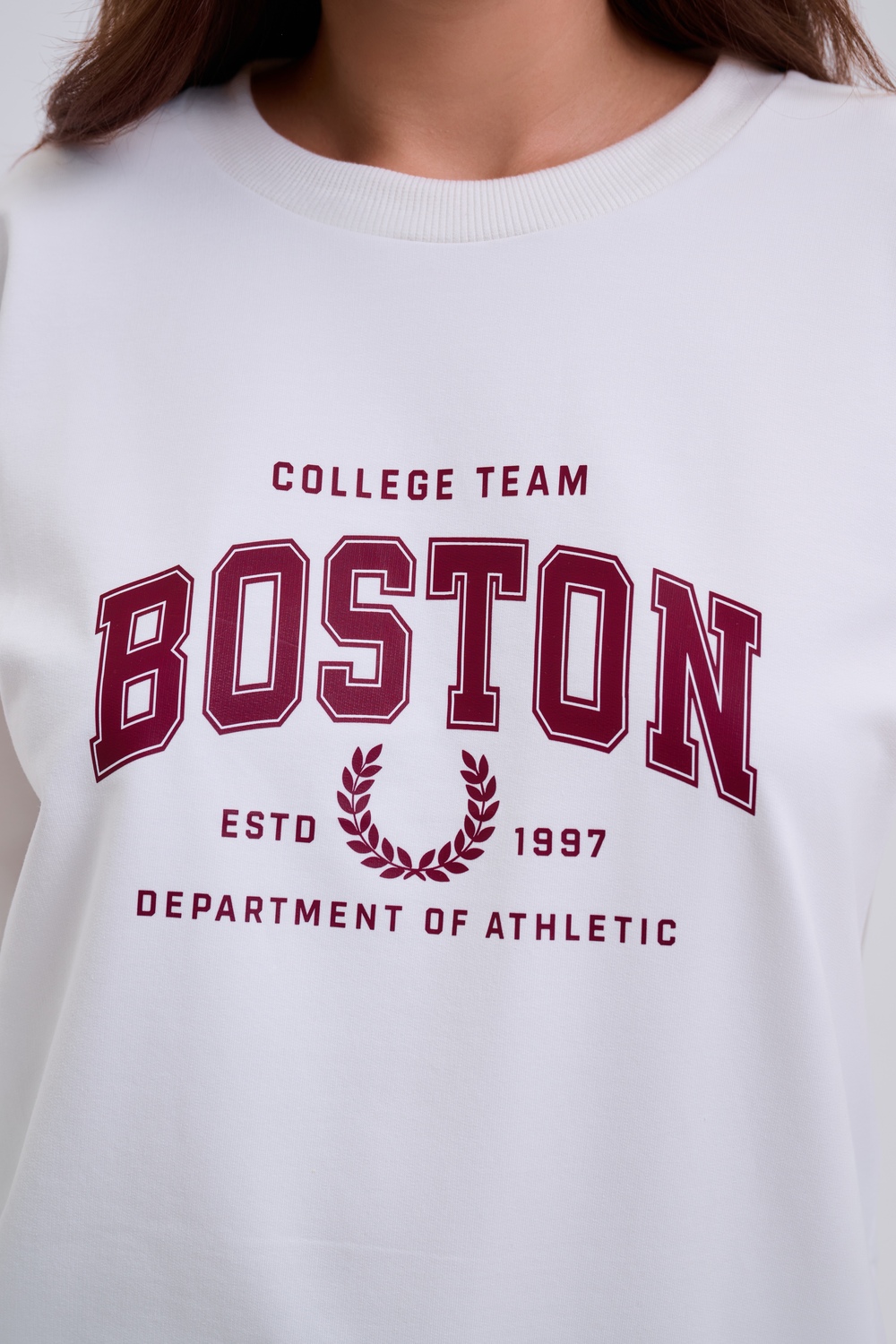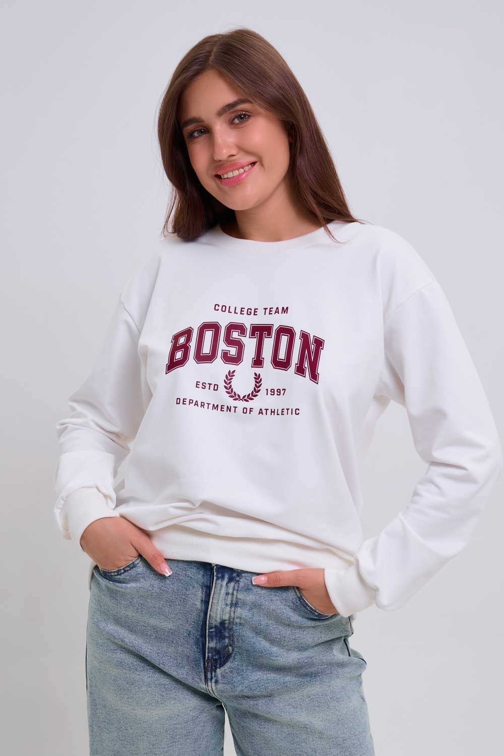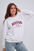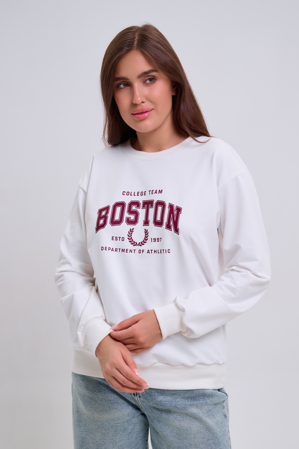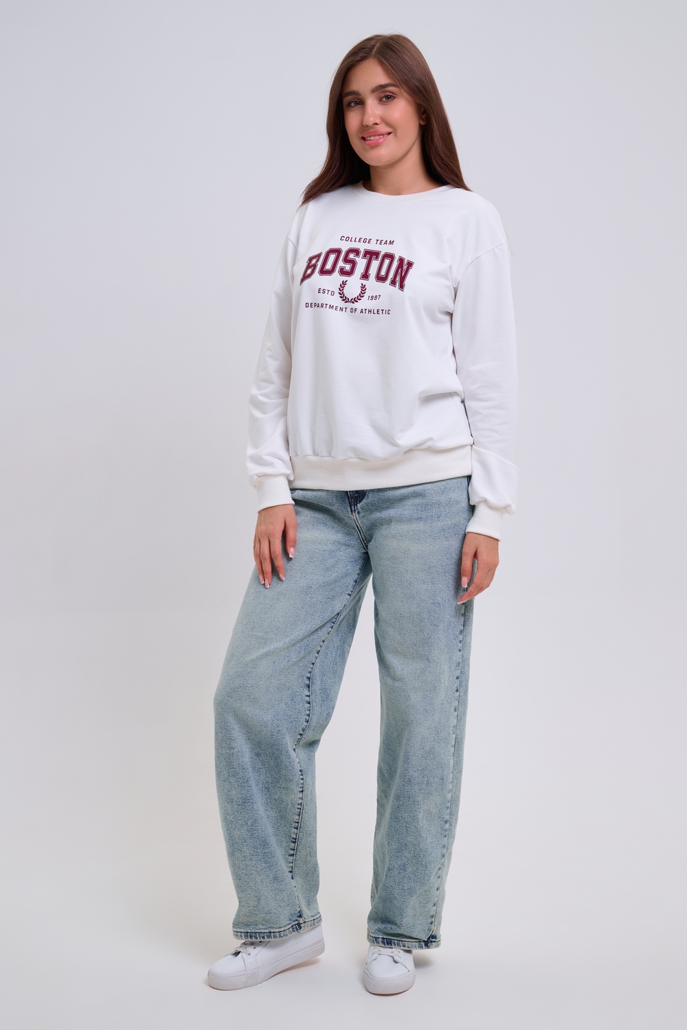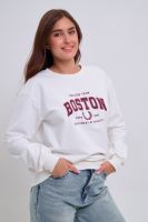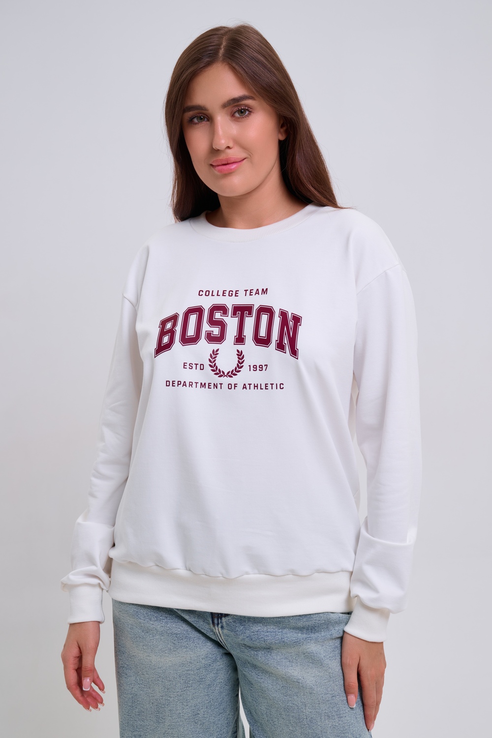 Женский свитшот свободного прямого кроя с круглой горловиной и слегка приспущенными плечами. Спереди нанесён принт в виде надписи "Boston". Выполнен из мягкого и приятного материала — футера 2-х нитки, обеспечивающего дополнительный комфорт и сохранение тепла даже в холодную погоду. Доступен в сдвоенных размерах, что удобно для подбора идеальной посадки. Подходит как для повседневной носки, так и для создания эффектных образов в любом стиле.