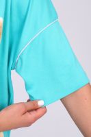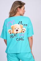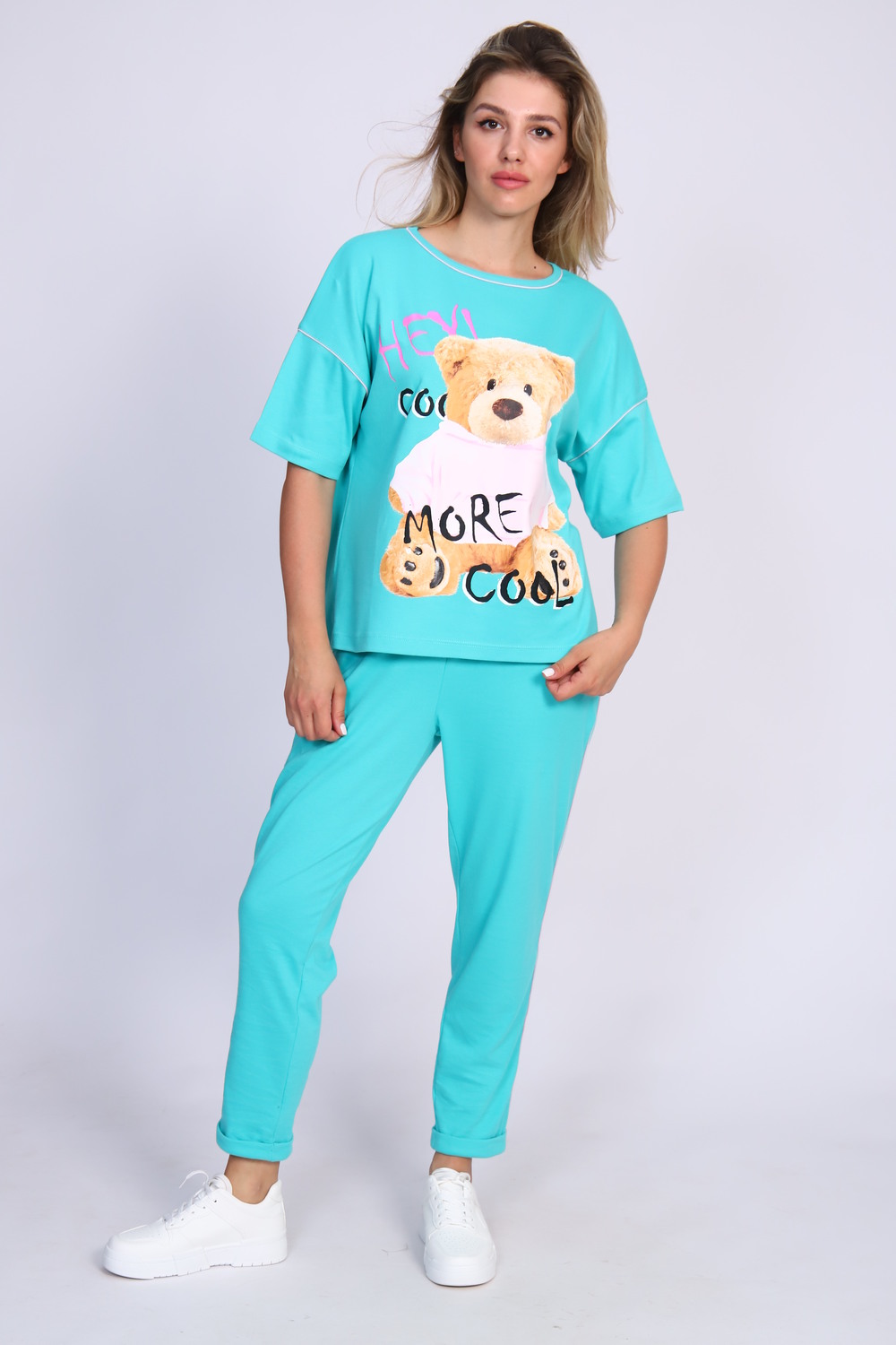Милая пижама состоящая из футболки и брюк свободного силуэта. Футболка с отделкой кантом по горловине и рукаву, и печатью в стиле шелкографии на полочке и спинке. Зауженные брюки на резинке с карманами, имеют внизу манжет.