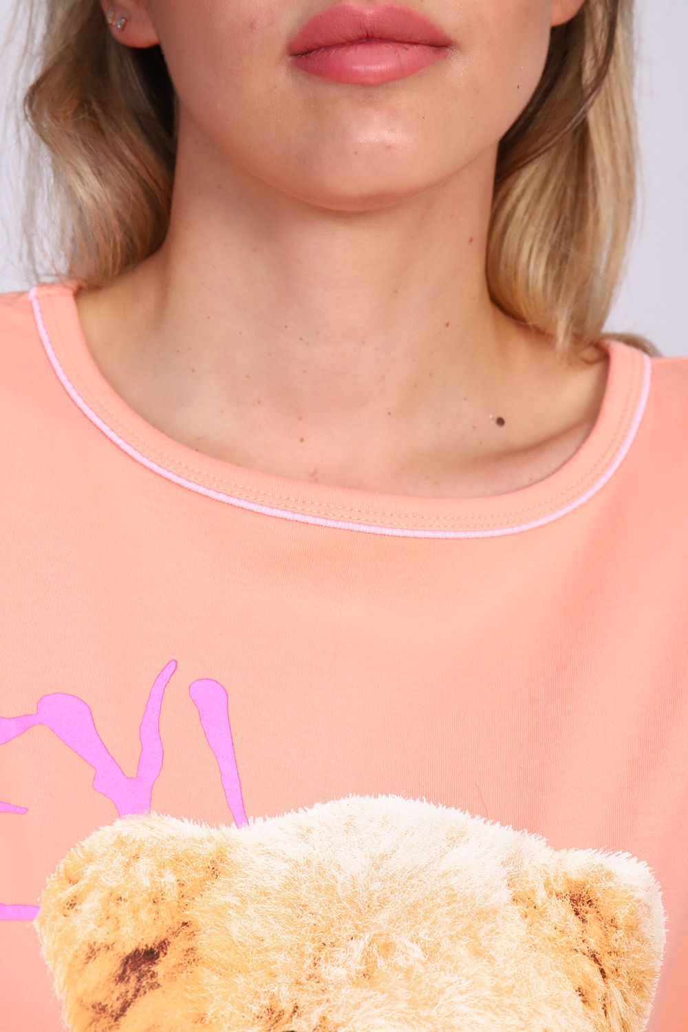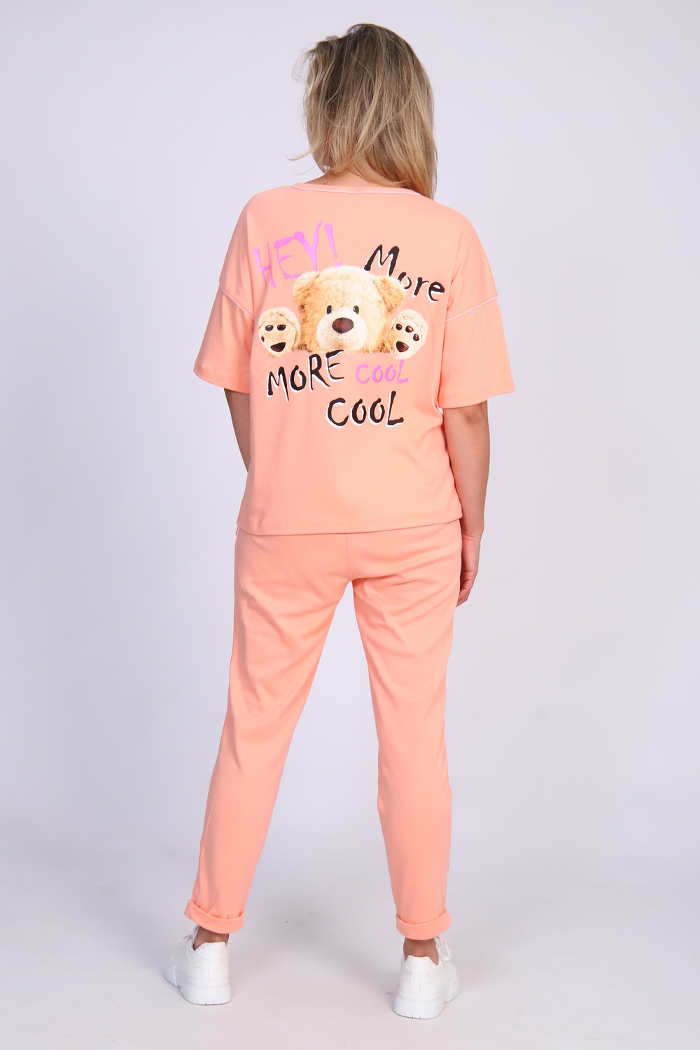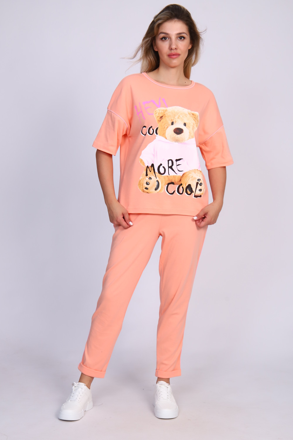 Милая пижама состоящая из футболки и брюк свободного силуэта. Футболка с отделкой кантом по горловине и рукаву, и печатью в стиле шелкографии на полочке и спинке. Зауженные брюки на резинке с карманами, имеют внизу манжет.
