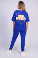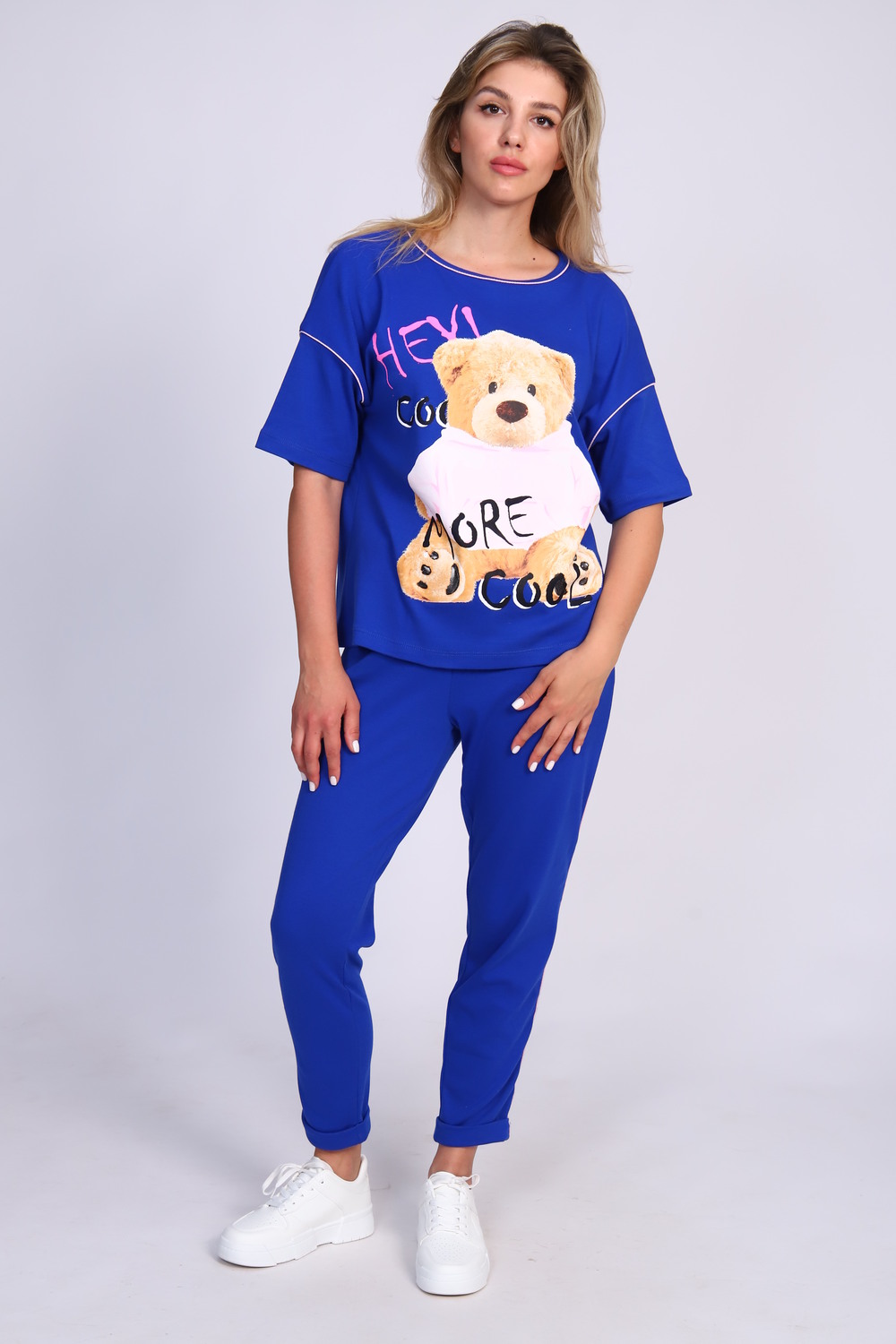 Милая пижама состоящая из футболки и брюк свободного силуэта. Футболка с отделкой кантом по горловине и рукаву, и печатью в стиле шелкографии на полочке и спинке. Зауженные брюки на резинке с карманами, имеют внизу манжет.