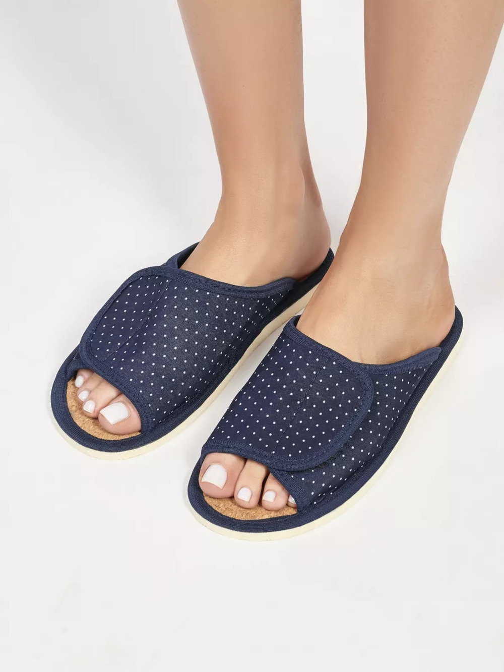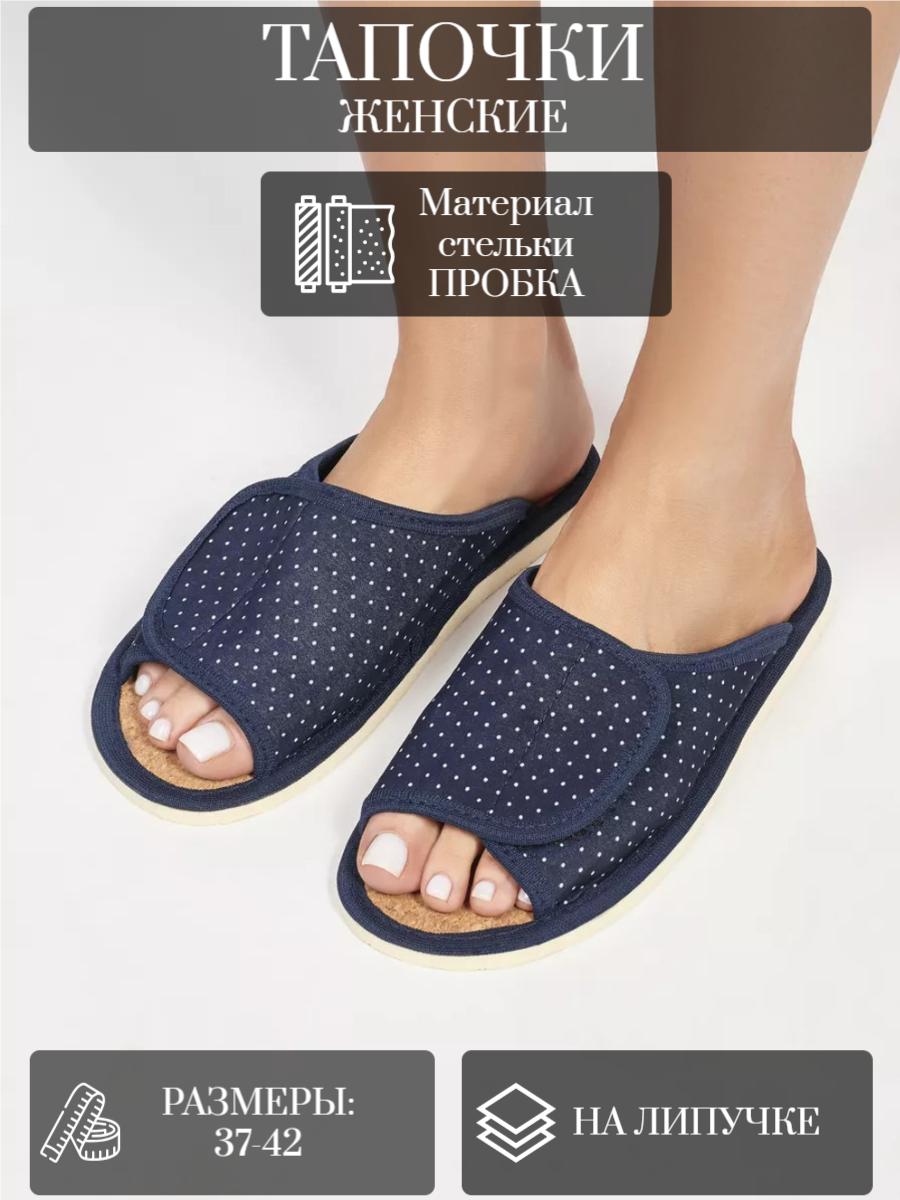Легкие комнатные тапочки женские от бренда "Лепилов" прекрасно подойдут для ежедневного ношения дома и на даче в любое время года. Их можно предложить своим гостям, или взять с собой на отдых, в дорогу. А как приятно после тяжелого рабочего дня переобуться в тапочки с комфортной посадкой по ноге! Благодаря липучке они подходят на стопу с любой полнотой и подъёмом! Тапочки с открытым мыском не натирают ноги. Верхняя часть домашних тапок выполнена из качественного текстиля, который легко пропускает воздух. В таких тапочках нога не потеет и не скользит. Стелька выполнена из качественной пробки, благодаря которой их очень комфортно носить как с носком, так и на босу ногу! Они спасают от холодного и мокрого пола. Подошва изготовлена из ЭВА, это легкий, упругий, эластичный и износостойкий материал. Все швы качественно обработаны производителем. Классическая модель подойдет для носки в любое время года: в осенний, весенний и летний, в зимний период, будет удобна в качестве домашних комнатных, дачных или рабочих. Широкий размерный ряд позволяет найти свою пару удобной обуви каждой женщине. Наслаждайтесь каждым моментом вместе с нами!
