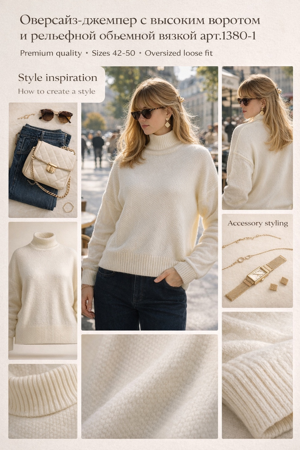 Оверсайз-джемпер с высоким воротом и рельефной объемной вязкой арт.1380-1 — идеальный выбор для тех, кто ценит сочетание уюта и современного стиля. Этот лаконичный джемпер станет основой вашего капсульного гардероба, легко дополняя как повседневные, так и вечерние образы. Ключевые особенности: Трендовый крой: Свободный оверсайз-силуэт создает эффект легкой небрежности, подчеркивая современный лук. Уникальная текстура: Рельефная объемная вязка придает изделию глубину и тактильную мягкость, делая его визуально и ощутимо премиальным. Функциональный дизайн: Высокий ворот (стойка) защищает от холода и позволяет создавать многослойные образы — носите поверх рубашки, топа или водолазки. Универсальный цвет: Идеально сочетается с любыми элементами гардероба, от джинсов до юбок и брюк. Состав: Изготовлен из качественного искусственного кашемира — синтетического аналога натурального материала, который дарит непревзойденную мягкость, тепло и уют. В отличие от шерсти, он не колется, легок в уходе и сохраняет форму даже после многократной носки. Уход: Для продления срока службы рекомендуется ручная стирка в прохладной воде. При правильном уходе джемпер останется вашим любимым предметом гардероба на долгие сезоны. Этот джемпер — не просто вещь, а инвестиция в ваш комфорт и стиль. Он легко интегрируется в любые аутфиты, от офисного до уличного, создавая завершенный и модный образ. Благодаря искусственному кашемиру вы получаете тепло и мягкость, сравнимые с натуральными материалами, без сложного ухода и ограничений по носке. Не упустите возможность добавить в гардероб эту универсальную базовую вещь!