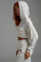 Стильное укороченное худи с капюшоном и длинными рукавами выполнено из очень мягкой приятной к телу ткани в мелкий рубчик. Худи свободного кроя с маленьким кармашком с клапаном на груди. Отлично сочетается с майками, топами, спортивными брюками, шортами, юбками.