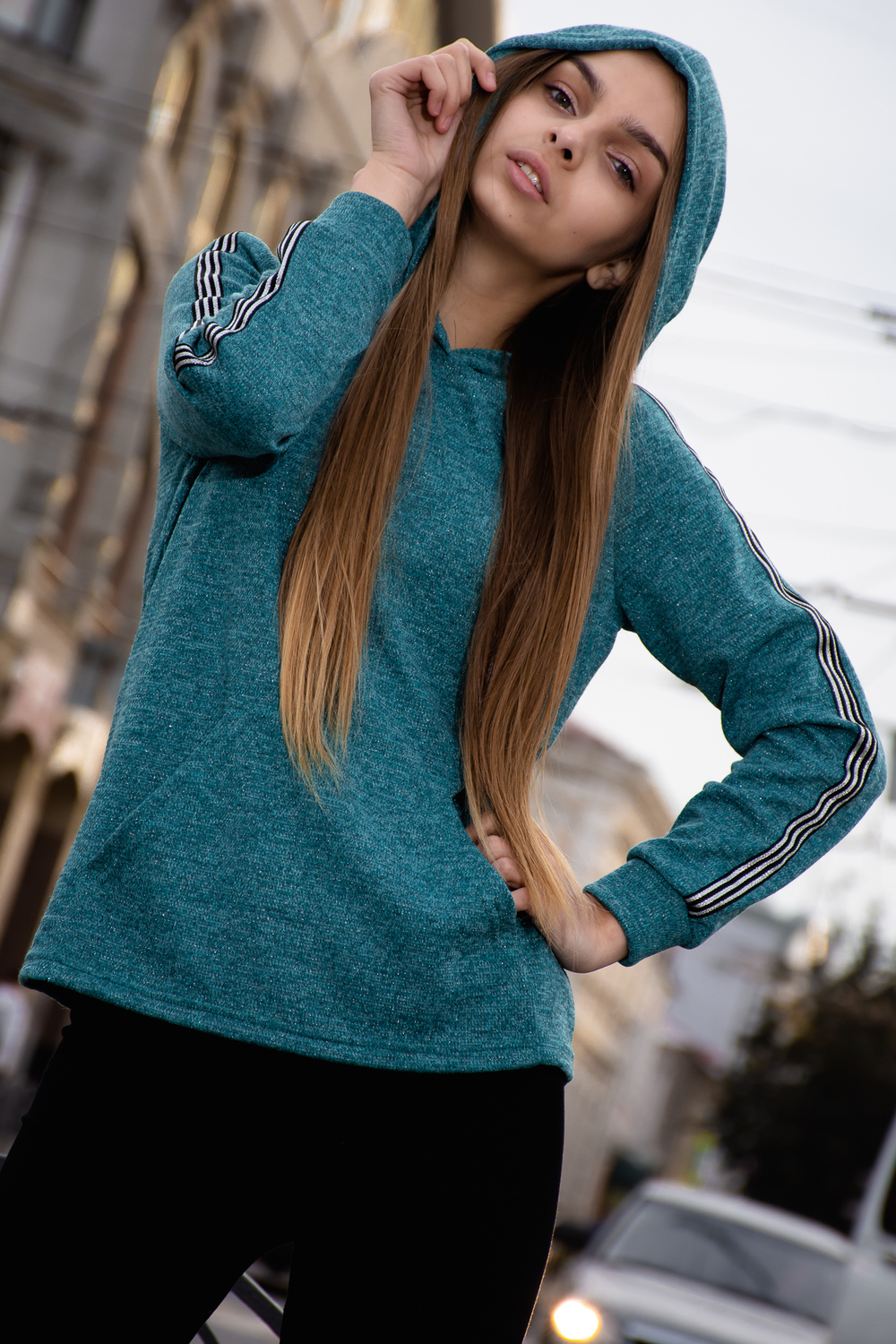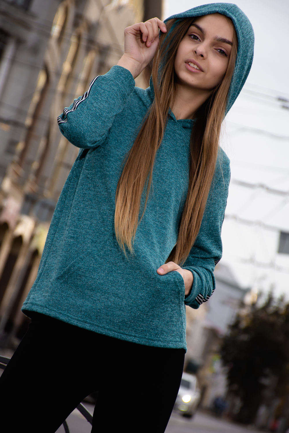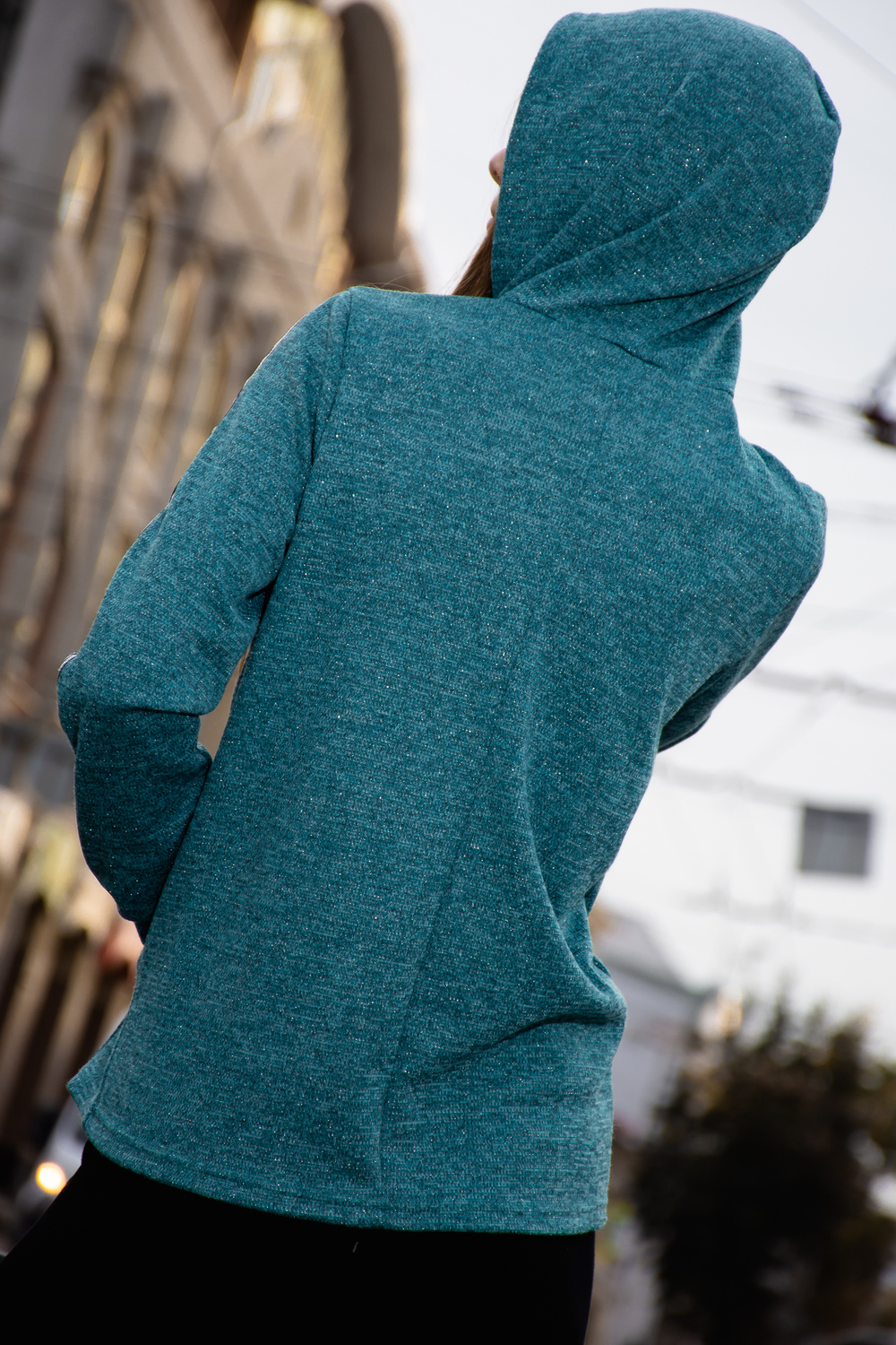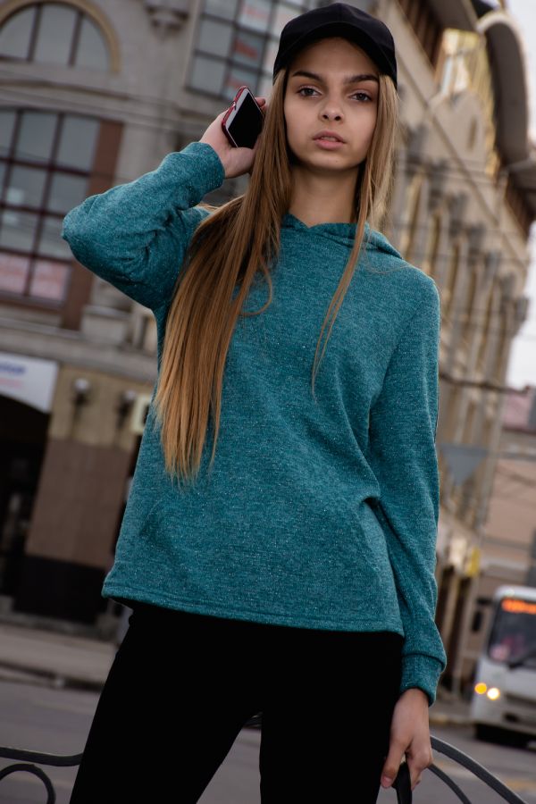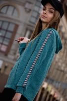 Толстовка женская прямого силуэта с капюшоном, на полочке карман “Кенгуру”. Ткань с добавлением люрекса