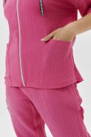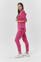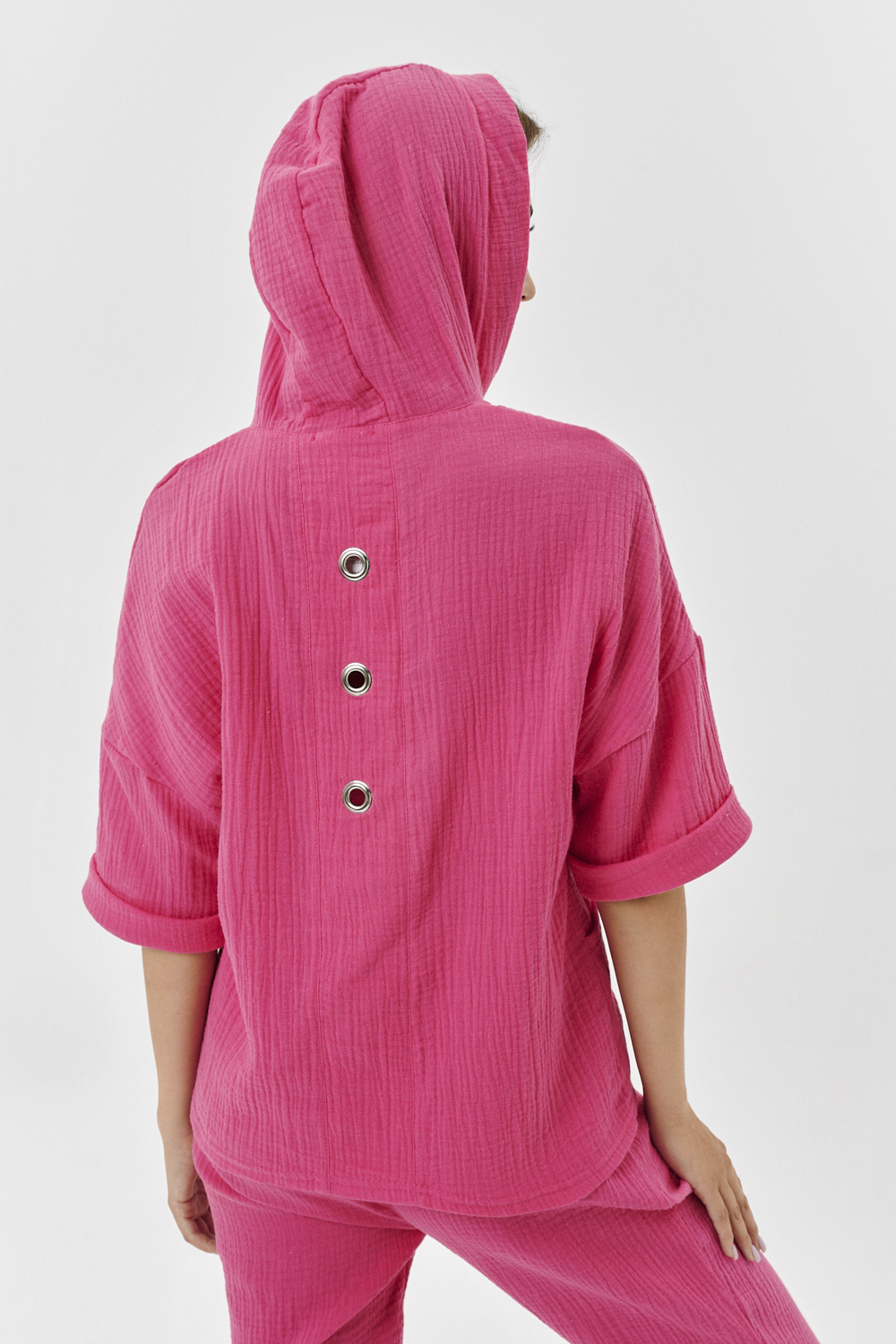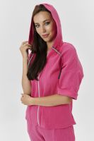 Толстовка прямая, свободная, с капюшоном, на молнии. Рукав короткий, на манжете. На полочке расположены фигурные накладные карманы. Вдоль спинки расположена вставка с декоративными элементами.