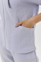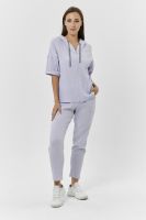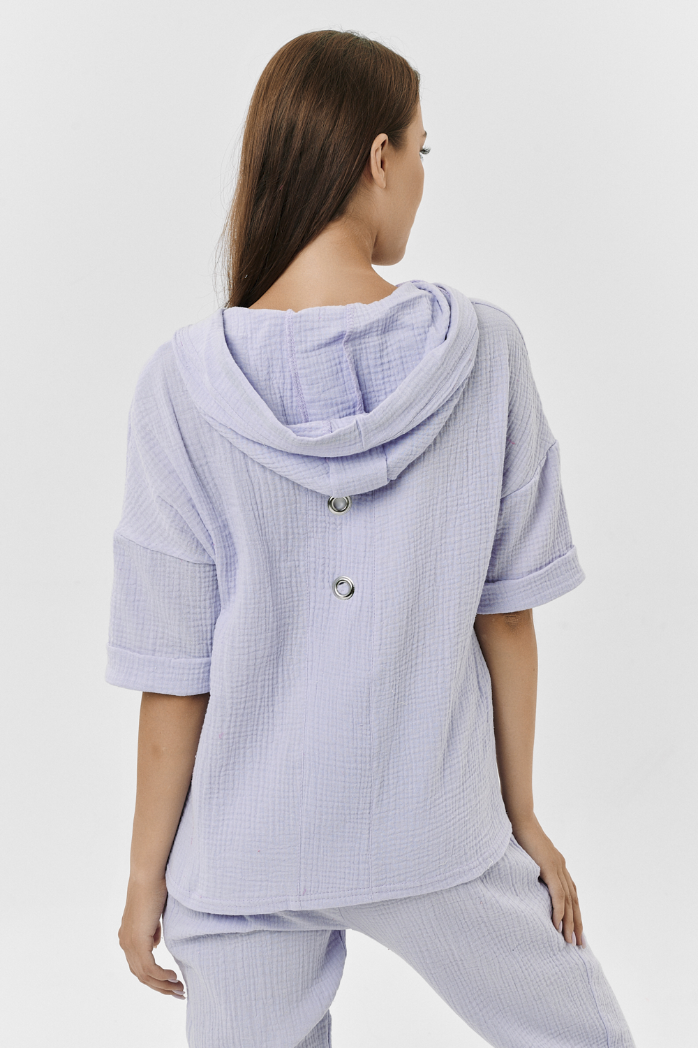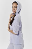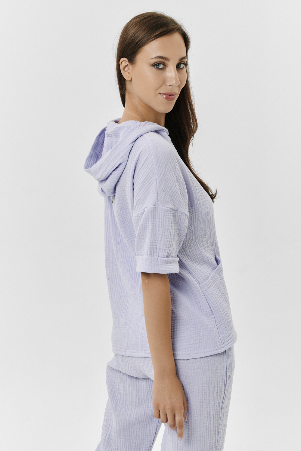 Толстовка прямая, свободная, с капюшоном, на молнии. Рукав короткий, на манжете. На полочке расположены фигурные накладные карманы. Вдоль спинки расположена вставка с декоративными элементами.