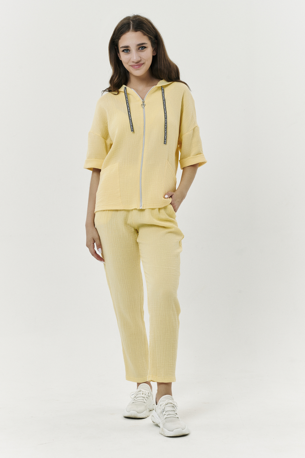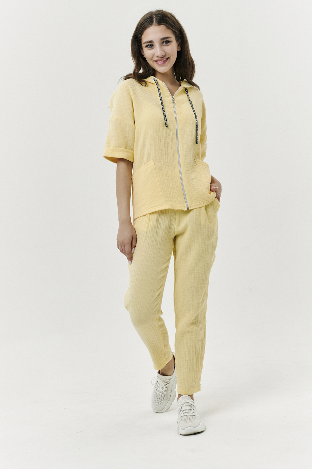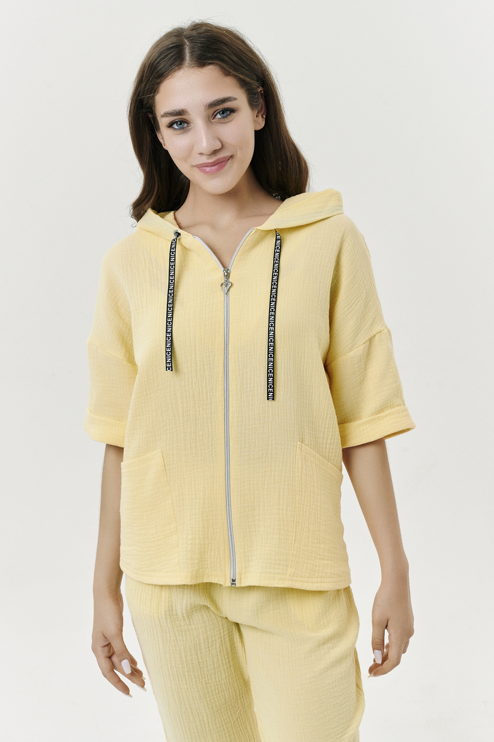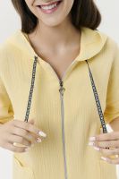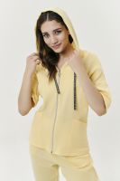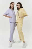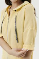 Толстовка прямая, свободная, с капюшоном, на молнии. Рукав короткий, на манжете. На полочке расположены фигурные накладные карманы. Вдоль спинки расположена вставка с декоративными элементами.