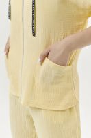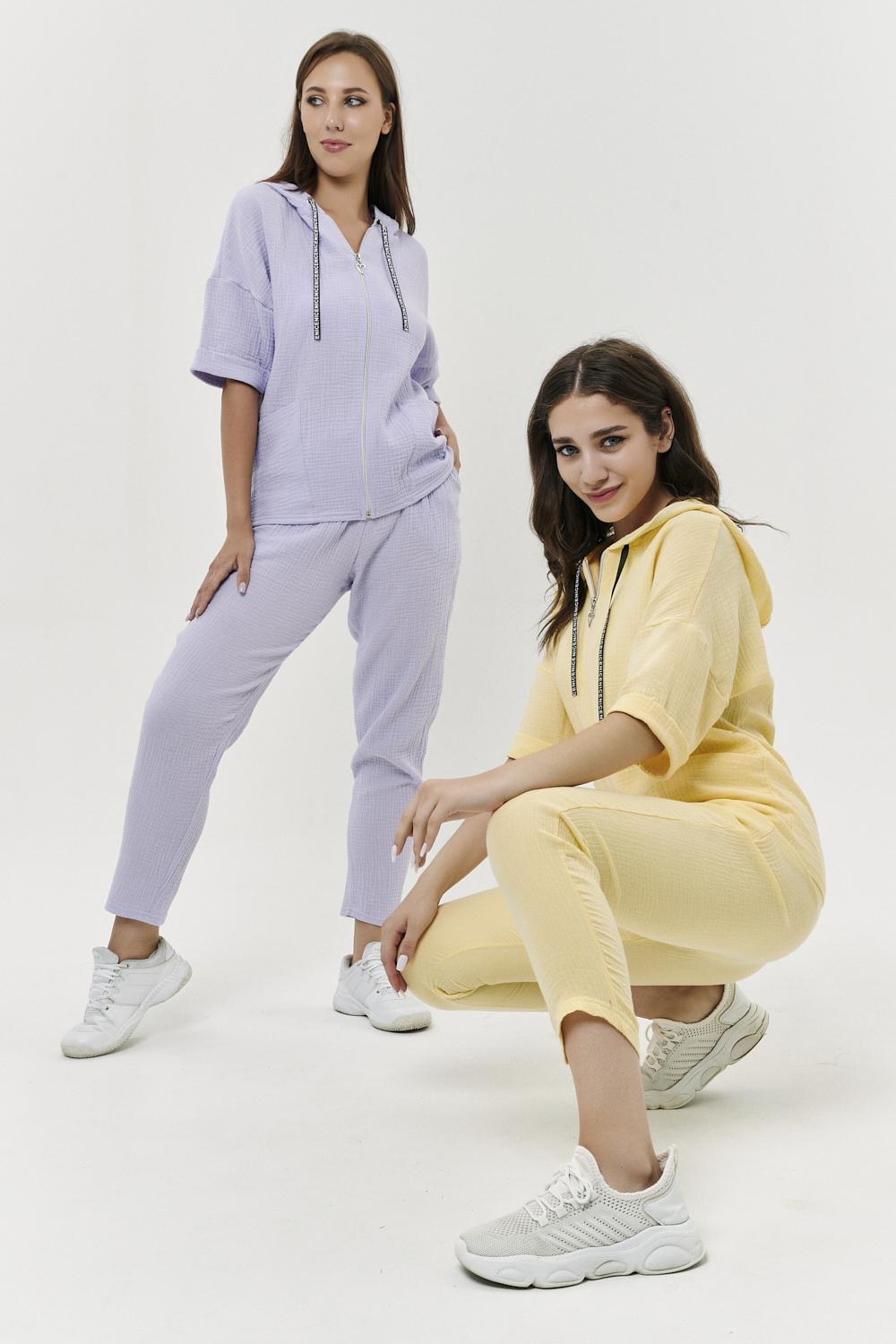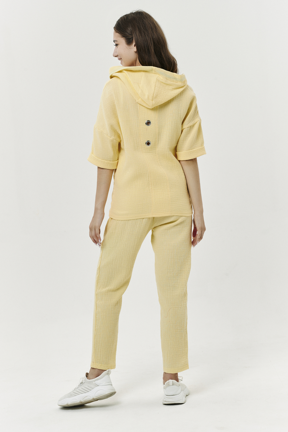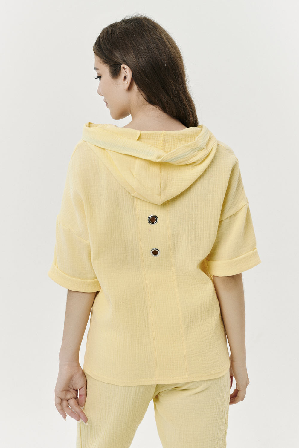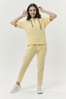 Толстовка прямая, свободная, с капюшоном, на молнии. Рукав короткий, на манжете. На полочке расположены фигурные накладные карманы. Вдоль спинки расположена вставка с декоративными элементами.