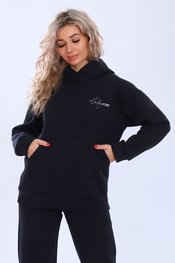 Толстовка женская прямого силуэта до линии бедер, в нижней части заужена по бокам. Рукав втачной с заниженной линией плеча, с манжетой. Капюшон с люверсами и декоративными шнурками. Застежка на тесьму-молнию. В нижней части полочки два накладных кармана. Цвет изумруд в разных оттенках.