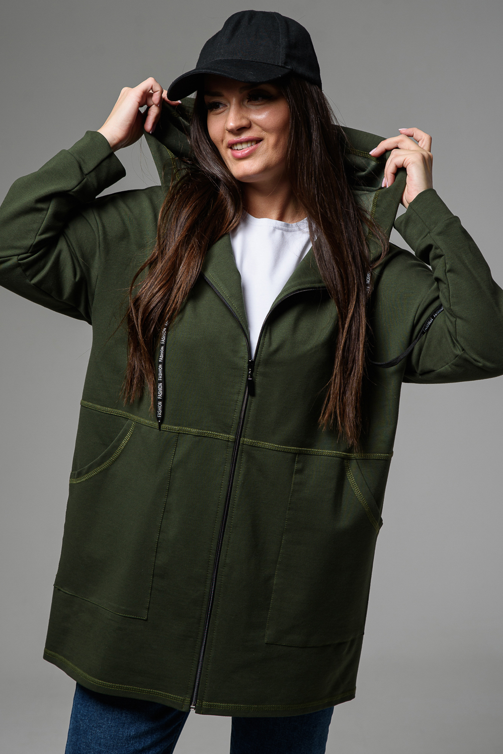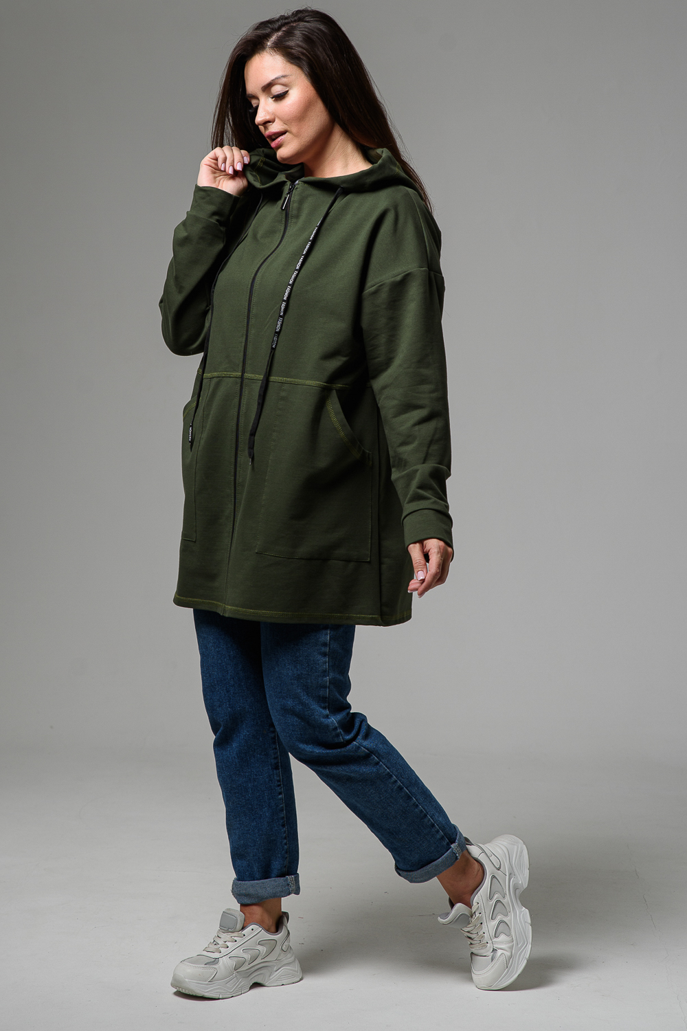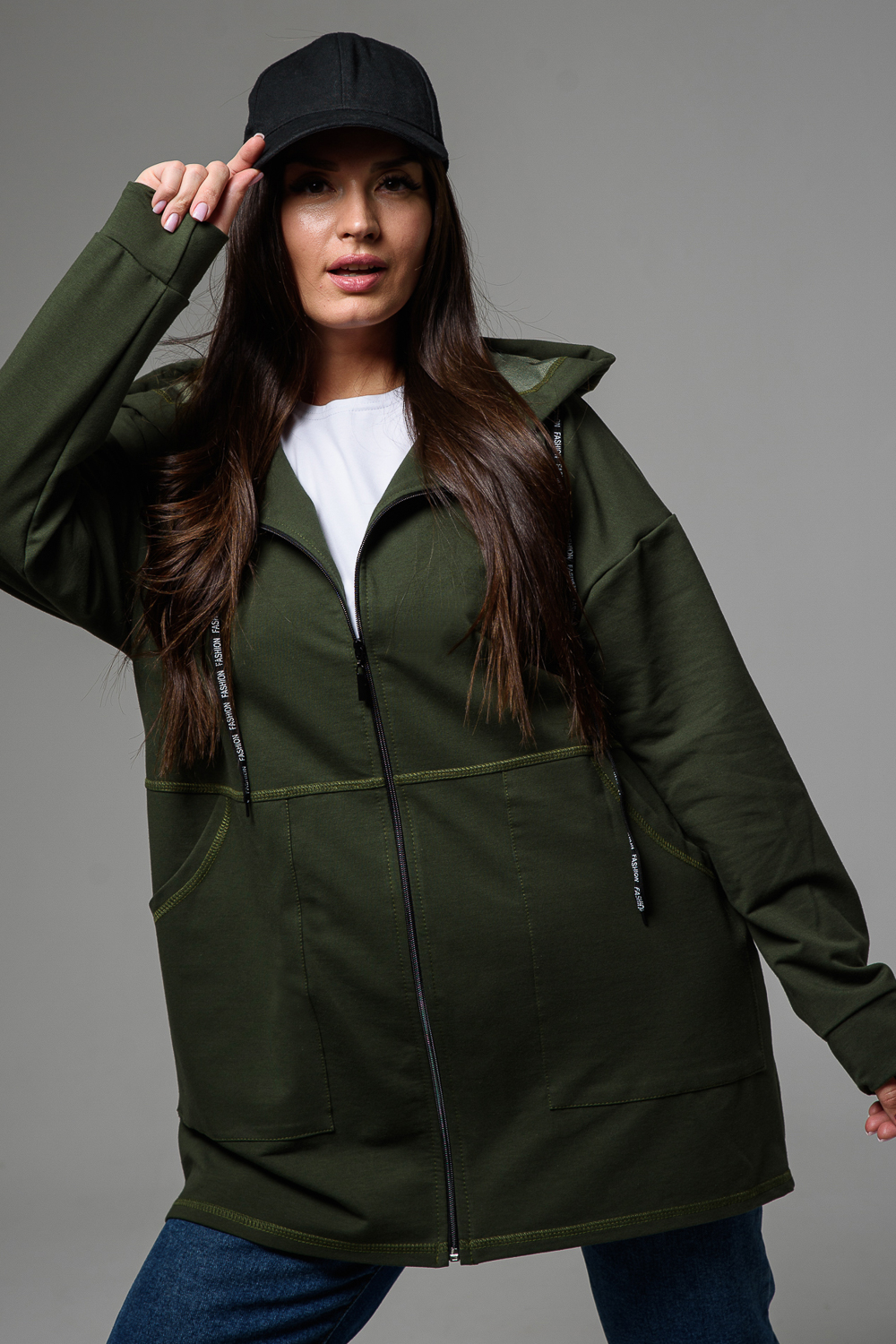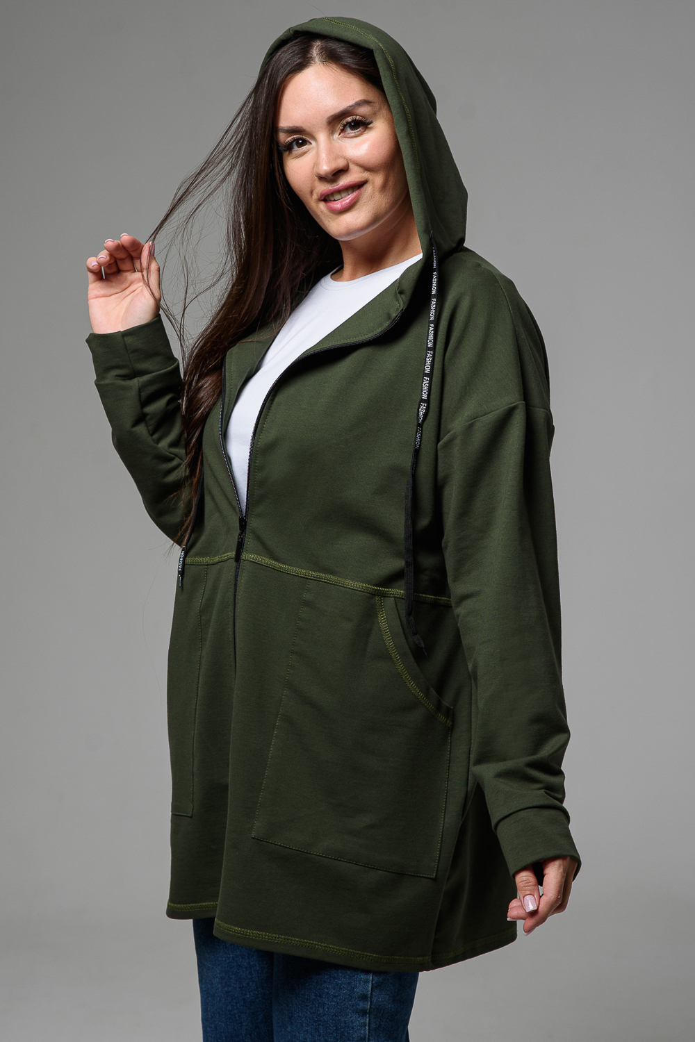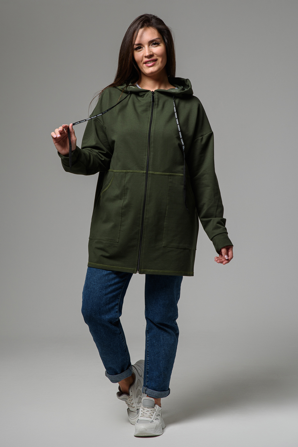 Толстовка женская прямого силуэта до линии бедер, в нижней части заужена по бокам. Рукав втачной с заниженной линией плеча, с манжетой. Капюшон с люверсами и декоративными шнурками. Застежка на тесьму-молнию. В нижней части полочки два накладных кармана. Цвет изумруд в разных оттенках.