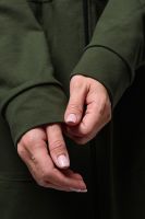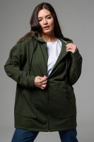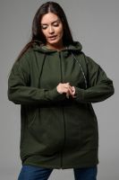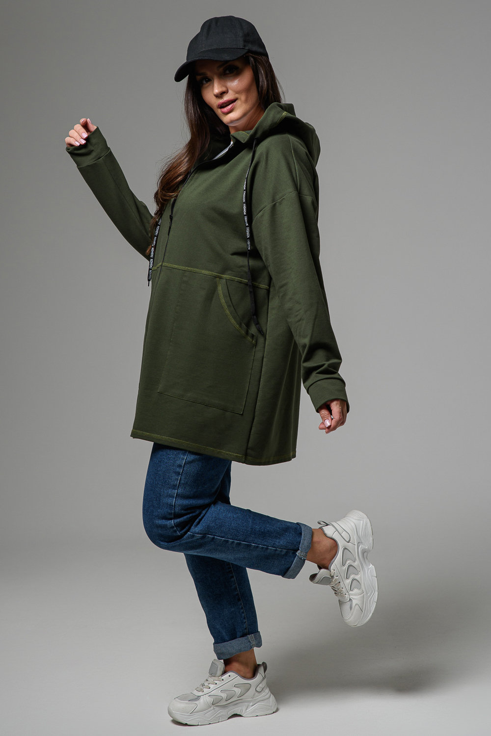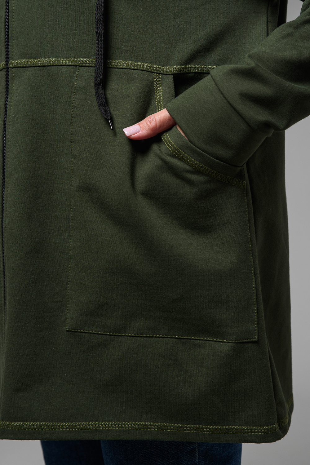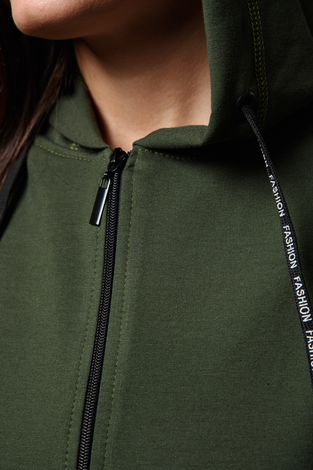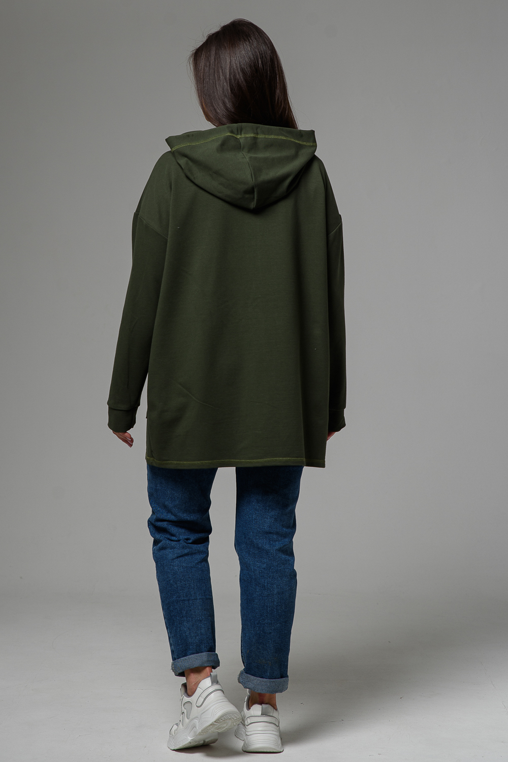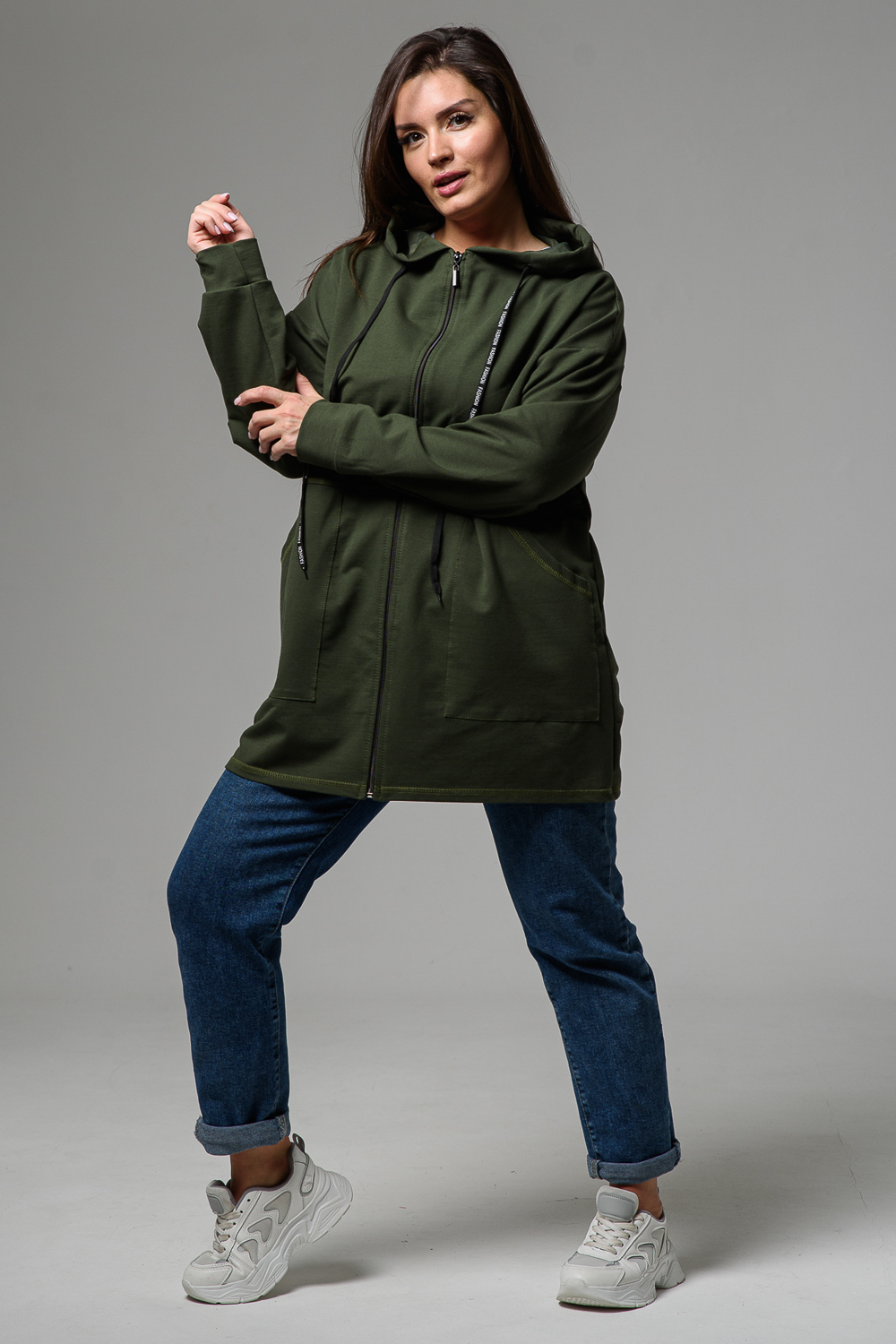 Толстовка женская прямого силуэта до линии бедер, в нижней части заужена по бокам. Рукав втачной с заниженной линией плеча, с манжетой. Капюшон с люверсами и декоративными шнурками. Застежка на тесьму-молнию. В нижней части полочки два накладных кармана. Цвет изумруд в разных оттенках.