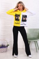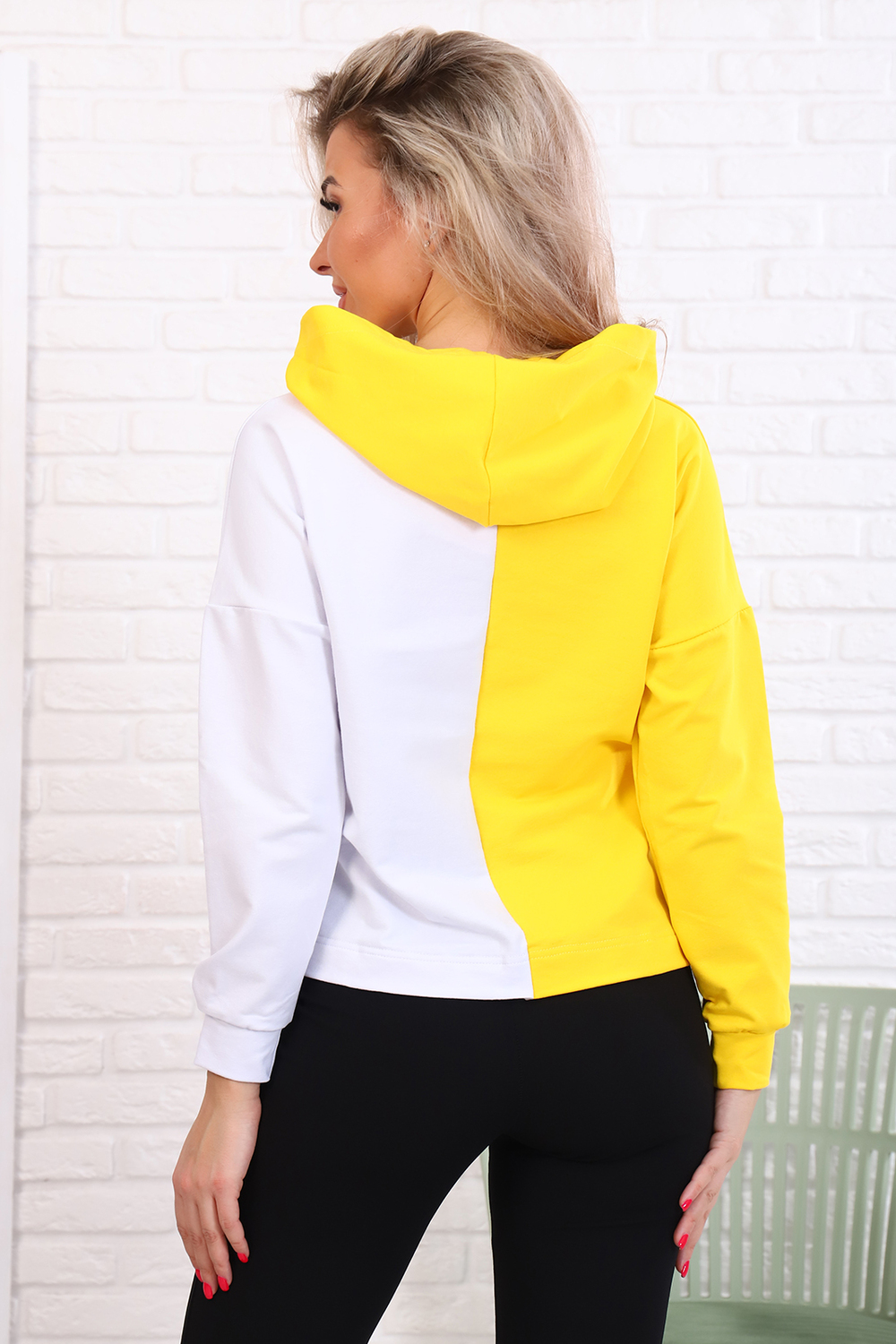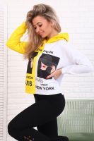 Толстовка женская укороченная со спущенным плечом, втачным длинным рукавом на манжете, с капюшоном. На детали переда печать.