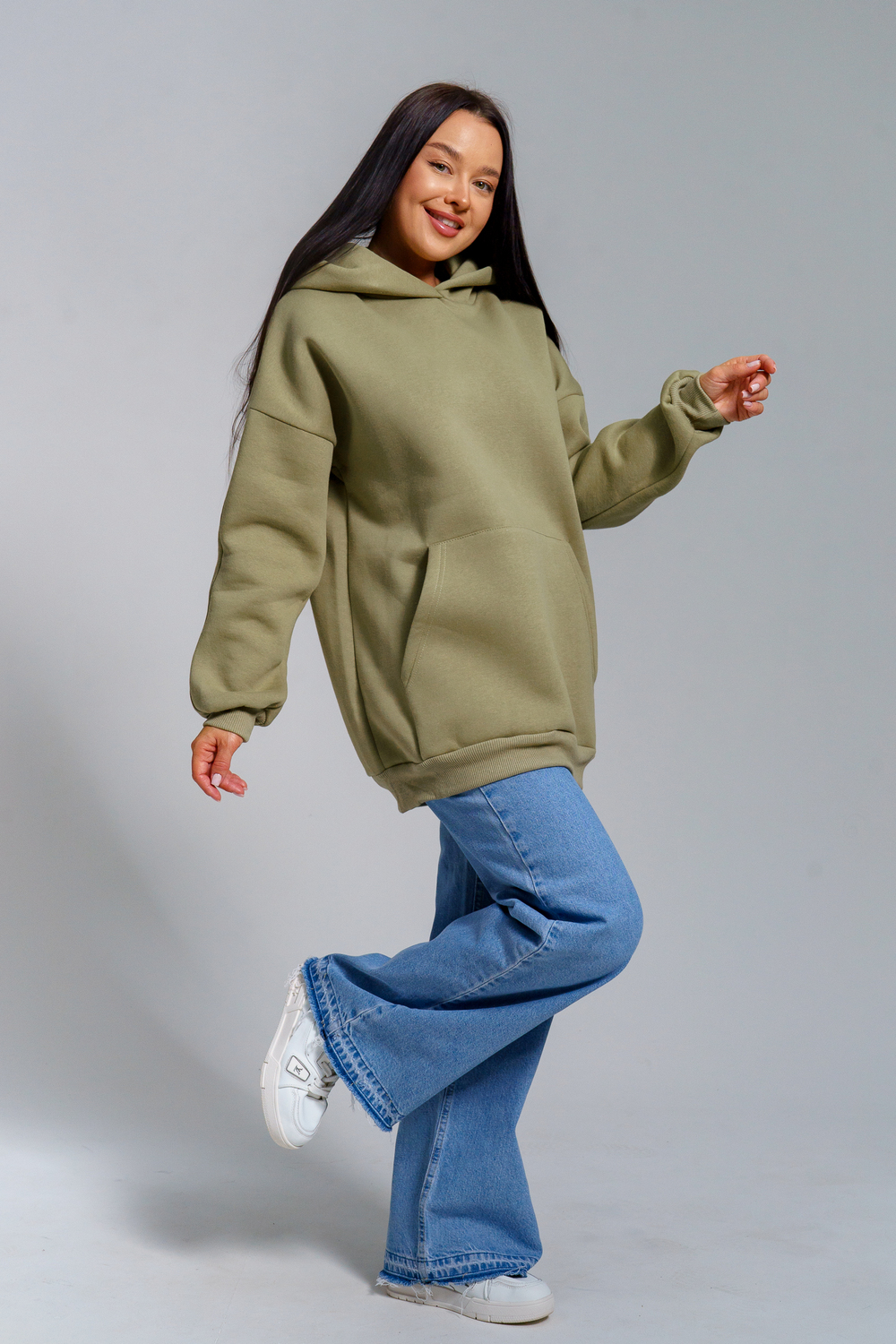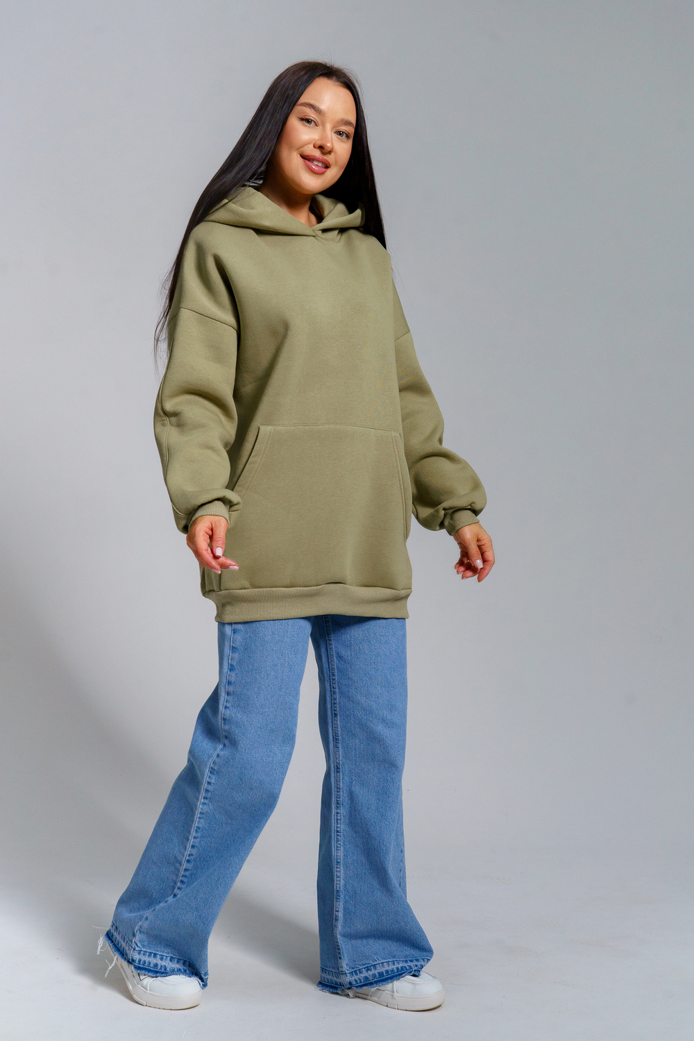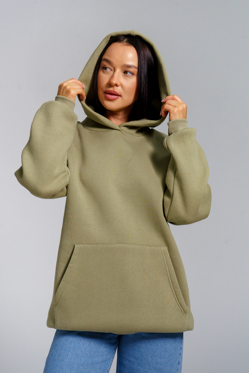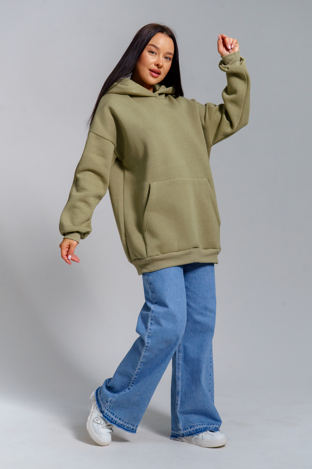 Толстовка из футера с начесом объемного покроя. Двойной капюшон, карман-кенгуру. Срезы обработаны кашкорсе в цвет основной ткани.
