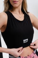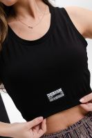 Топ на широких бретелях, с округлой горловиной, с резинкой по низу, длиной выше линии талии. Горловина и проймы обработаны обтачкой из основного полотна.