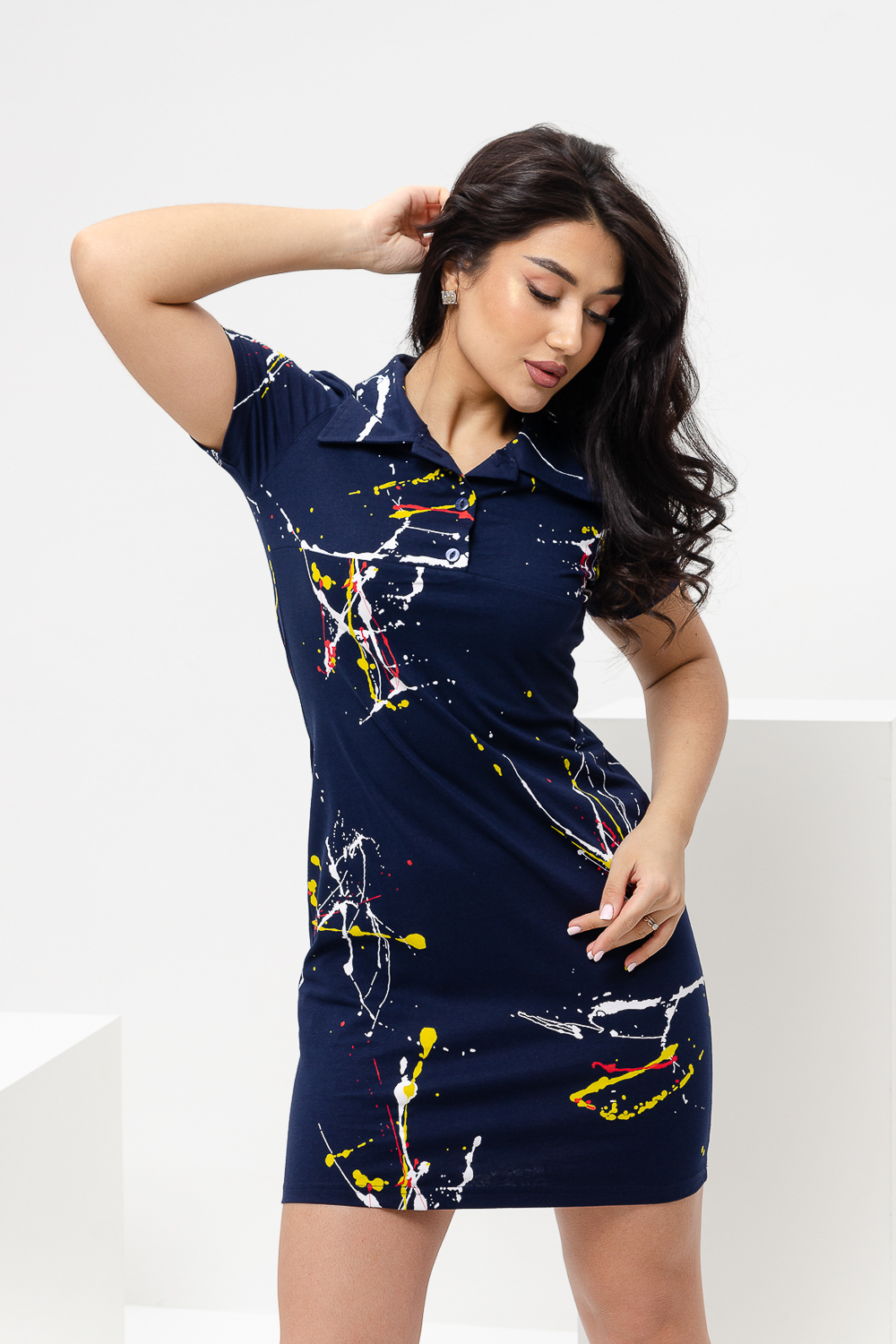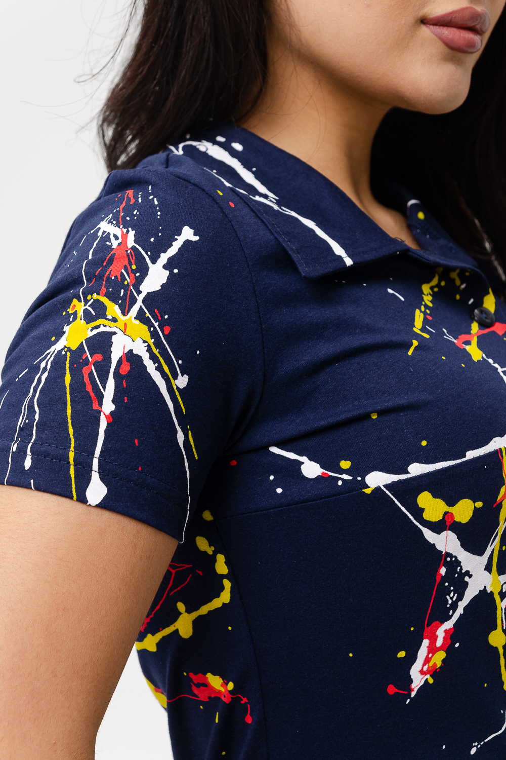 Женское платье поло "Брызги краски". Платье рубашка приталенного силуэта с короткими рукавами и отложным, рубашечным воротником планка на пуговицах. Длина спортивного платья для девушек - выше колена. Изделие изготовлено из 100% натурального хлопка. Дышащая легкая ткань идеально подойдет для прогулок и отдыха, прогулок с ребенком, как домашнее платье. Трикотажное платье можно надеть в офис, отправиться в нем в кино, на свидание или в отпуск. Платье поло с воротником является базовой одеждой для женщин, оно подчеркнет вашу фигуру и создаст элегантный повседневный образ.