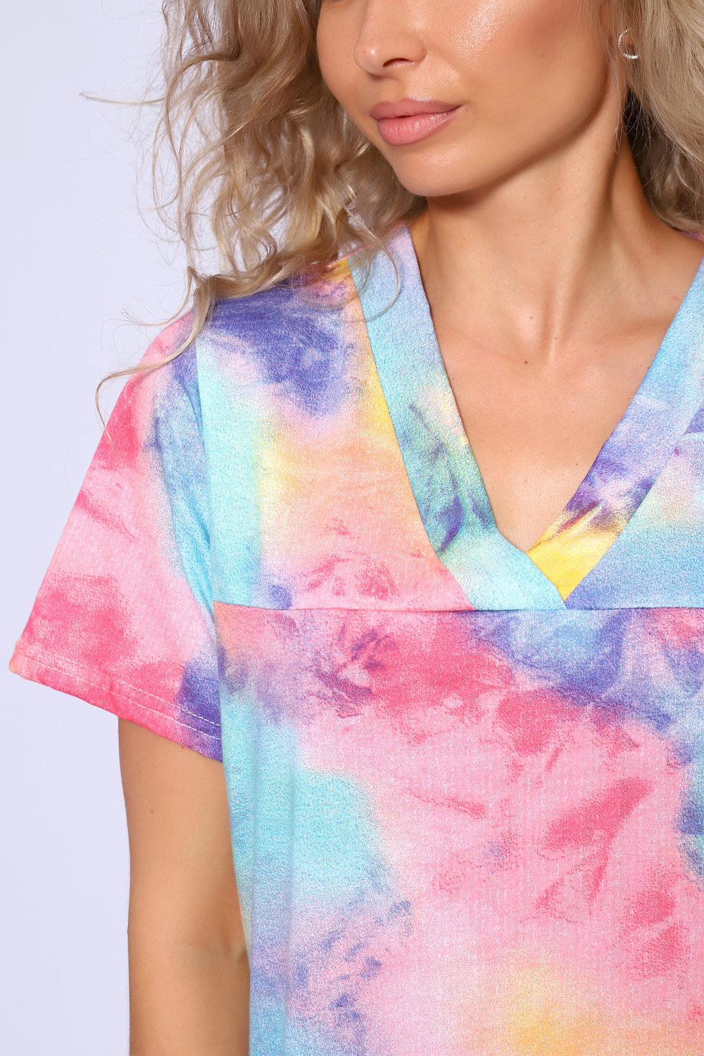 Свободная туника с короткими рукавами и V - образным вырезом горловины. В боковых швах карманы и небольшие разрезы.