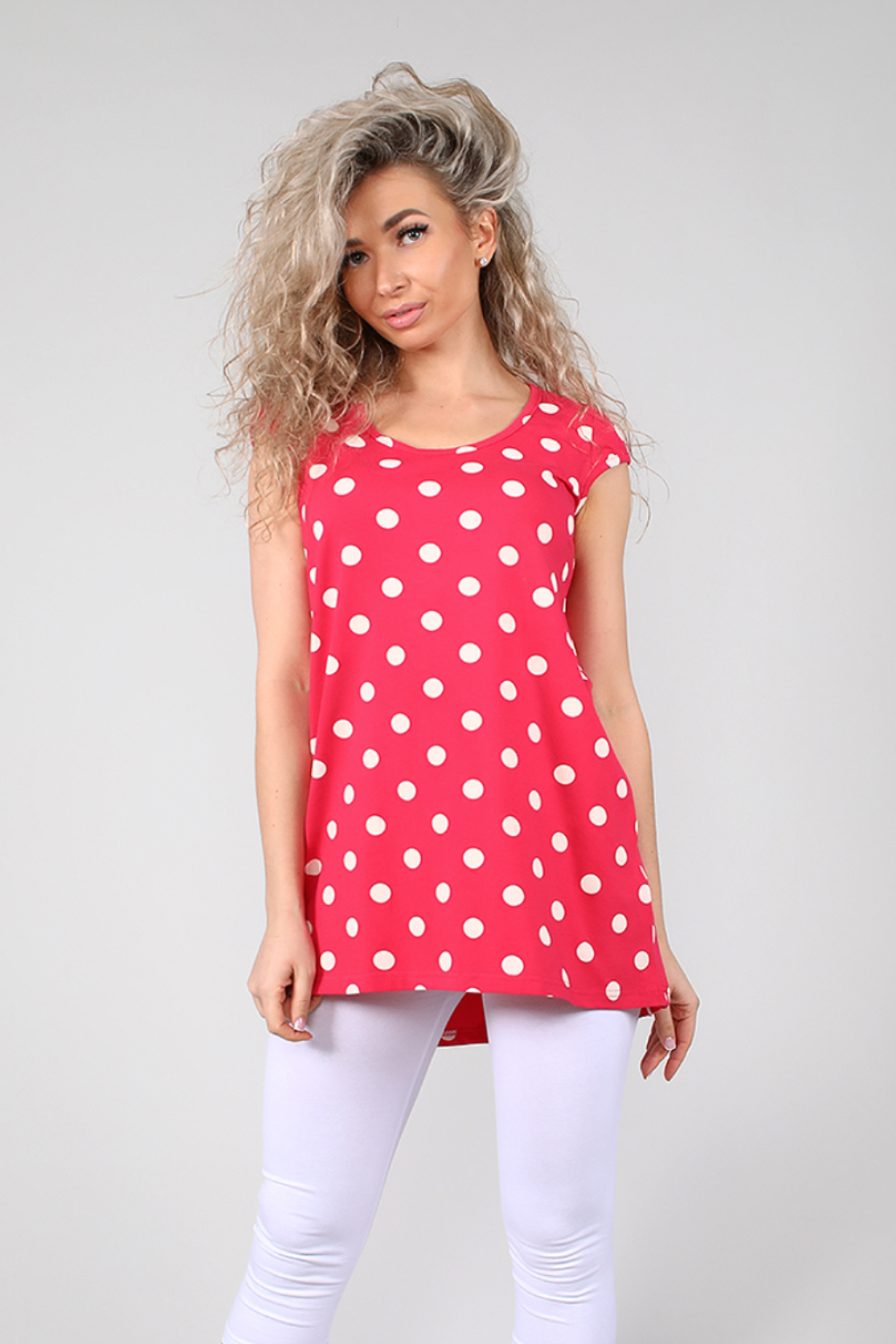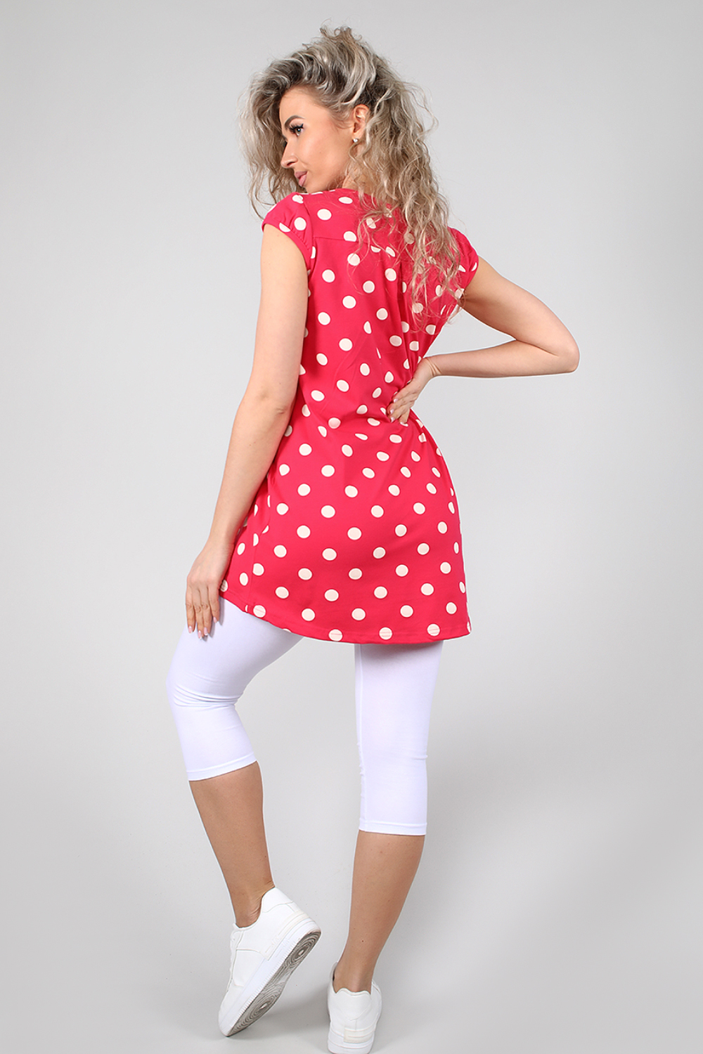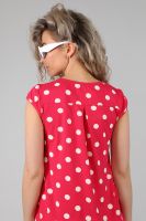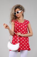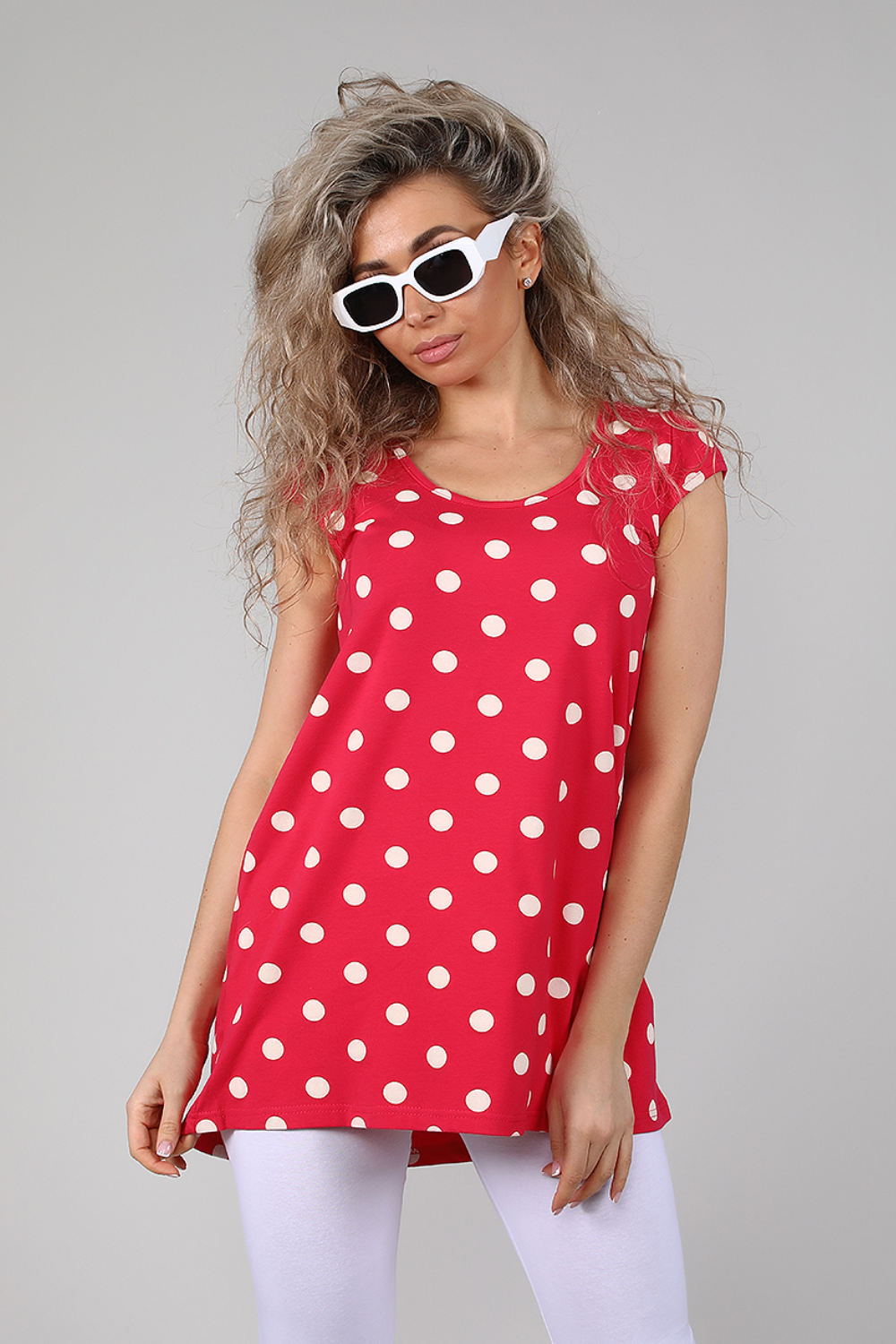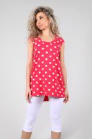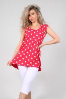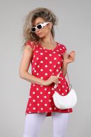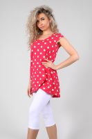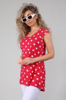 Туника женская с втачным коротким рукавом. Данная модель выполнена из эластичного трикотажного полотна кулирка с лайкрой. Горловина обработана окантовкой. Полочка чуть короче спинки. Спинка отрезная со встречной складкой, низ изделия округлый. Отлично смотрится с лосинами. В летнее время она порадует вас своим свободным силуэтом, легкостью и эластичностью.