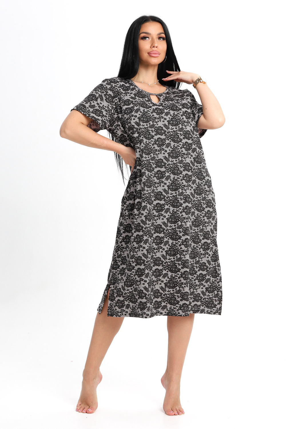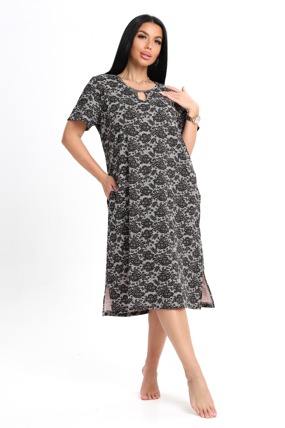 Туника женская прямого силуэта с карманами, горловина обработана кантом с фигурной капелькой на груди. Сбоку разрезы.