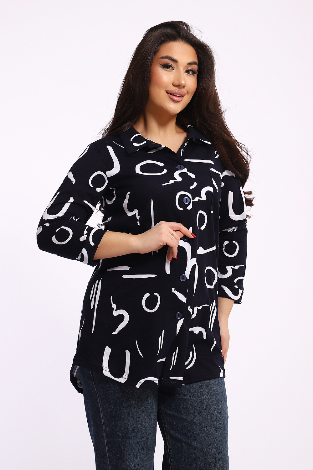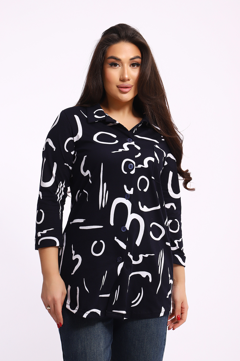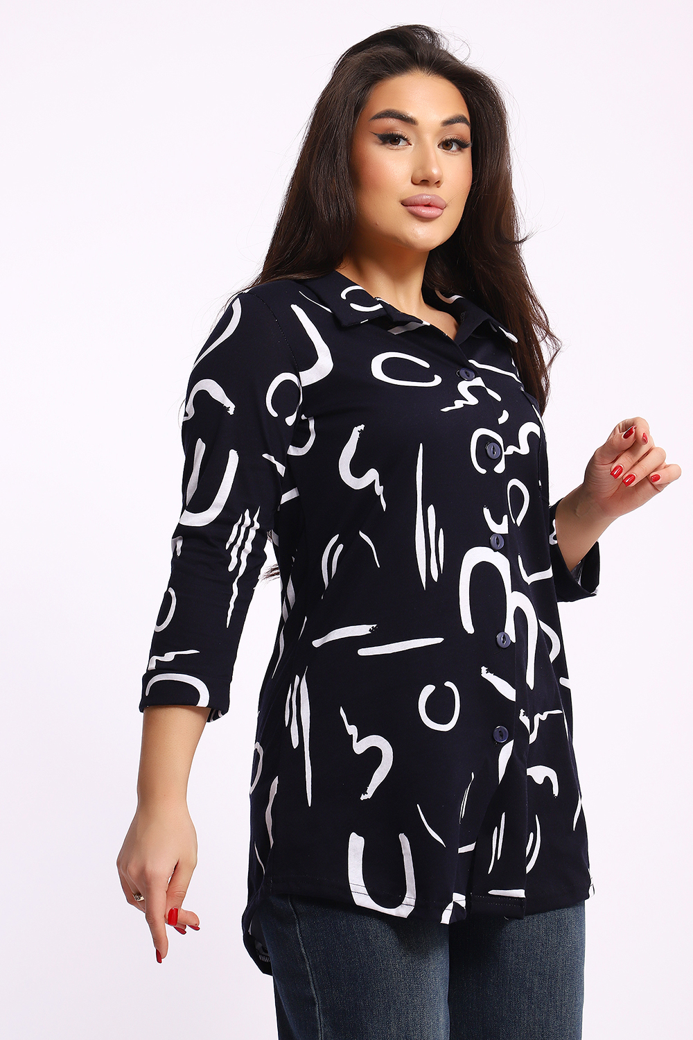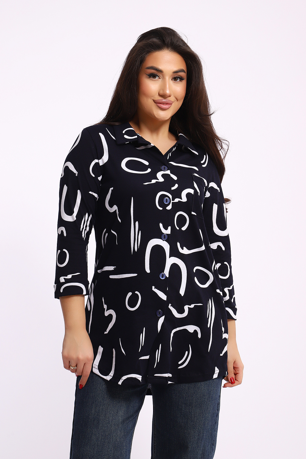 Женская туника-рубашка на пуговицах выполнена из хлопкового трикотажного полотна. Изделие свободного покроя с оригинальным комбинированием прекрасно подойдет для любителей комфорта в стильных вещах.