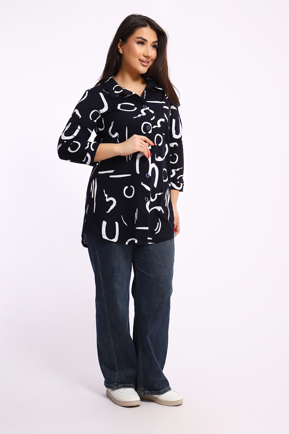 Женская туника-рубашка на пуговицах выполнена из хлопкового трикотажного полотна. Изделие свободного покроя с оригинальным комбинированием прекрасно подойдет для любителей комфорта в стильных вещах.