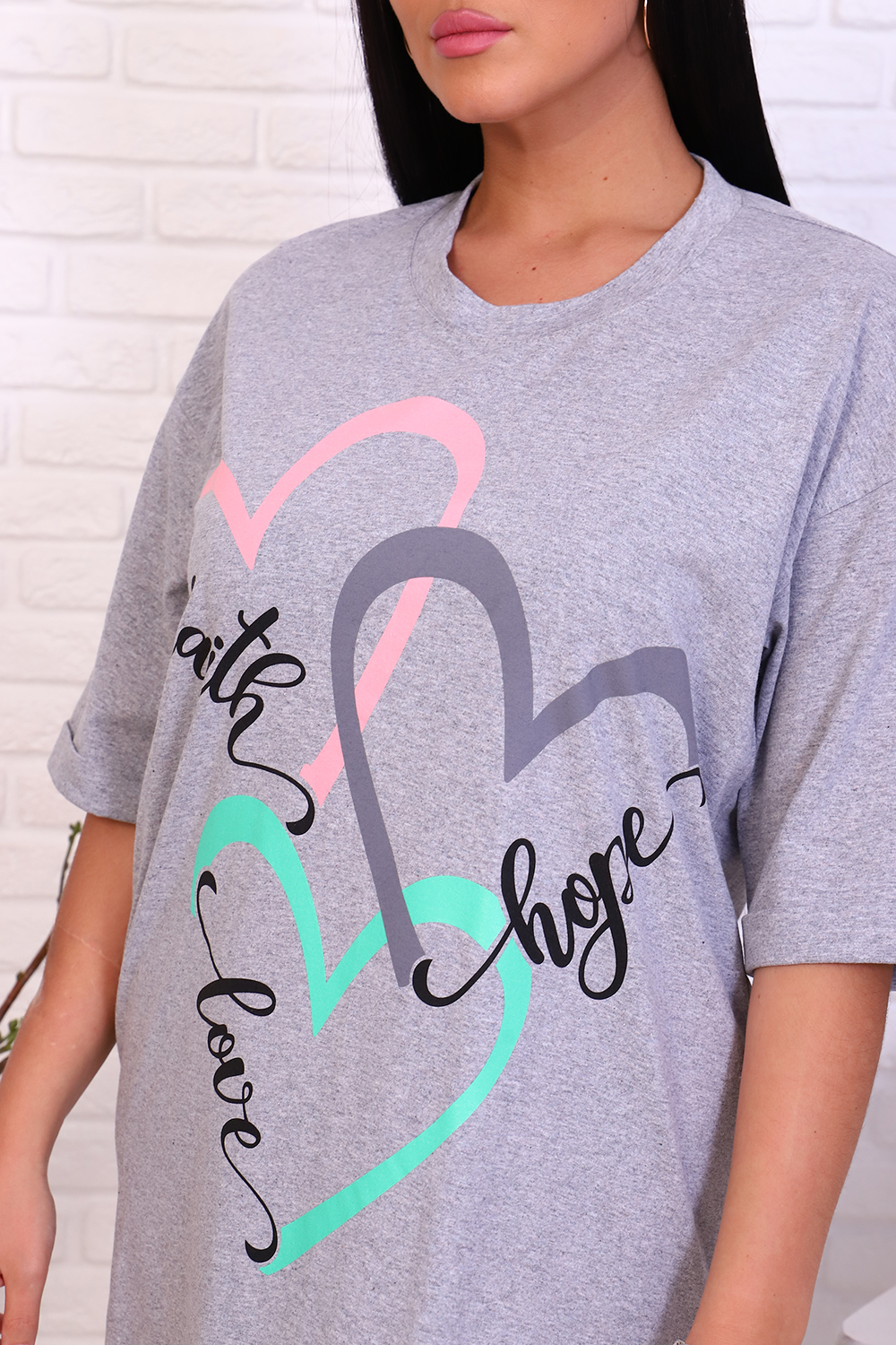 Туника домашняя с ярким принтом в виде сердец. Модель в стиле оверсайз, круглая горловина обработана обтачкой, свободный рукав 3/4 на манжете. Домашняя туника - эффектная замена халату. Это отличная возможность даже дома выглядеть привлекательно и чувствовать себя комфортно. Туника с таким принтом - это замечательный подарок на 8 Марта.