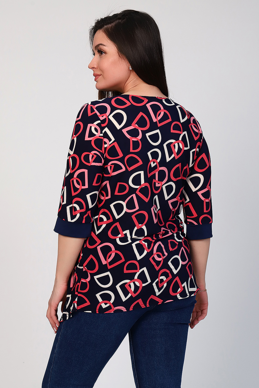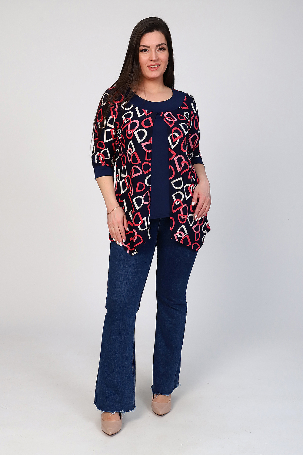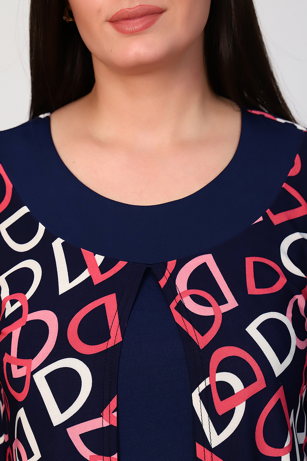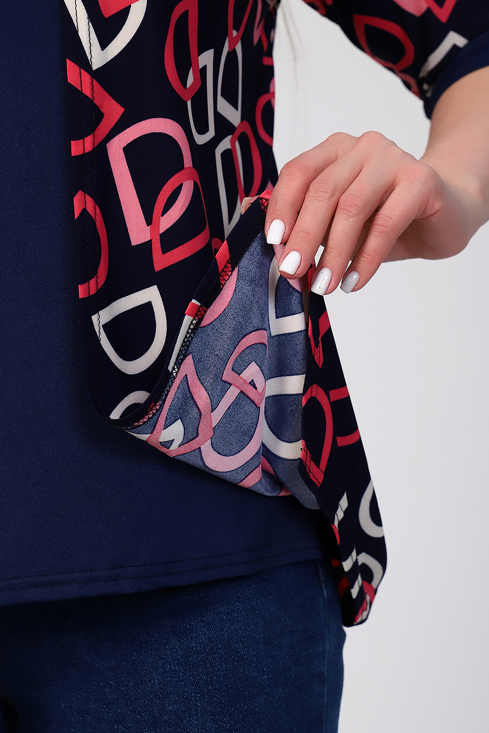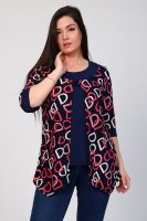 Оригинальная туника 2 в 1, с однотонной вставкой. Полукруглый вырез, рукав 3/4 на манжете, спереди украшение в виде цепи.