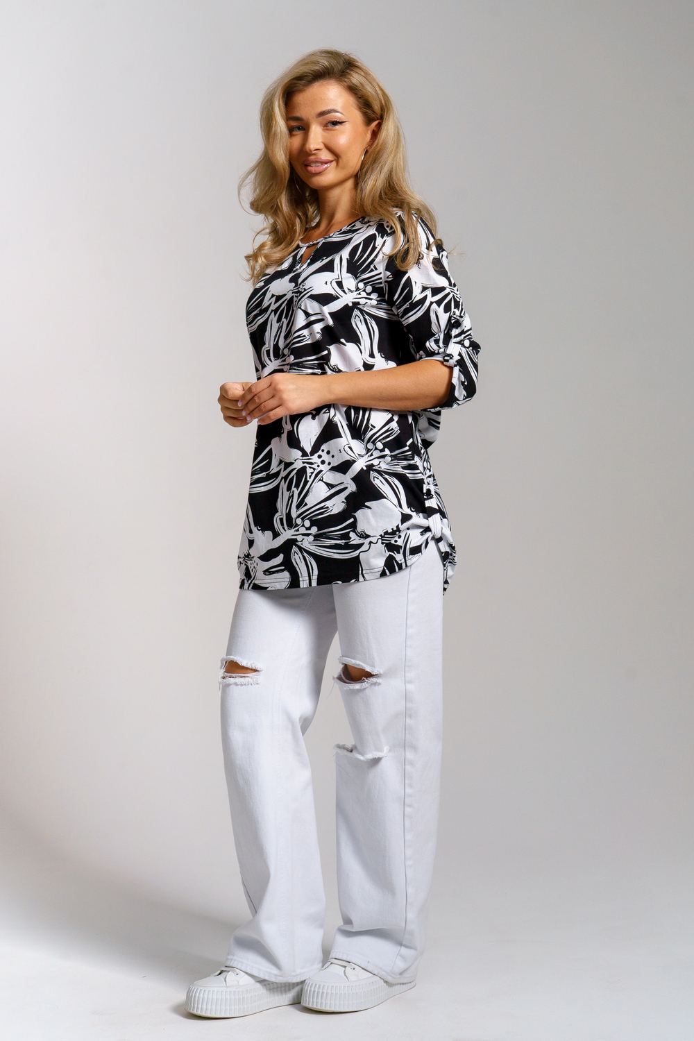 Женская туника свободного силуэта в стиле oversize выполнена из 100% хлопчатобумажного полотна. Этот стиль подходит для любой женщины, ведь он может скрыть все недостатки фигуры и подчеркнуть её достоинства. Округлая горловина с треугольным вырезом, паты на рукавах и по низу изделия делают тунику удобной и привлекательной. Современная туника - это почти неотъемлемая часть гардероба любой женщины. При бережном уходе прослужит вам долгое время. Туника будет любимой домашней одеждой. Тунику летнюю можно взять с собой в роддом, в поездку, или на отдых в санаторий. Блузка такого плана будет отличным подарком для мамы, бабушки, сестры, подруги и любимой девушки. А подарить такой сюрприз можно на любой праздник, день рождения или юбилей, 8 марта, новый год или рождество. Туника удлиненная женская будет хорошо смотреться как на невысоких, так и на высоких. Блузка с вырезом идеальная вещь для похода на работу и дачу, которая сделает Вас неотразимой в любой ситуации.