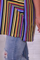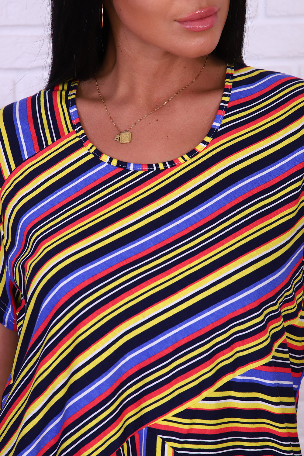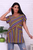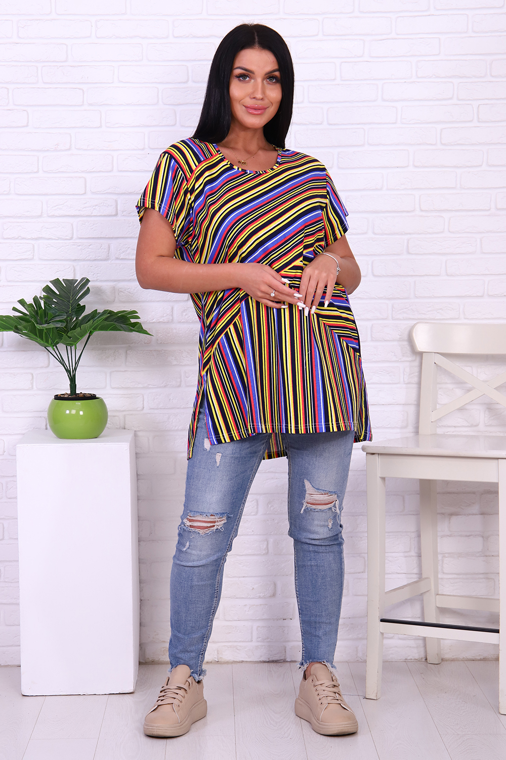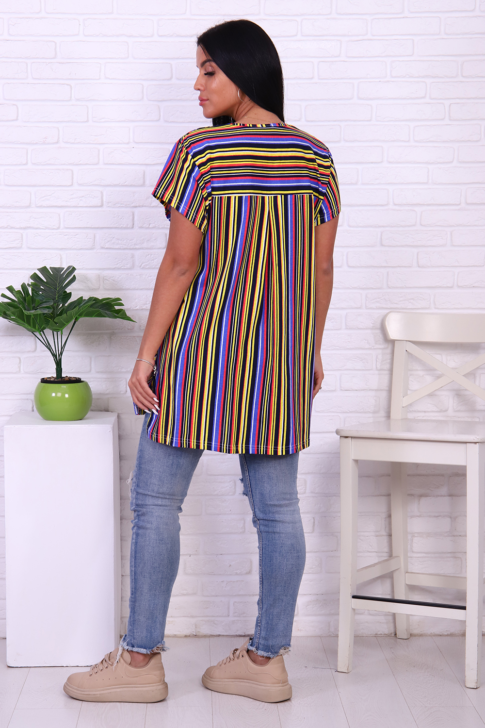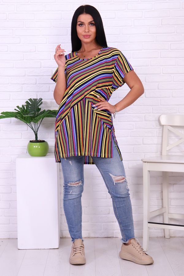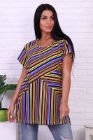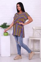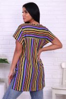 Туника женская приталенного силуэта с коротким рукавом, полочка оформлена асимметричными разрезными полосками, на спинке закладывается бантовая складка, в боковых швах имеются разрезы.