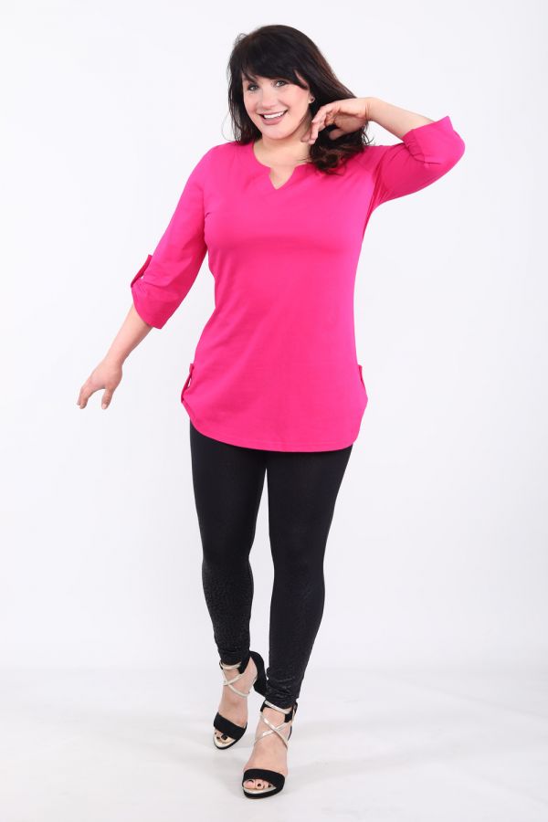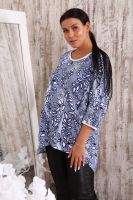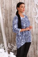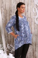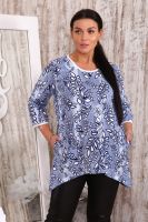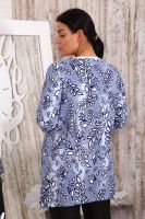Туника А - образного силуэта выполнена из 100% хлопчатобумажного трикотажного набивного полотна. Горловина и рукав обработаны белым кантом. Данная модель, скрывающая недостатки и подчёркивающая достоинства фигуры, для удобства дополнена боковыми карманами.