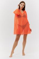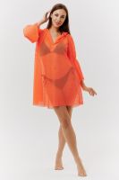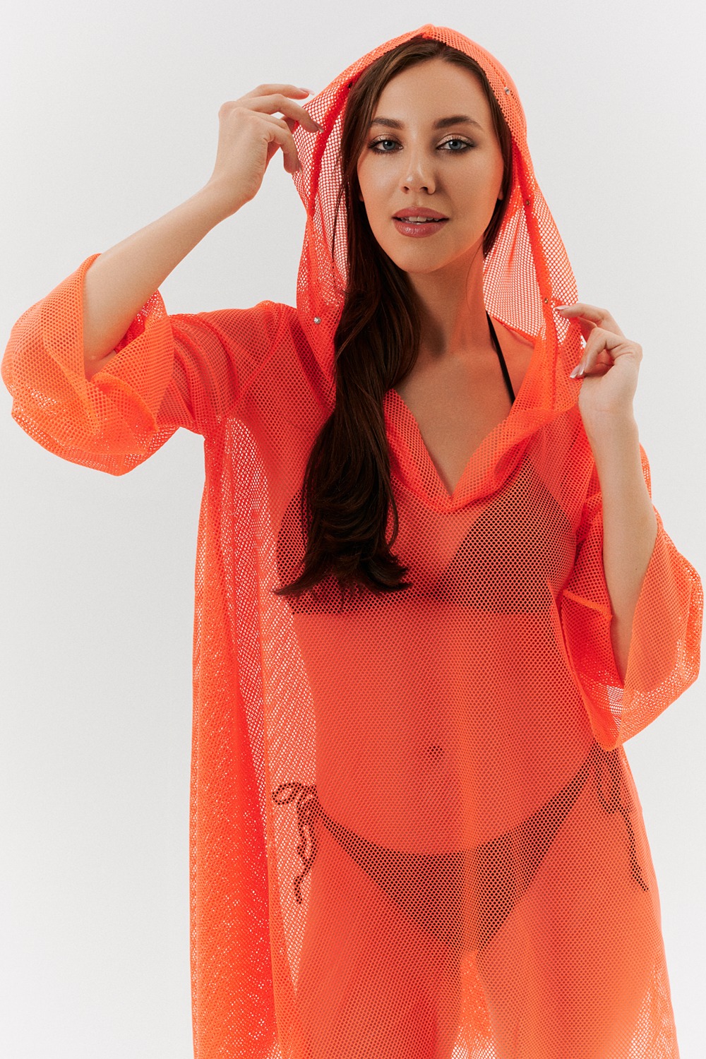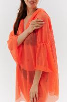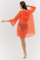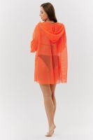 Туника женская пляжная, свободного силуэта, с капюшоном и длинным рукавом. Декорирована хальнитенами.