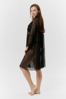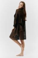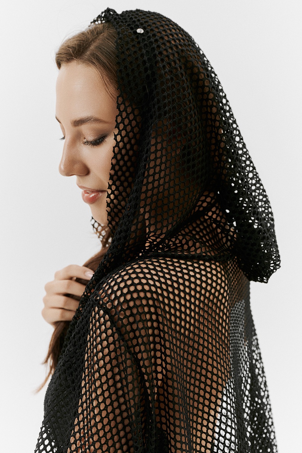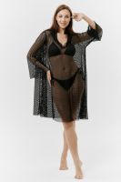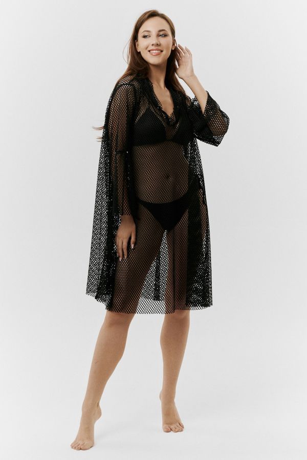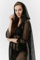 Туника женская пляжная, свободного силуэта с капюшоном и длинным рукавом. Декорирована хольнитенами.