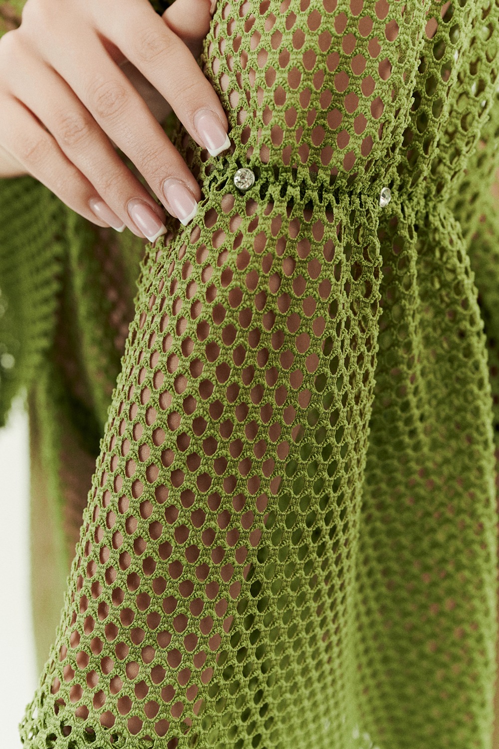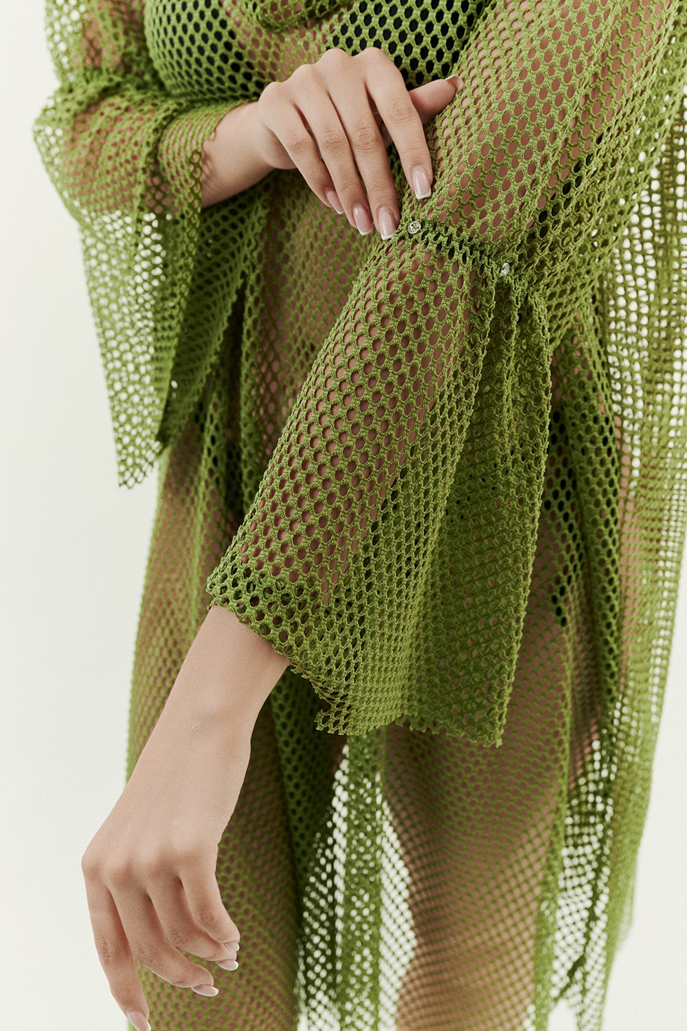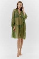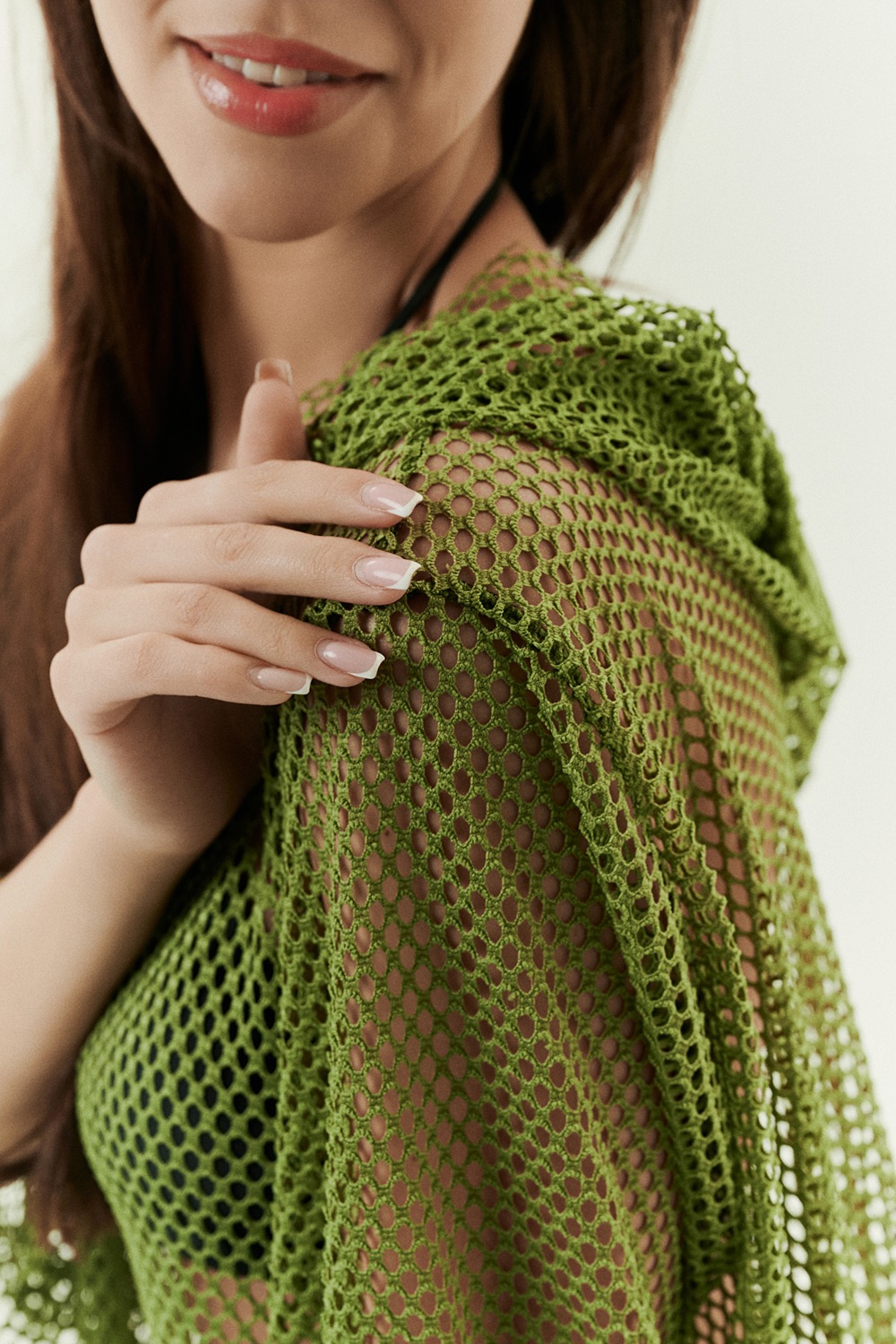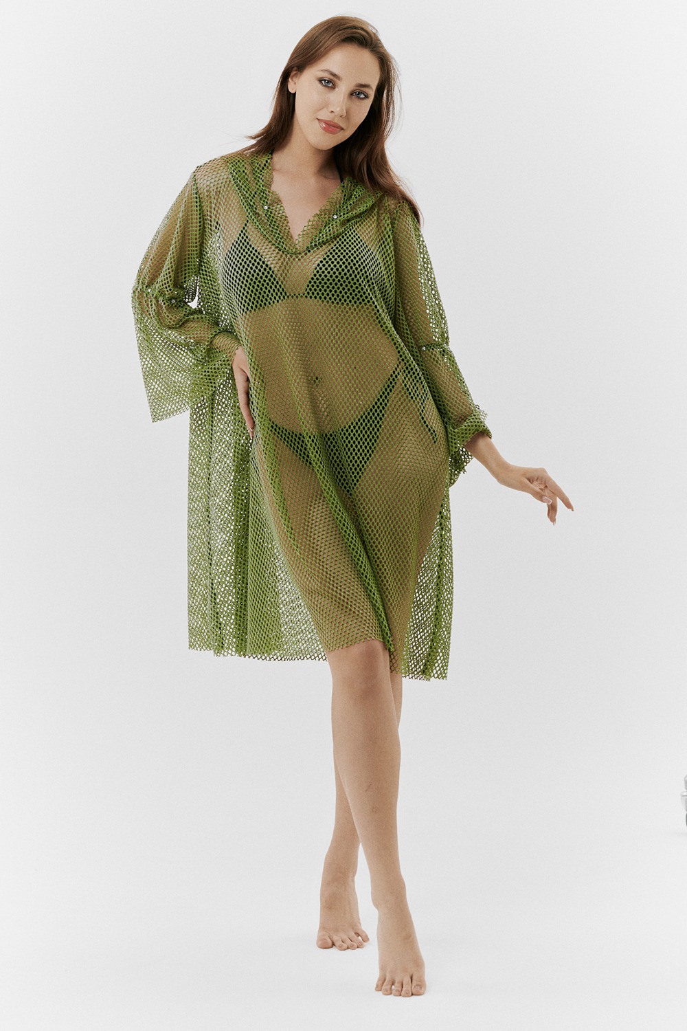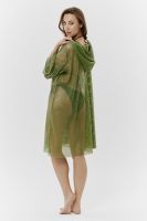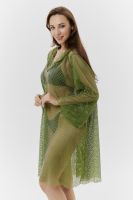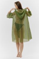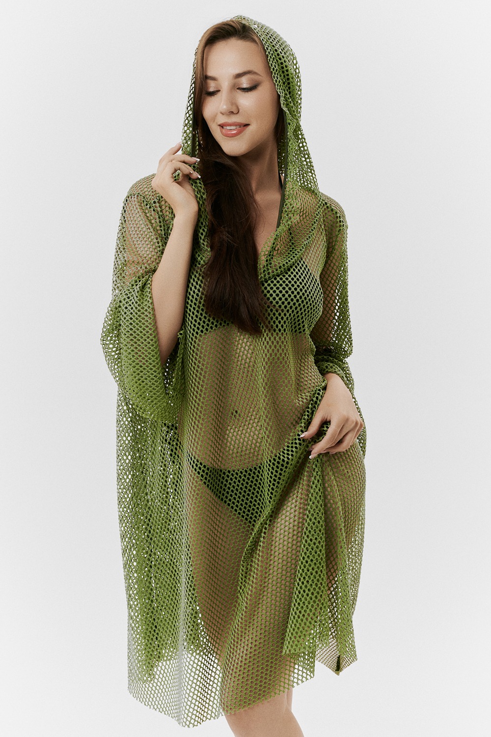 Туника женская пляжная, свободного силуэта с капюшоном и длинным рукавом. Декорирована хольнитенами.