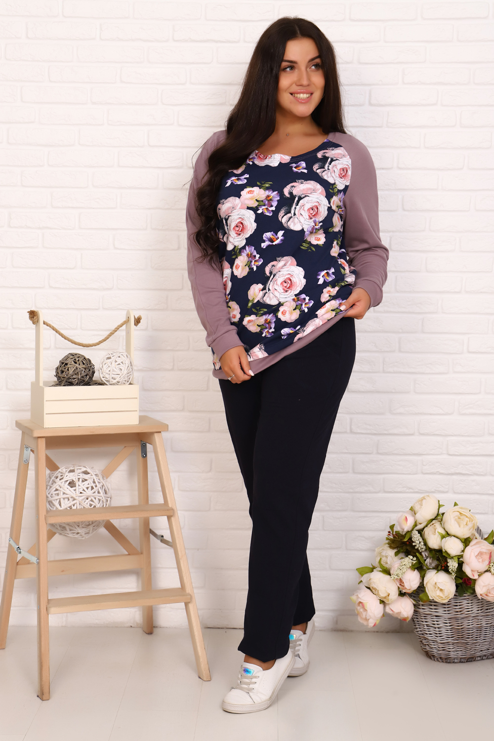 Туника женская, полочка и спинка из набивного футера двух нитки. Рукав реглан однотонный из интерлока качества пенье. Для дома и отдыха.