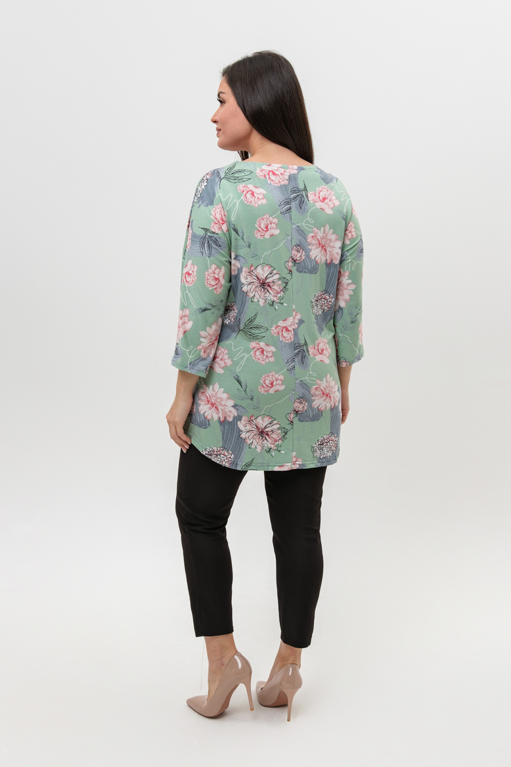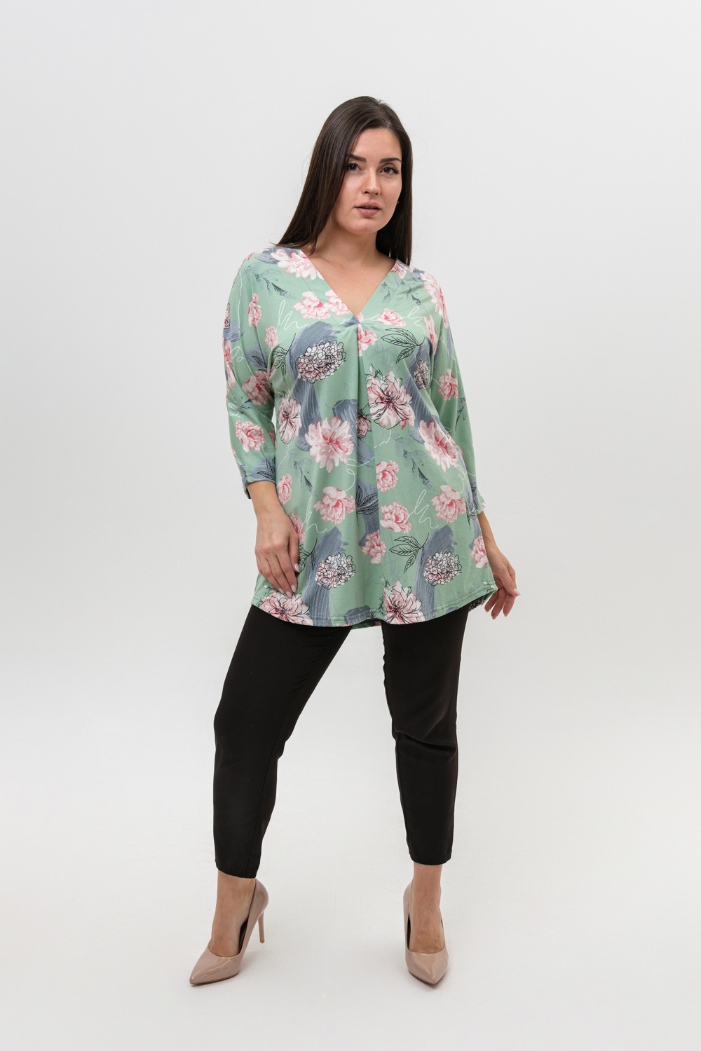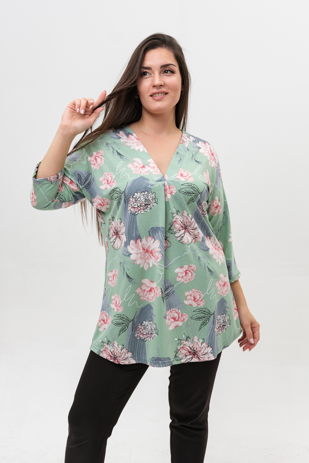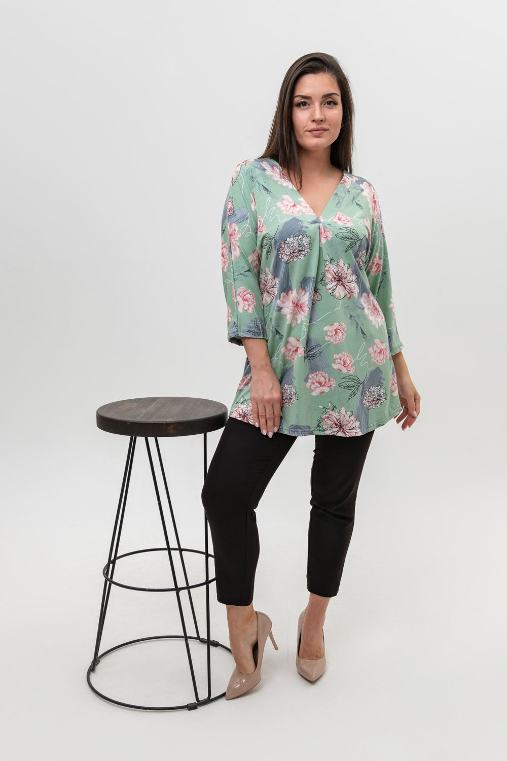 Туника женская со спущенным цельнокроеным рукавом длиной 3/4 выполнена из вискозы красивой, нежной расцветки. Горловина туники имеет V-образный вырез, обработана планкой, низ изделия немного расклешен. Ткань хорошего качества, при стирке не линяет, не дает усадку, сохраняет форму.