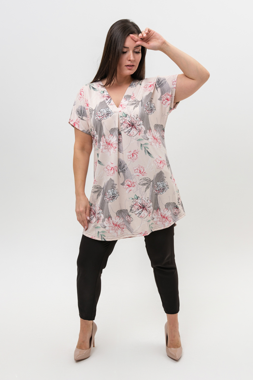 Туника женская со спущенным плечом выполнена из вискозы красивой нежной расцветки. Горловина с V-образным вырезом обработана планкой, низ изделия немного расклешен. Ткань при стирке не линяет, не дает усадки, сохраняет форму. Туника подойдет для прогулок, дома и отдыха.