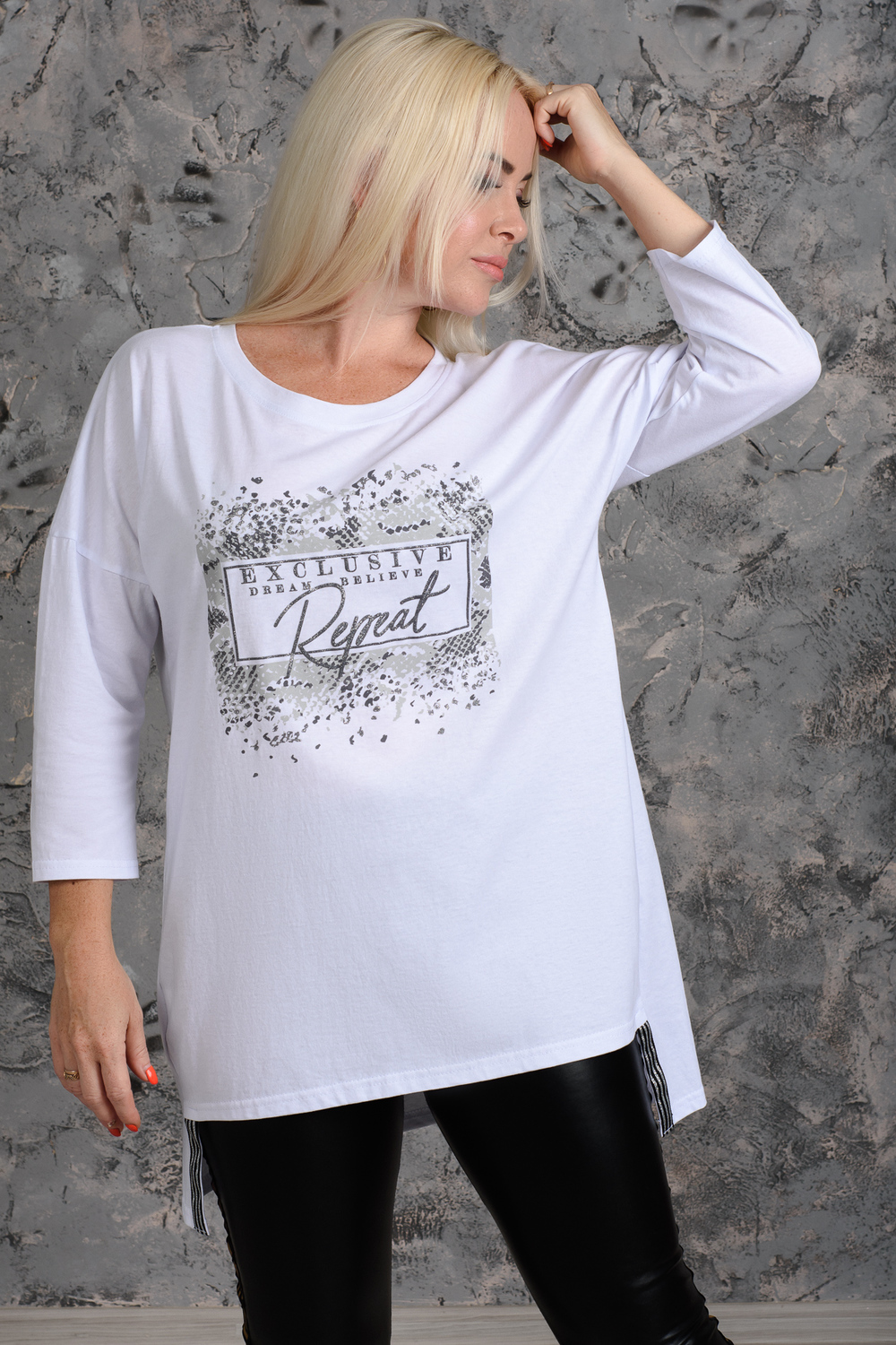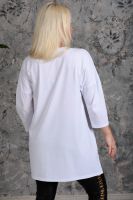 Туника женская. На полочке принт. По низу изделия отделка – тесьма.