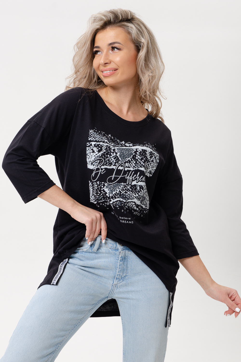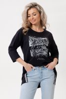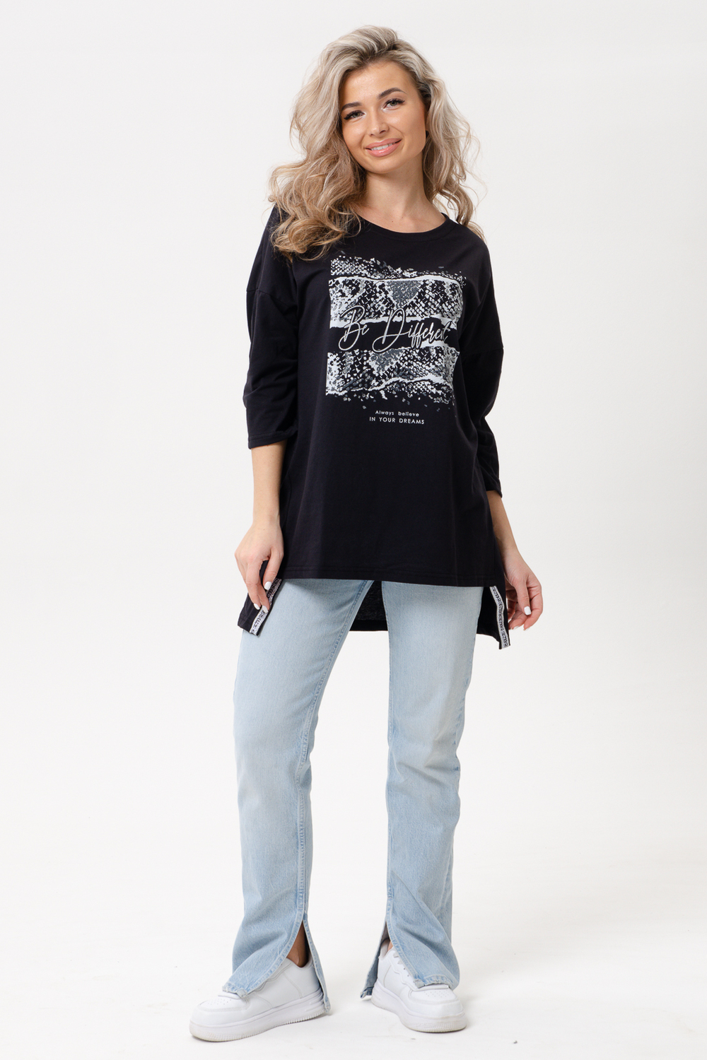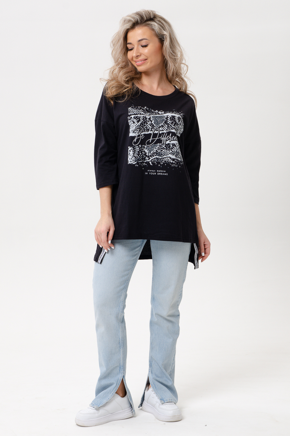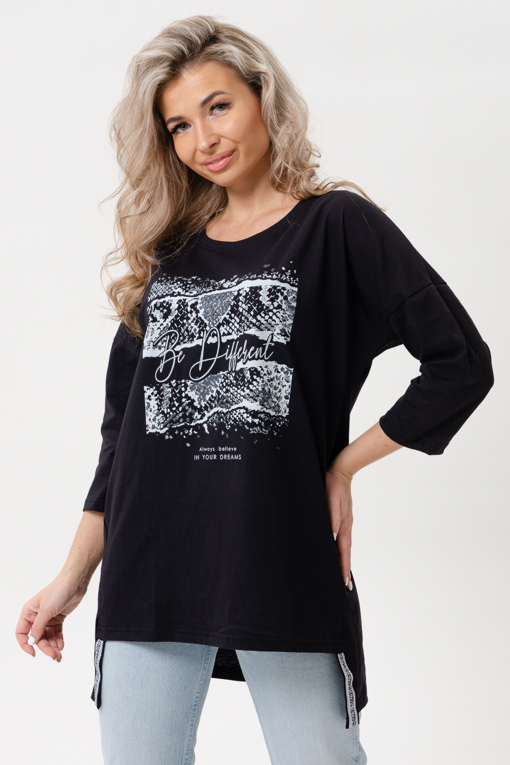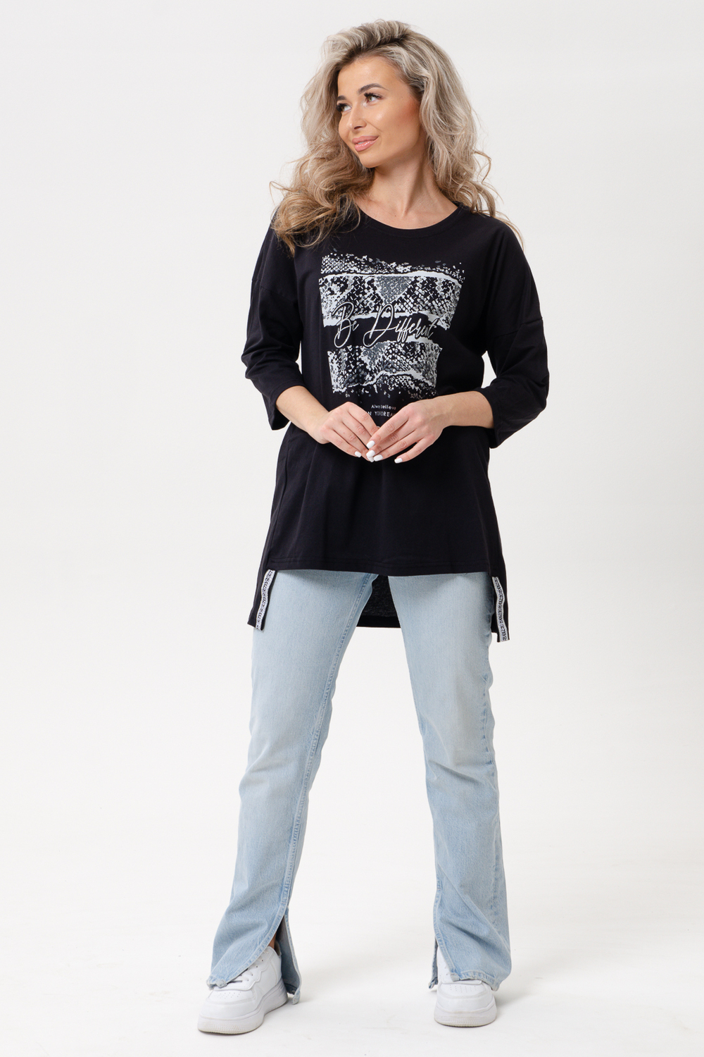 Туника женская. На полочке принт. По низу изделия отделка – тесьма.