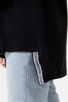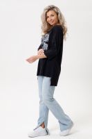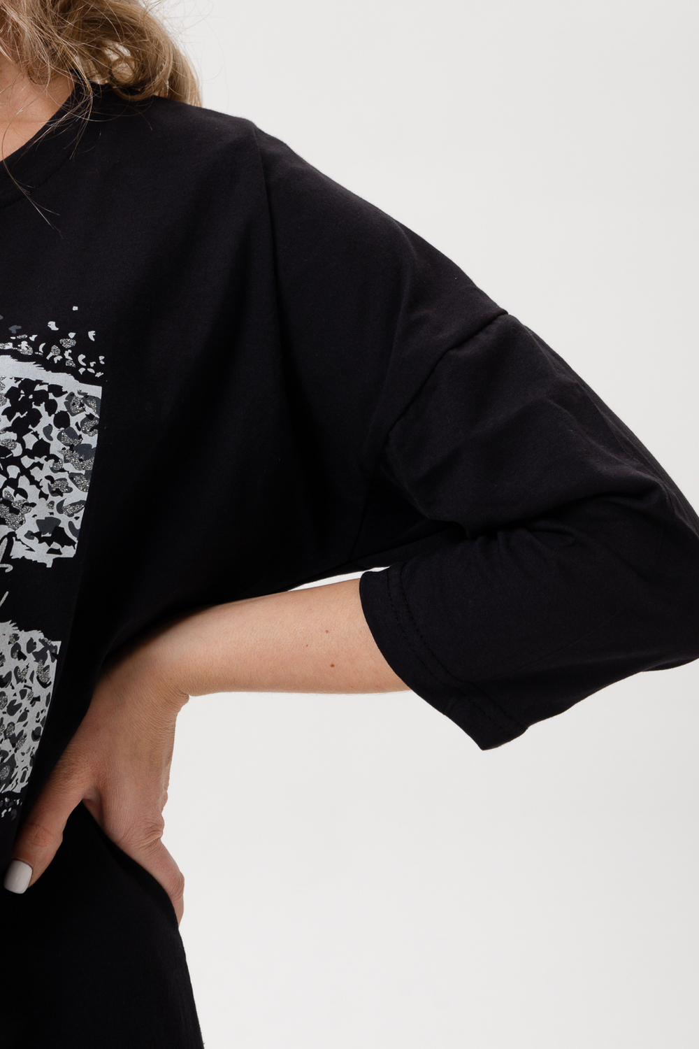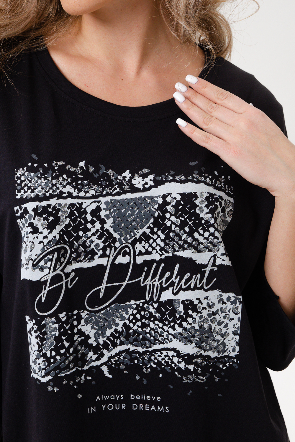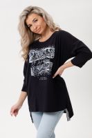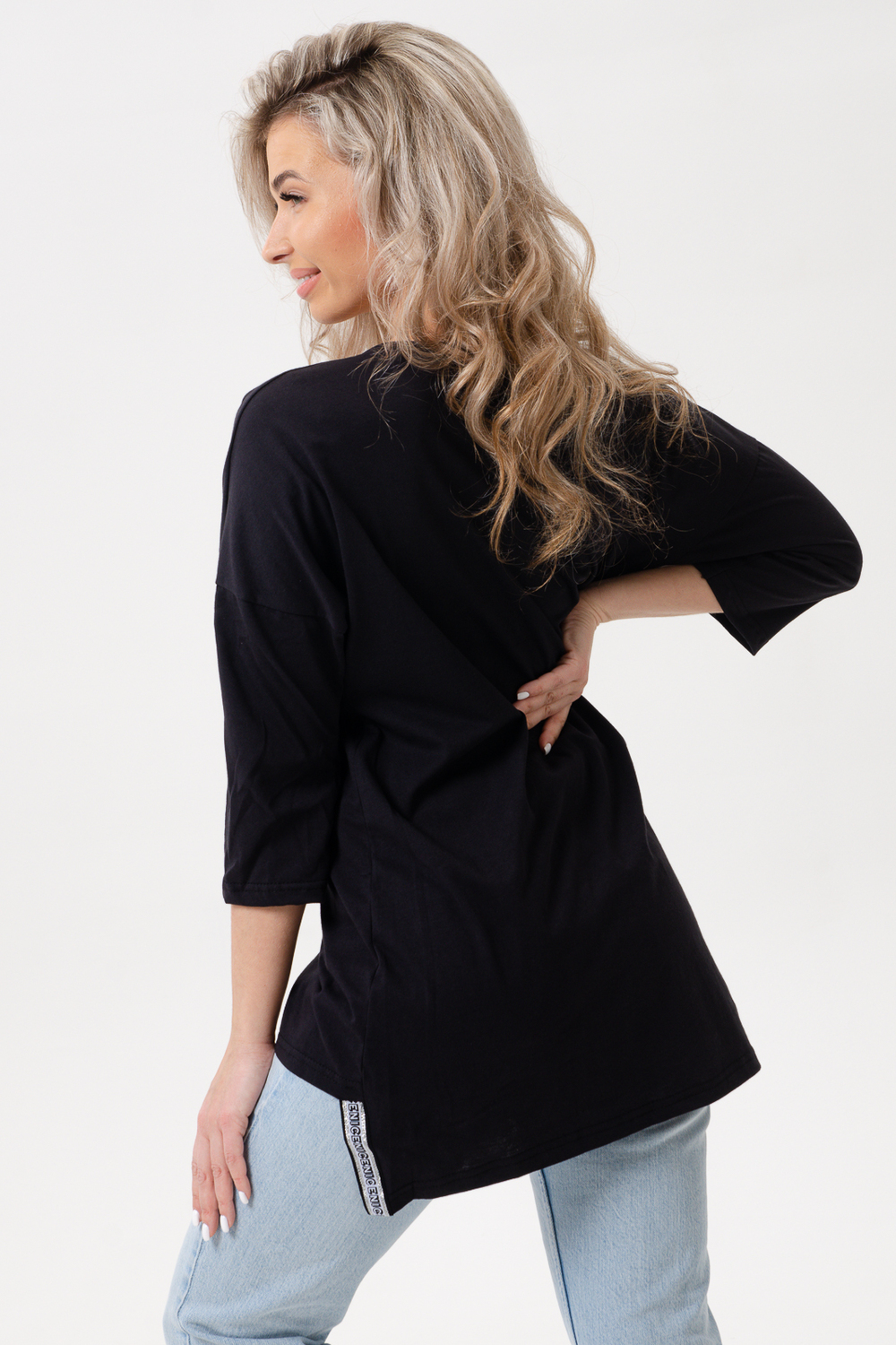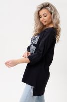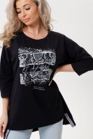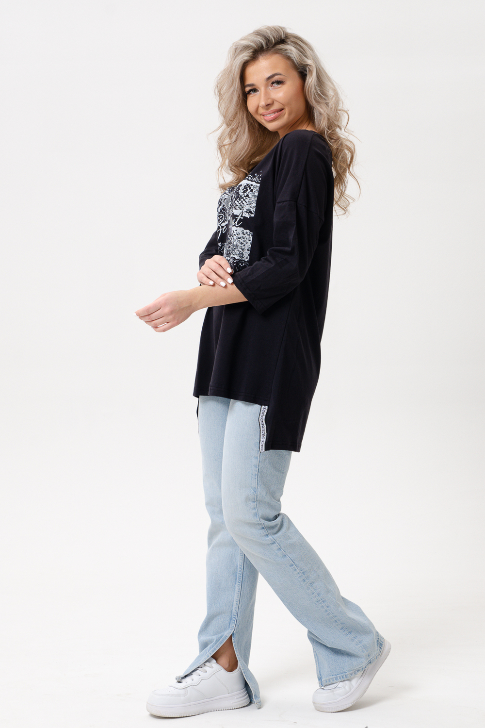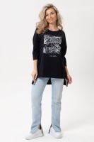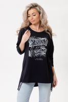 Туника женская. На полочке принт. По низу изделия отделка – тесьма.