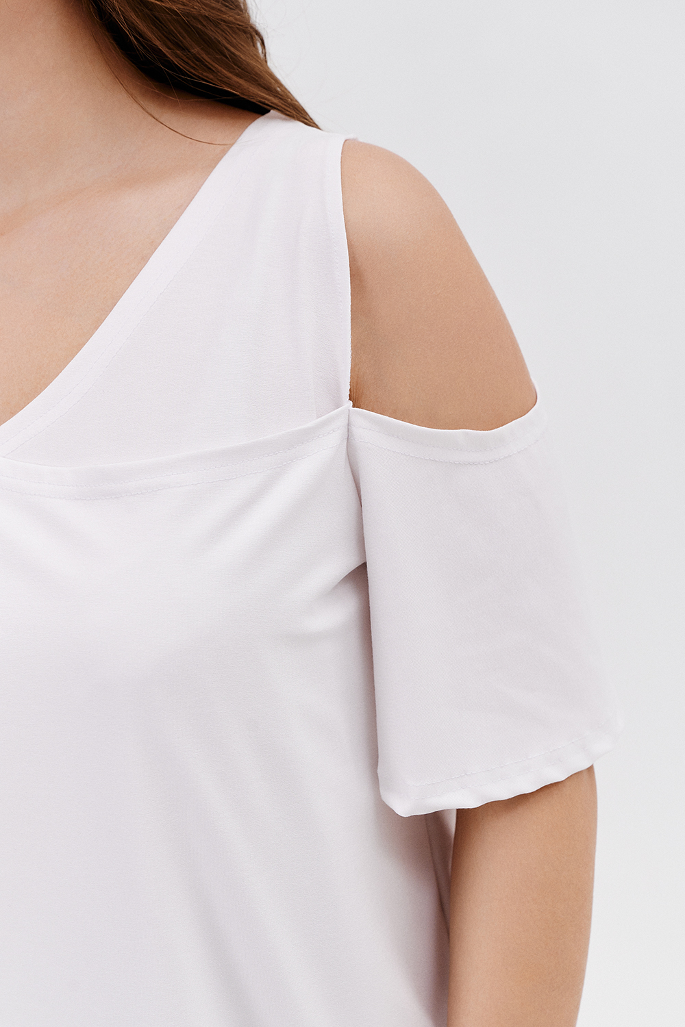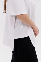 Дизайнерская женская блузка свободного кроя. Её можно носить как вечернюю или офисную, так же подойдет для жаркой погоды. Модель выполнена из приятной на ощупь дышащей ткани, не просвечивает. Особенностью блузки являются двойные полочка и спинка. Рукав с открытым плечом.