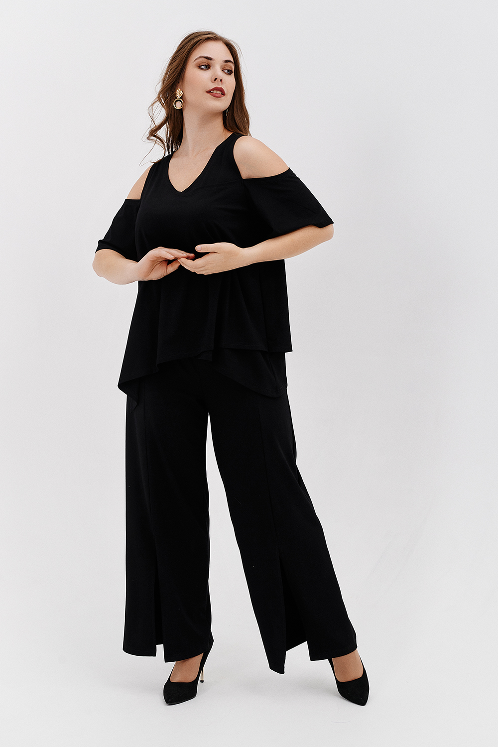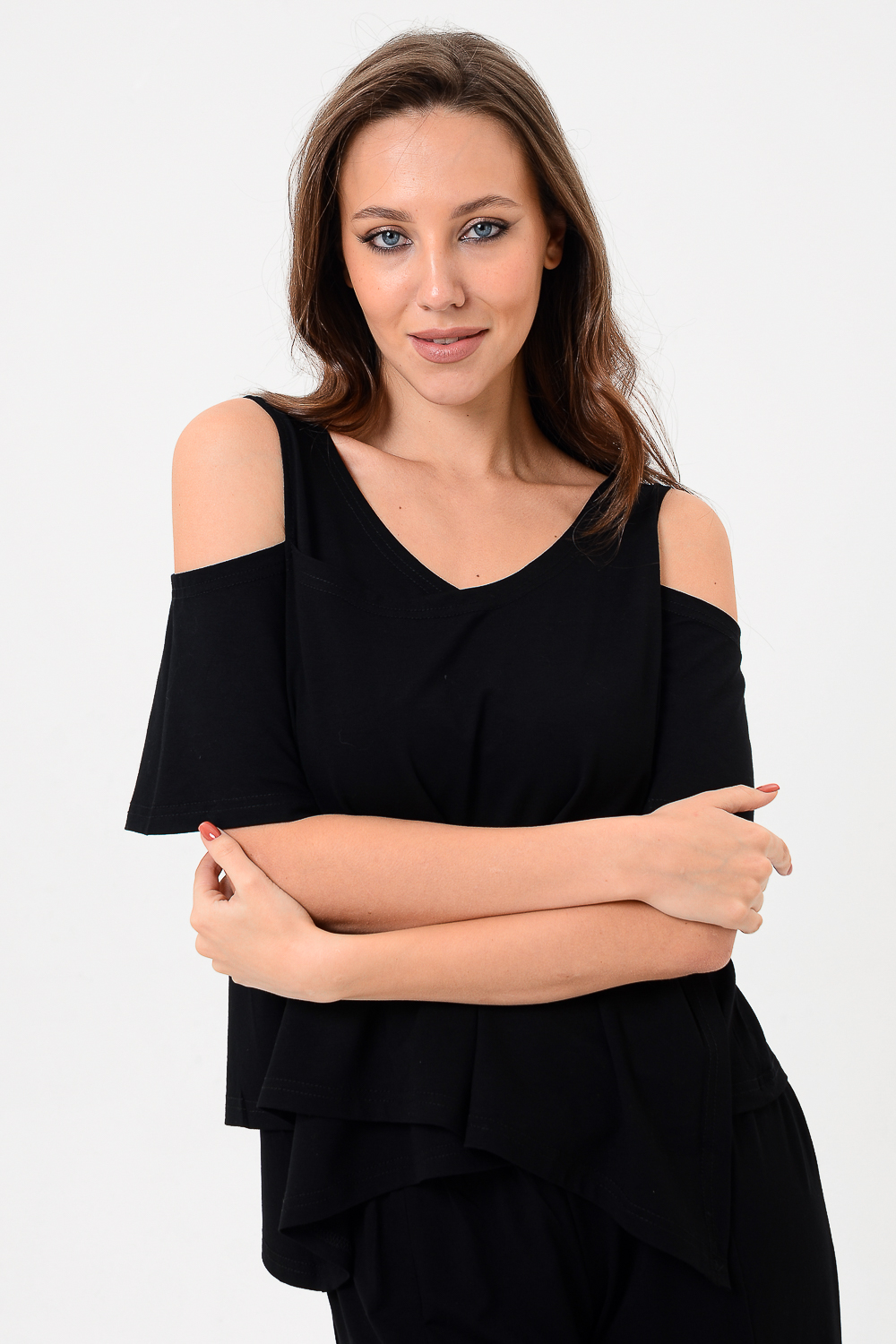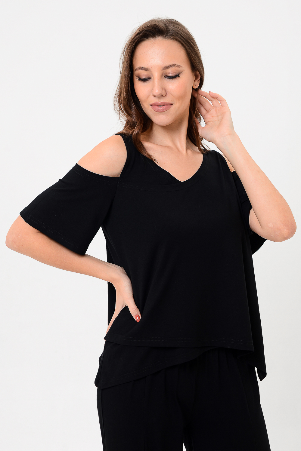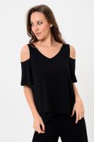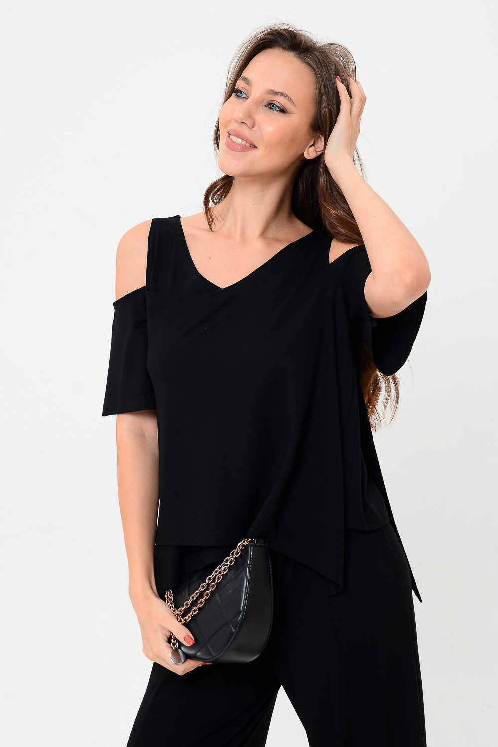 Дизайнерская женская блузка свободного кроя. Её можно носить как вечернюю или офисную, так же подойдет для жаркой погоды. Модель выполнена из приятной на ощупь дышащей ткани, не просвечивает. Особенностью блузки являются двойные полочка и спинка. Рукав с открытым плечом.