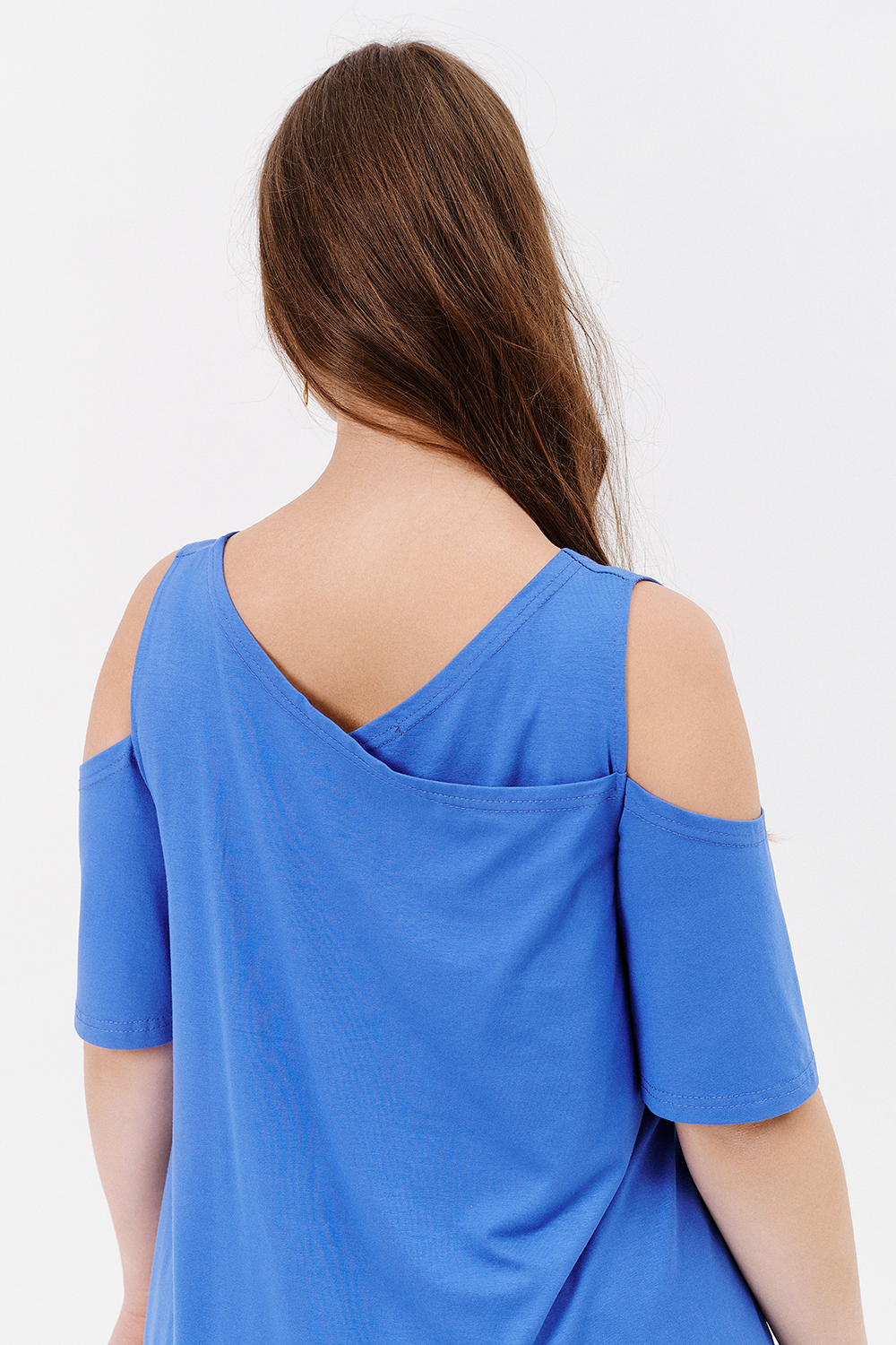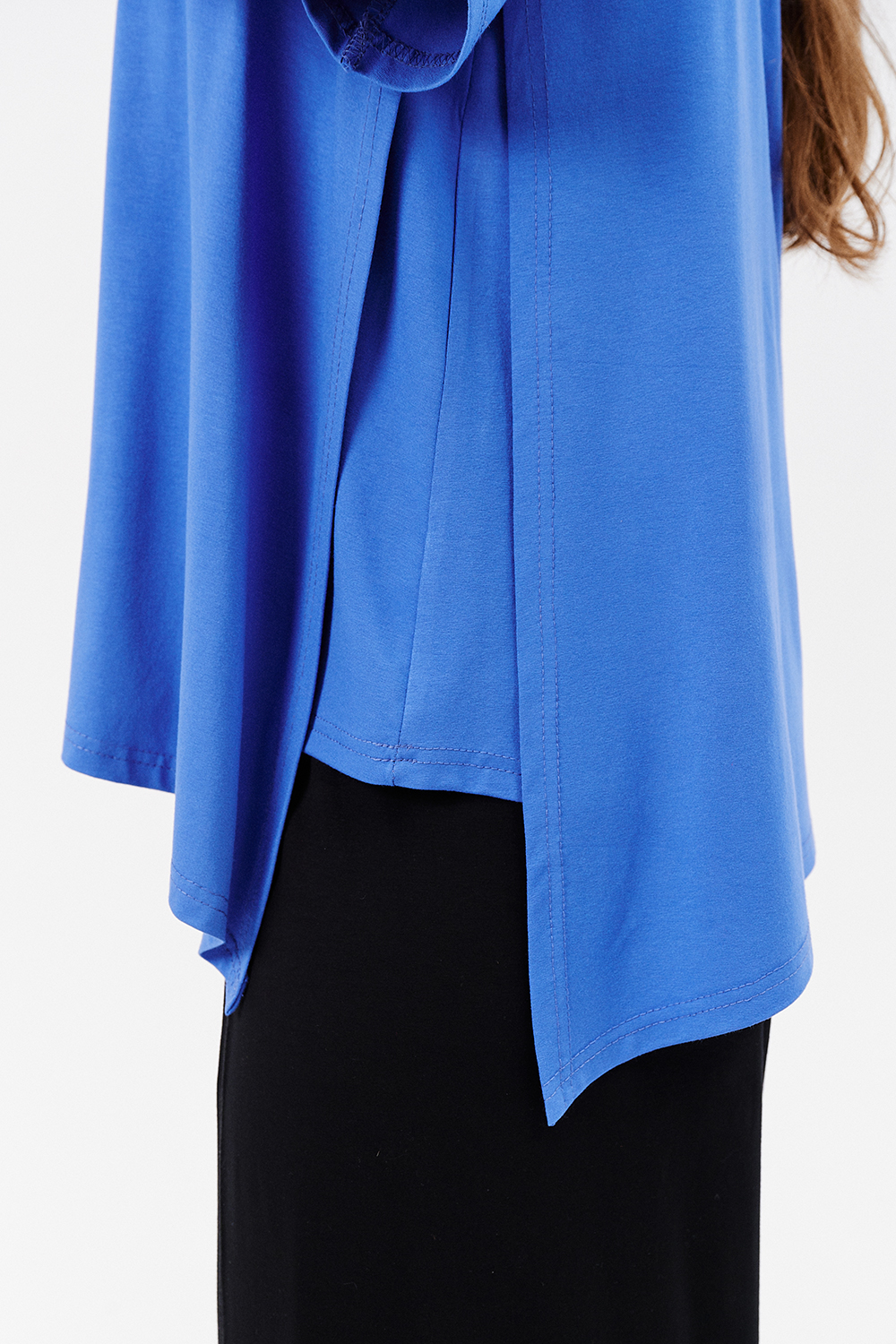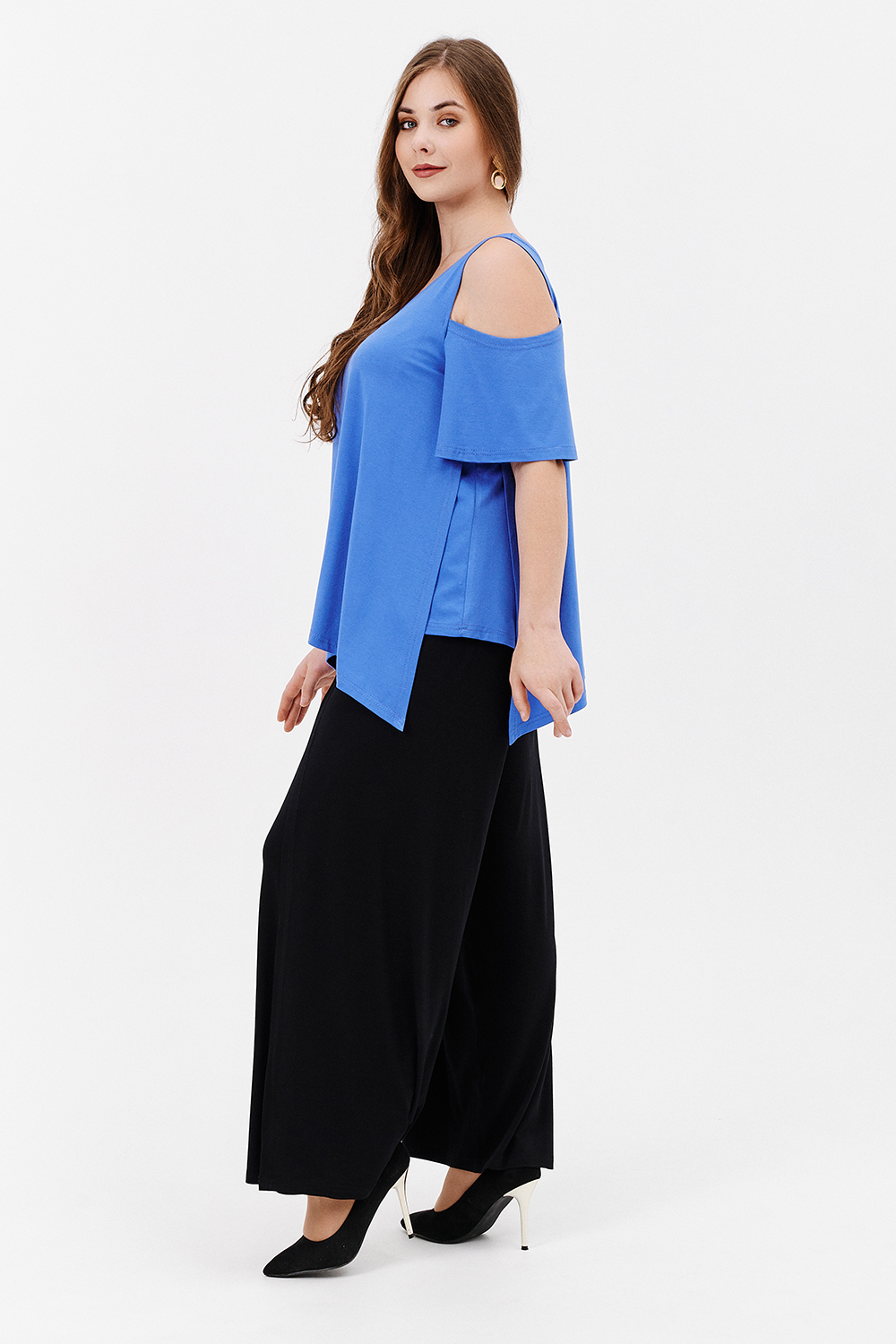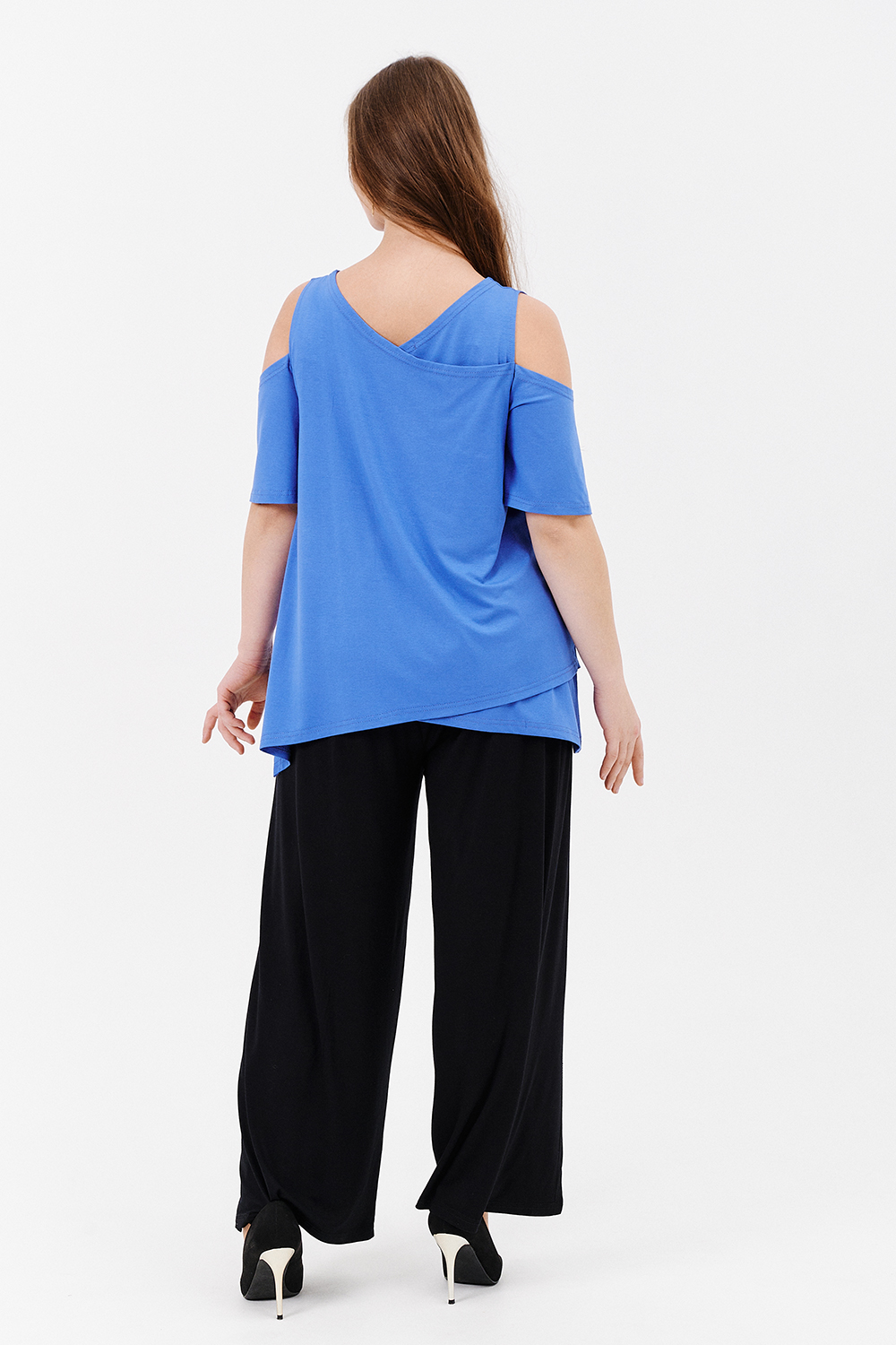 Дизайнерская женская блузка свободного кроя. Её можно носить как вечернюю или офисную, так же подойдет для жаркой погоды. Модель выполнена из приятной на ощупь дышащей ткани, не просвечивает. Особенностью блузки являются двойные полочка и спинка. Рукав с открытым плечом.