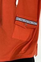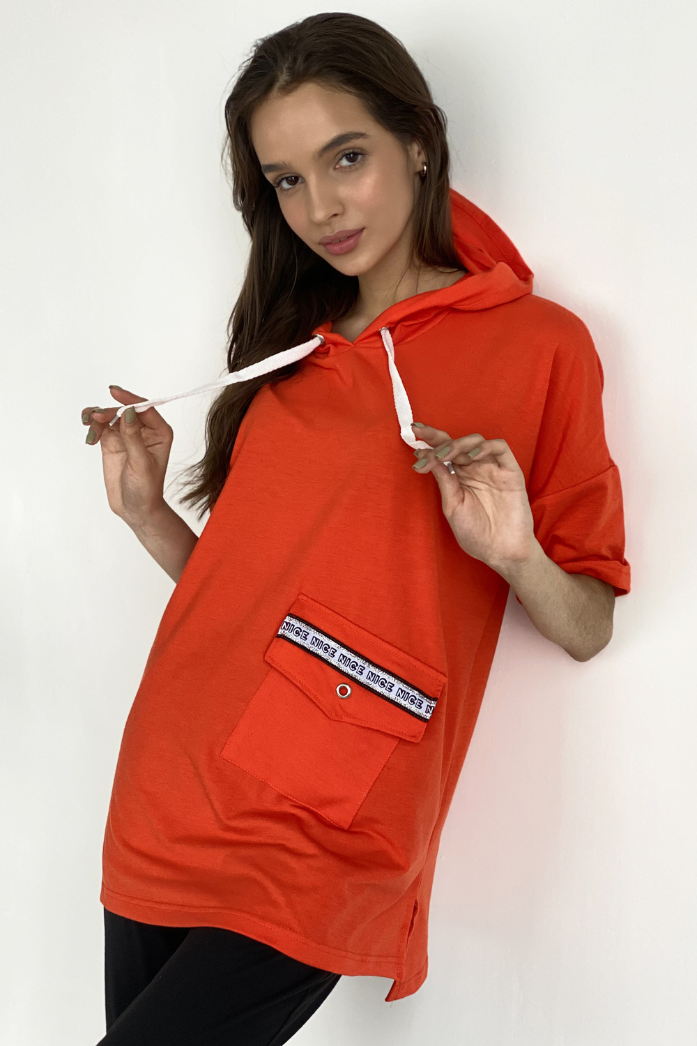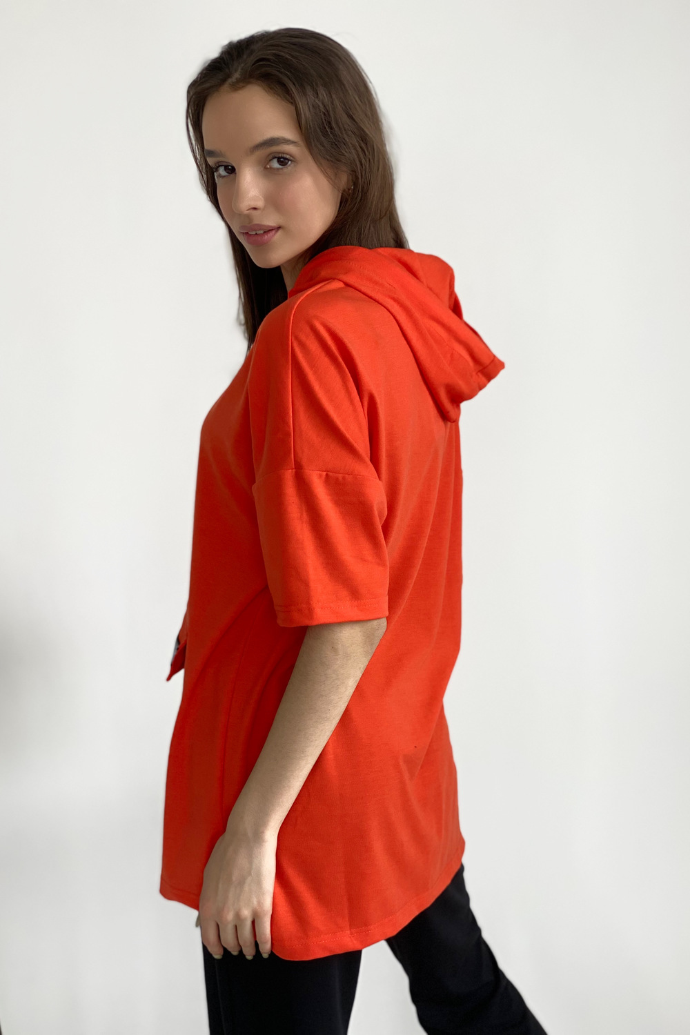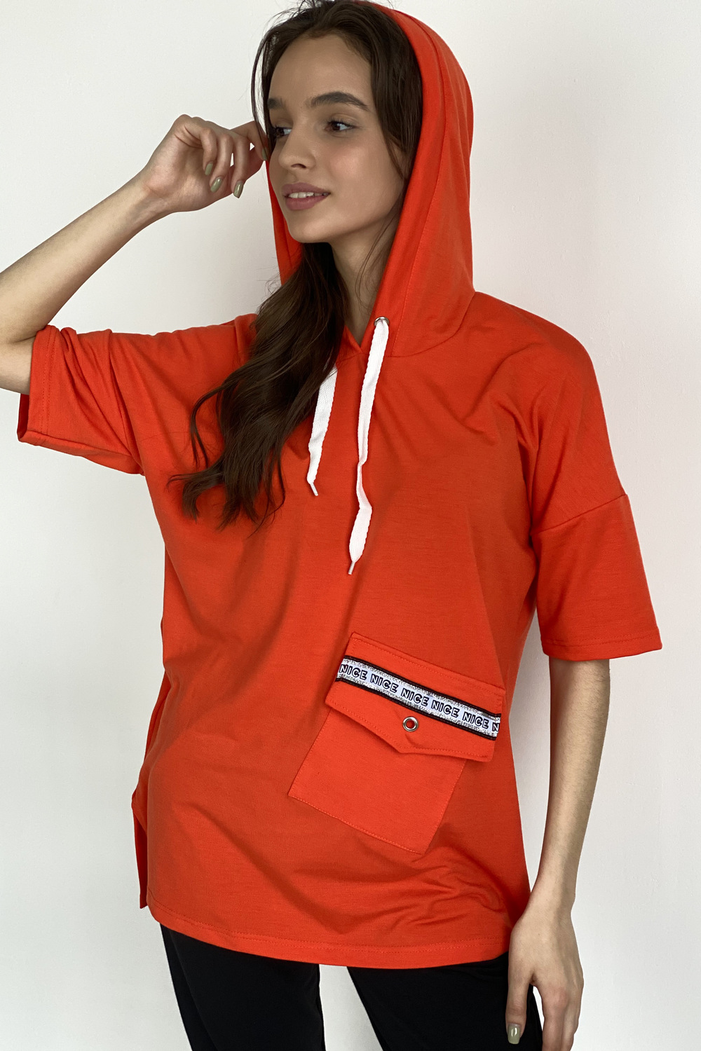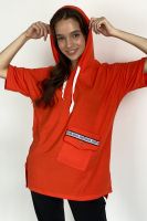 Туника прямая, свободная, с капюшоном, с удлиненной спинкой. Рукав короткий. На полочке расположен накладной карман с клапаном. В нижней части боковых швов обработаны разрезы.