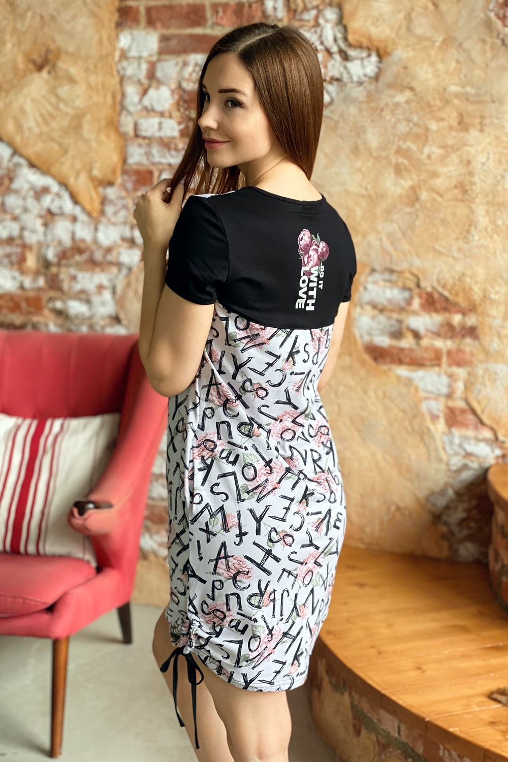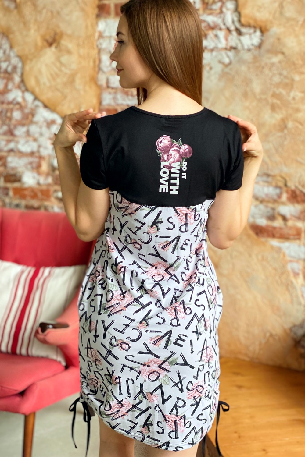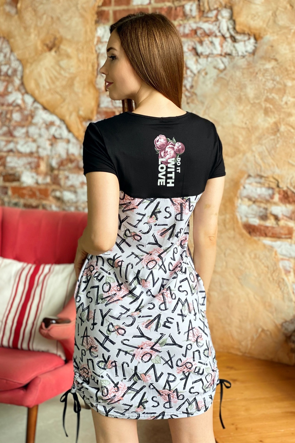 Туника полуприлегающего силуэта, с боковыми карманами, средней длины, с V-образной горловиной. Рукав втачной. На спинке расположена кокетка из отделочного полотна. В нижней части боковых швов обработаны разрезы со шнурами-стяжками. Горловина и низ рукавов обработаны бейкой из отделочного полотна.